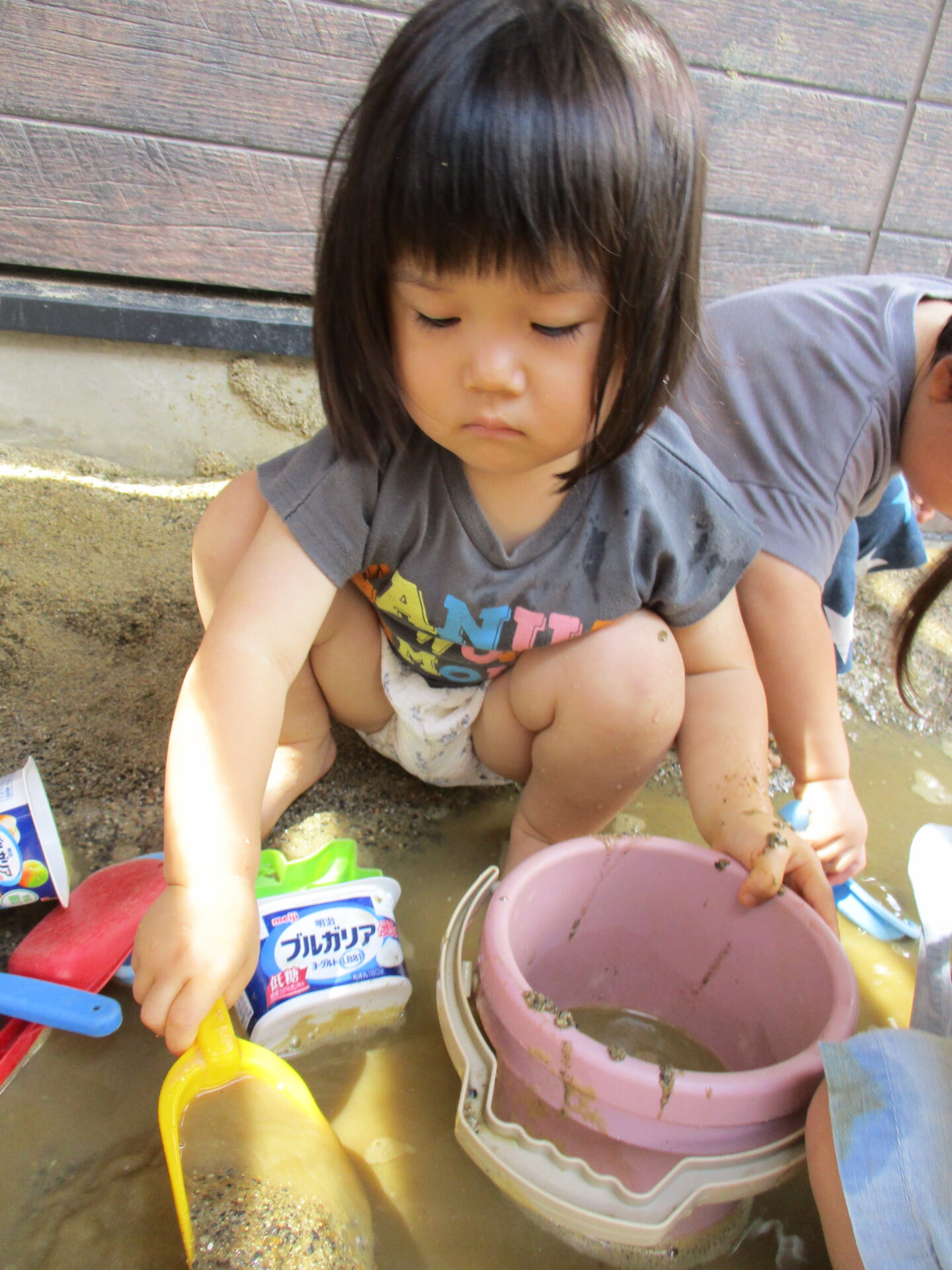 いつもの砂遊びも楽しいけれど、水が加わり「チャプチャプ!!」と言いながら夢中で遊びます😊