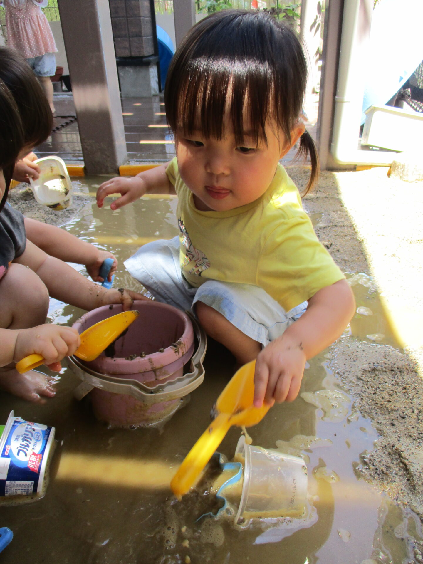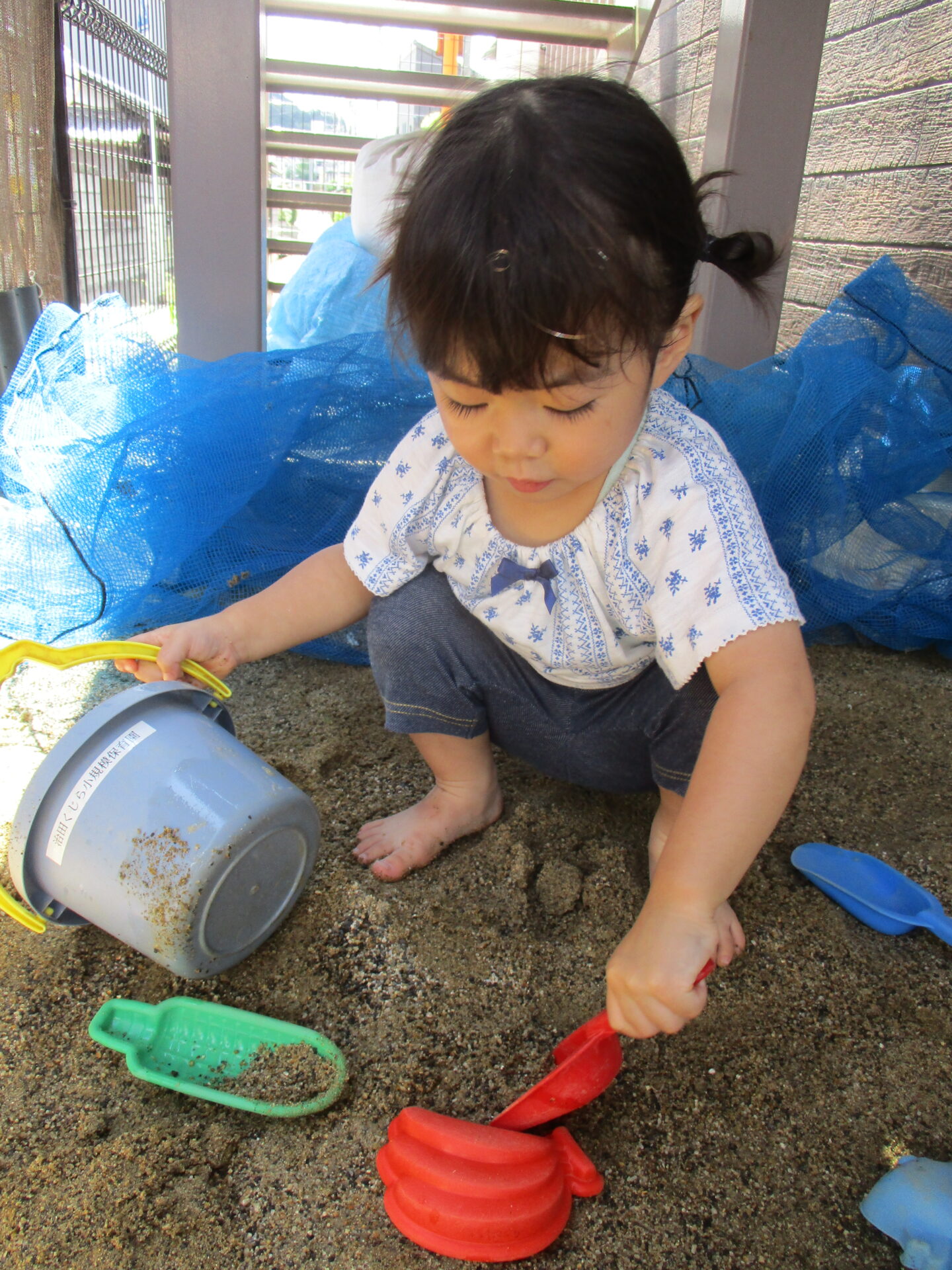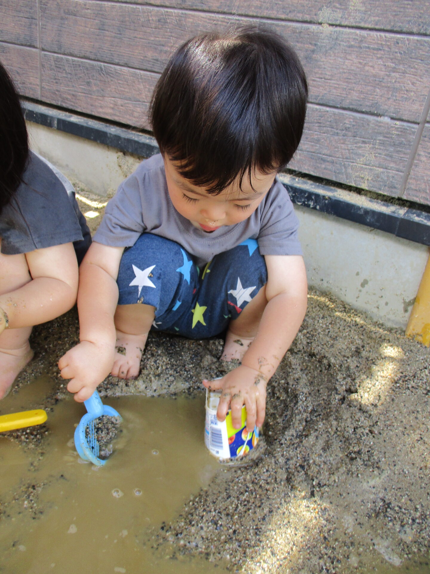 泥んこコーナーでは、裸足でひんやりした砂の感触を感じながら、大好きな砂遊びが始まりました🎵