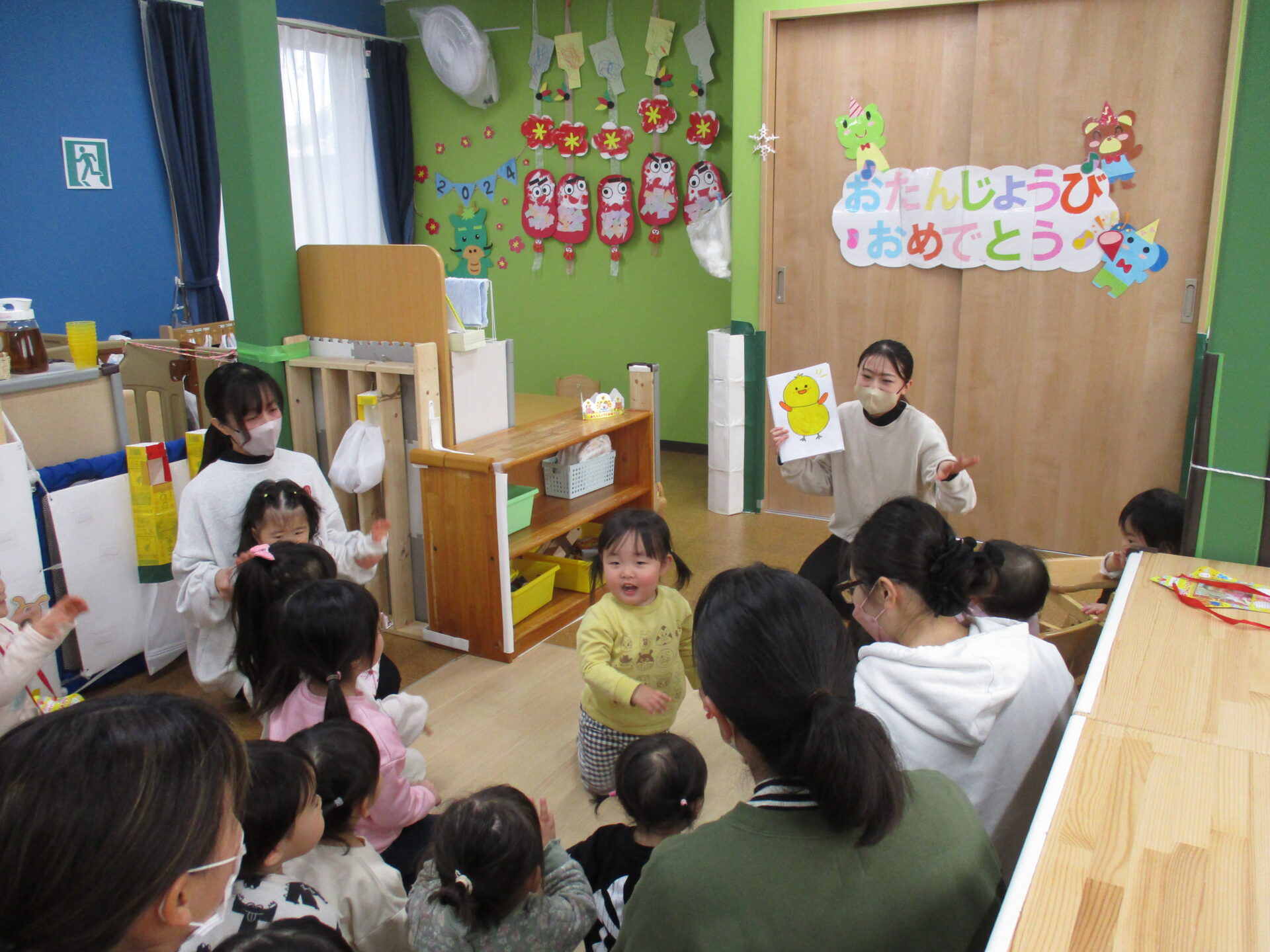 様々な模様の卵から、歌に合わせてひよこやかえる、うさぎ等知っている生き物が登場し、大喜びのみんなでした(⌒∇⌒)💕