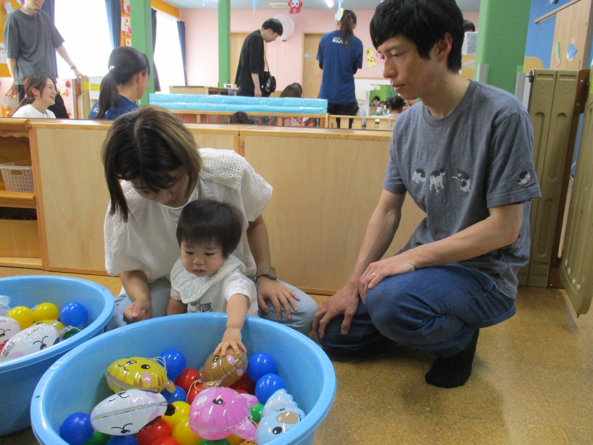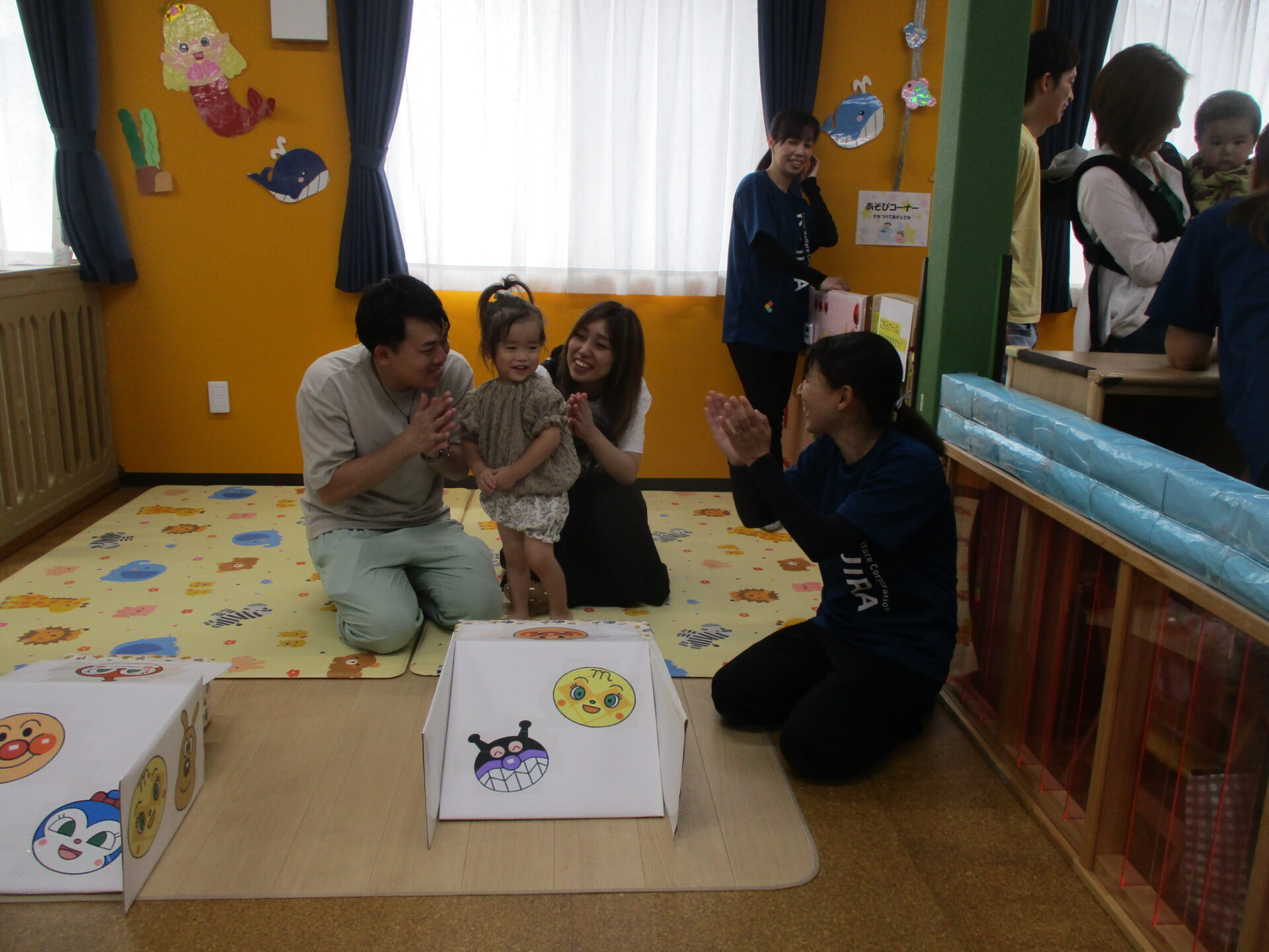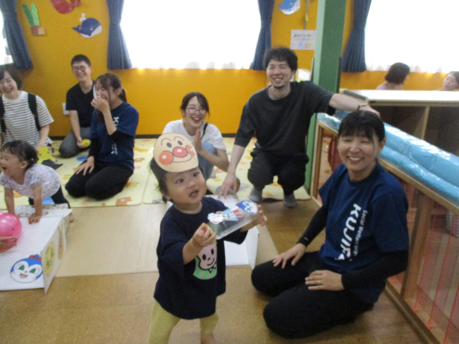 今回は、前半(1歳児だいちチーム)、後半(2歳児あめチーム)に分かれ、親子でご参加いただきました(⌒∇⌒)💓(0歳児うみチームさんは好きなタイミングで参加)いつもと違う雰囲気に始めはドキドキした様子のお友だちも、しばらくすると大好きなお家の方と一緒に遊びに参加し、可愛い笑顔が溢れていました🥰