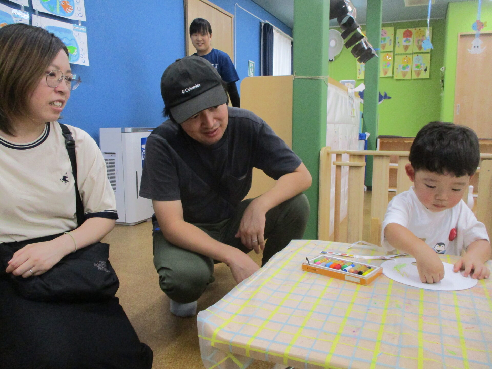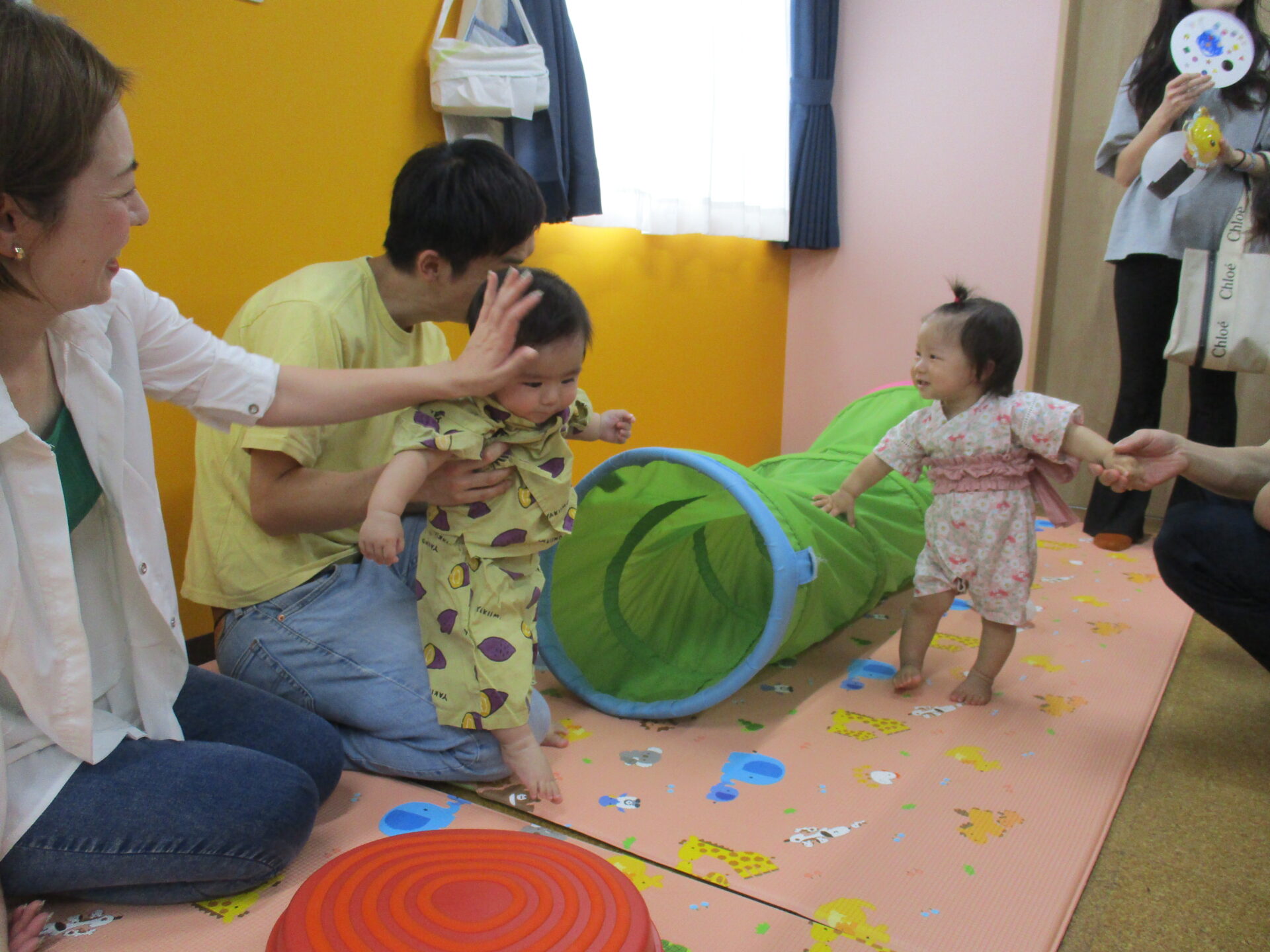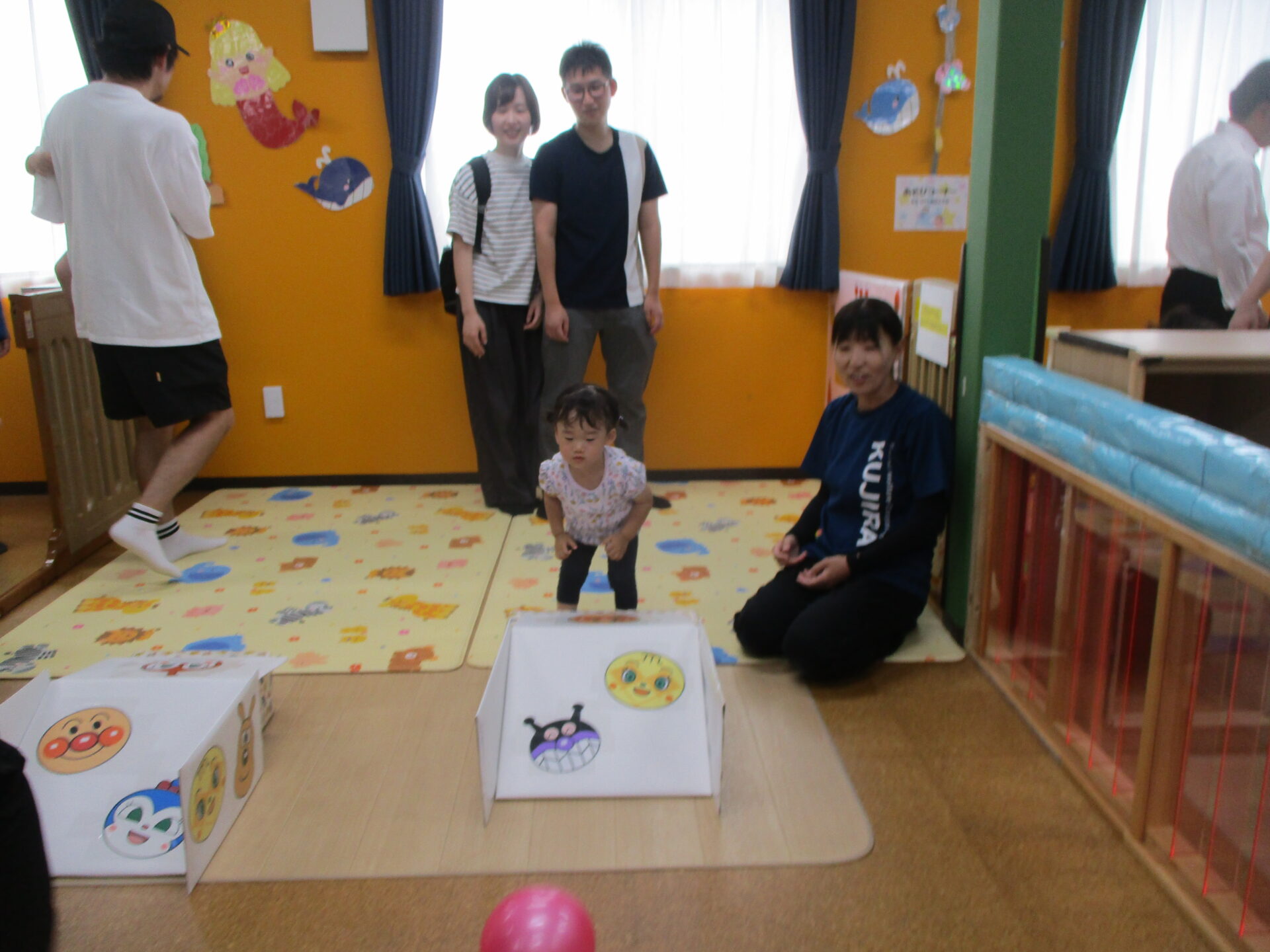 今回は、前半(1歳児だいちチーム)、後半(2歳児あめチーム)に分かれ、親子でご参加いただきました(⌒∇⌒)💓(0歳児うみチームさんは好きなタイミングで参加)いつもと違う雰囲気に始めはドキドキした様子のお友だちも、しばらくすると大好きなお家の方と一緒に遊びに参加し、可愛い笑顔が溢れていました🥰