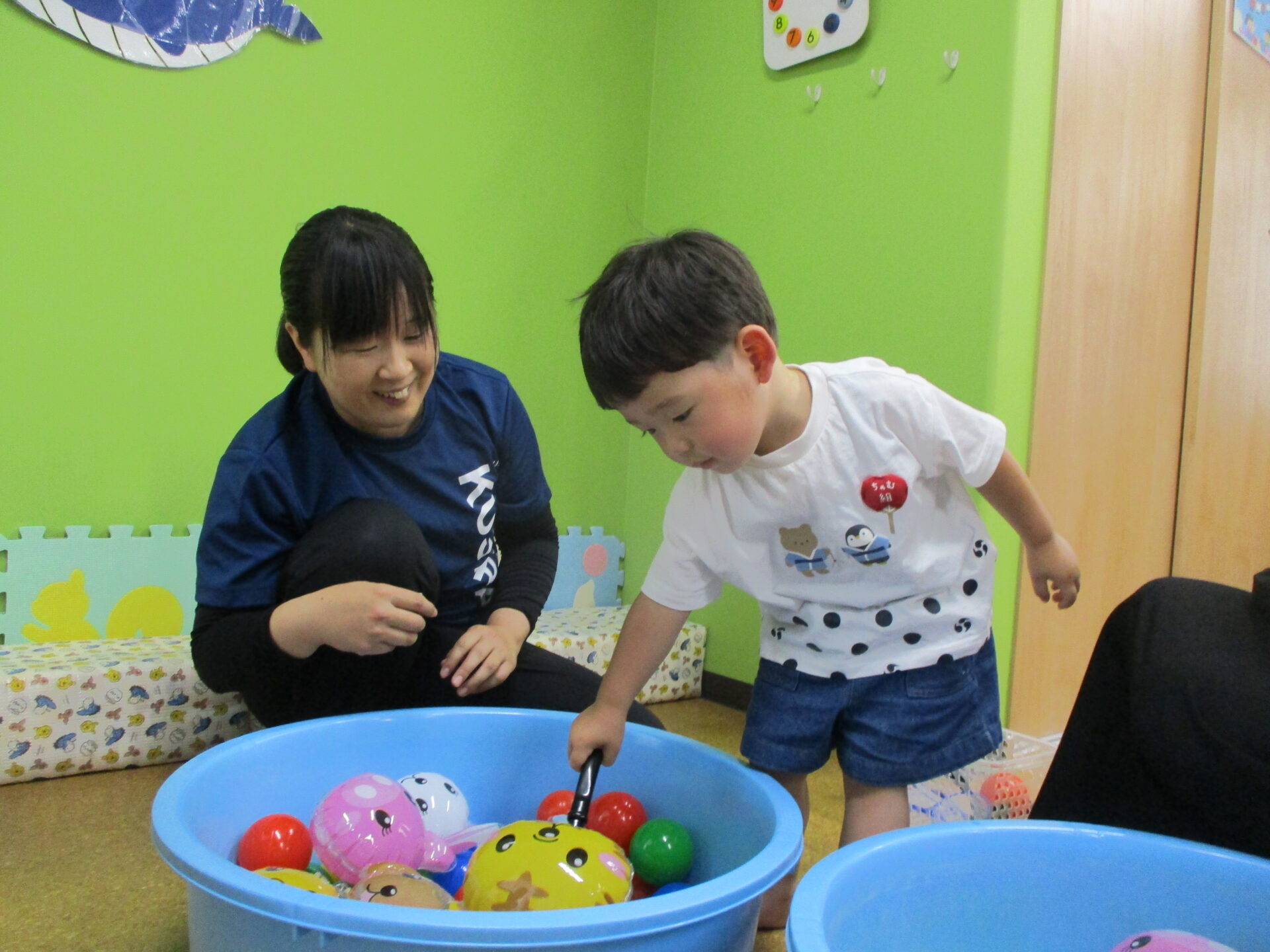 ままごとのお玉を使って動物のヨーヨーをすくいます(⌒∇⌒)✨