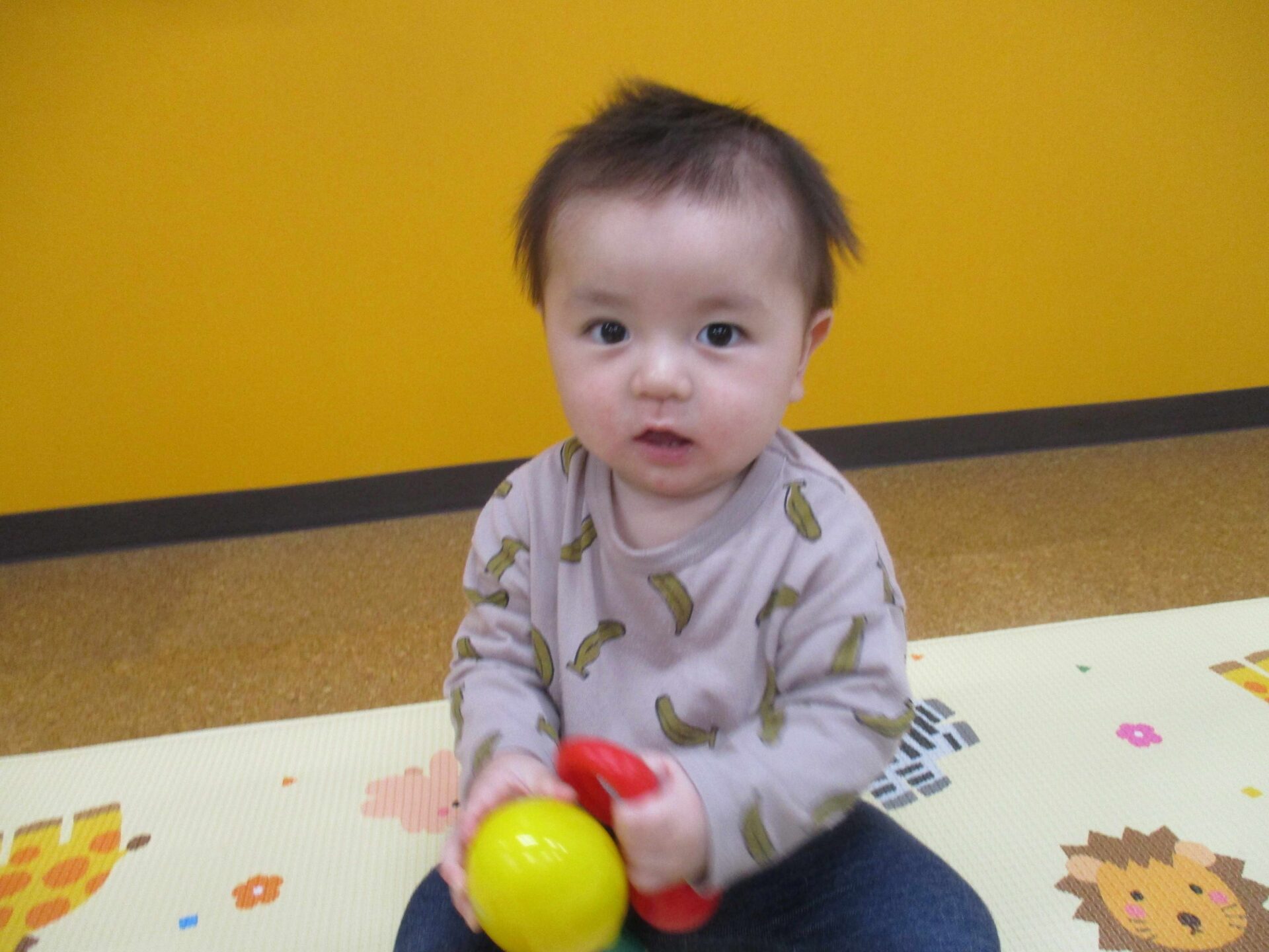 部屋をハイハイで探索し、気になる玩具を手に取って遊んでいます✨