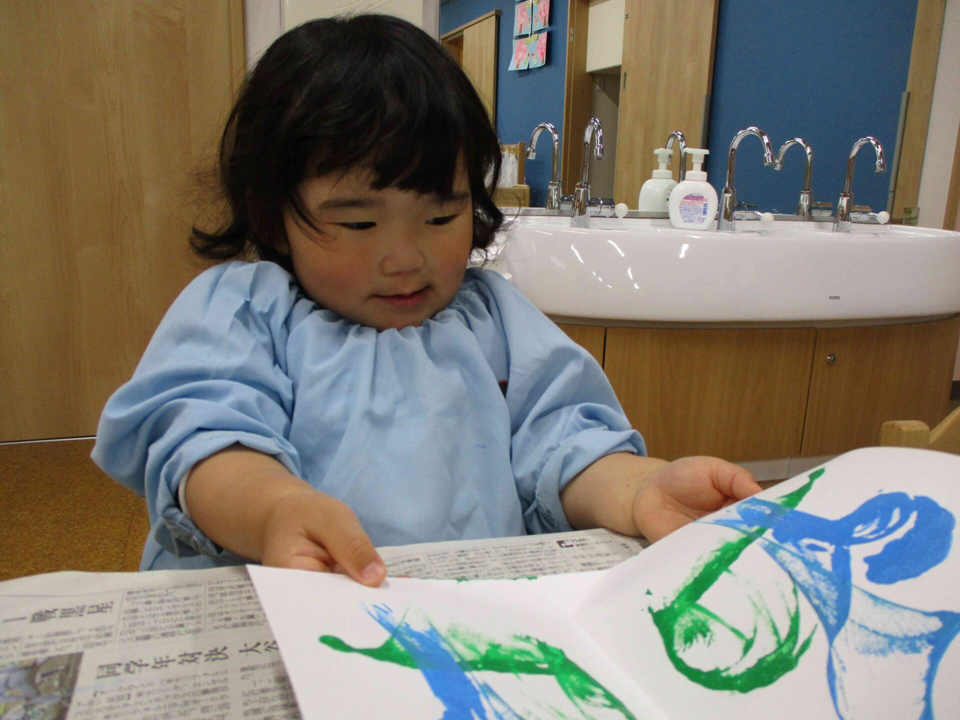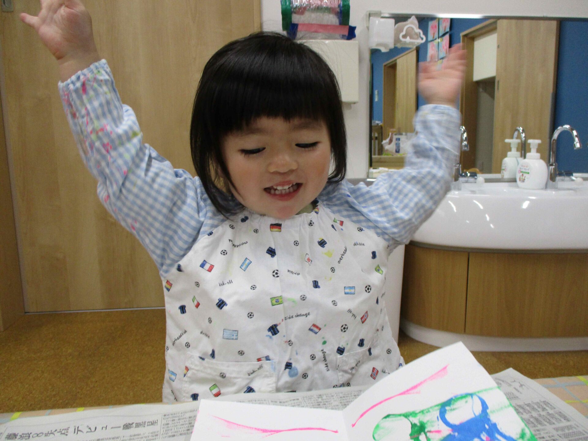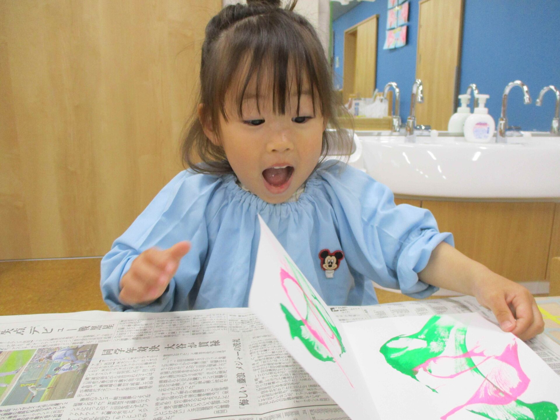 たこ糸が上手に画用紙から抜けたね👌✨何色かの絵の具で楽しみ、いよいよどんな模様になったか開いてみます🎵
