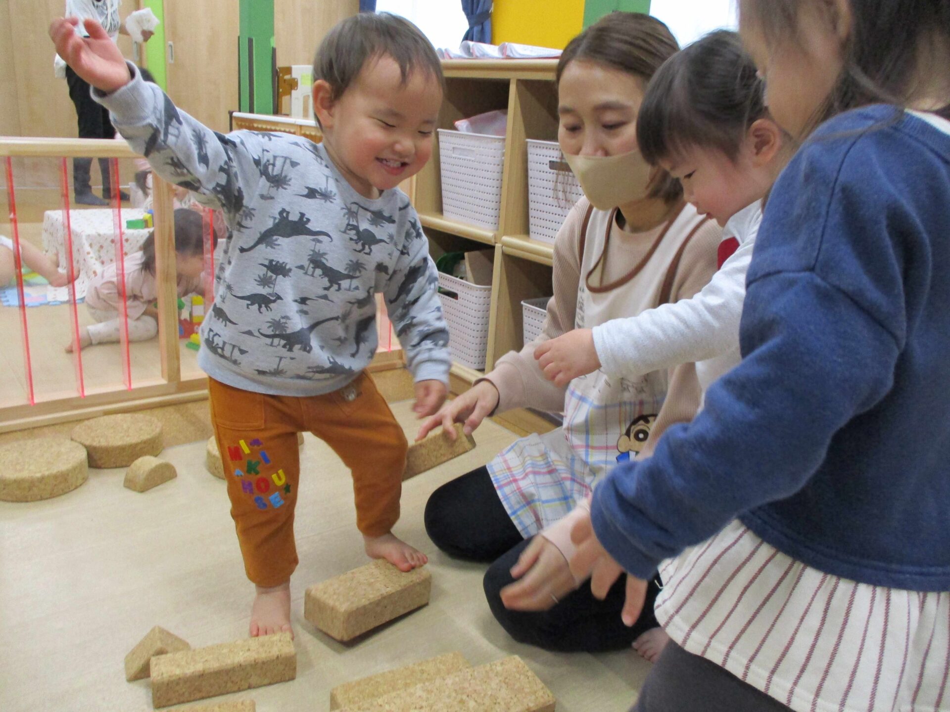 積み木を並べたり摘んだりして道を作り、その上を歩くことを楽しんでいました(⌒∇⌒)