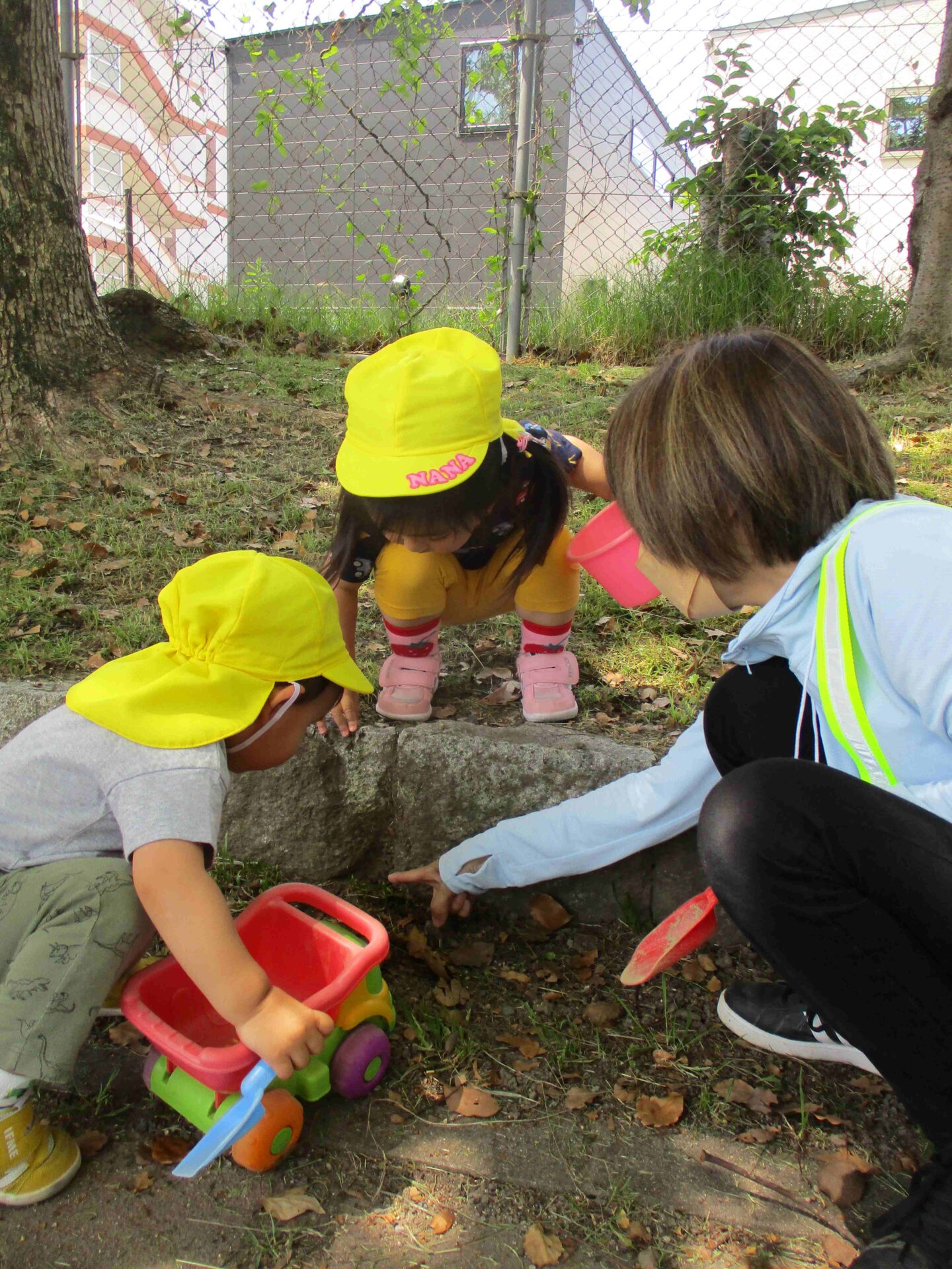 「ここにダンゴムシがいるよ」と保育者が声をかけると「どこ?」と子ども達が集まってきました☺