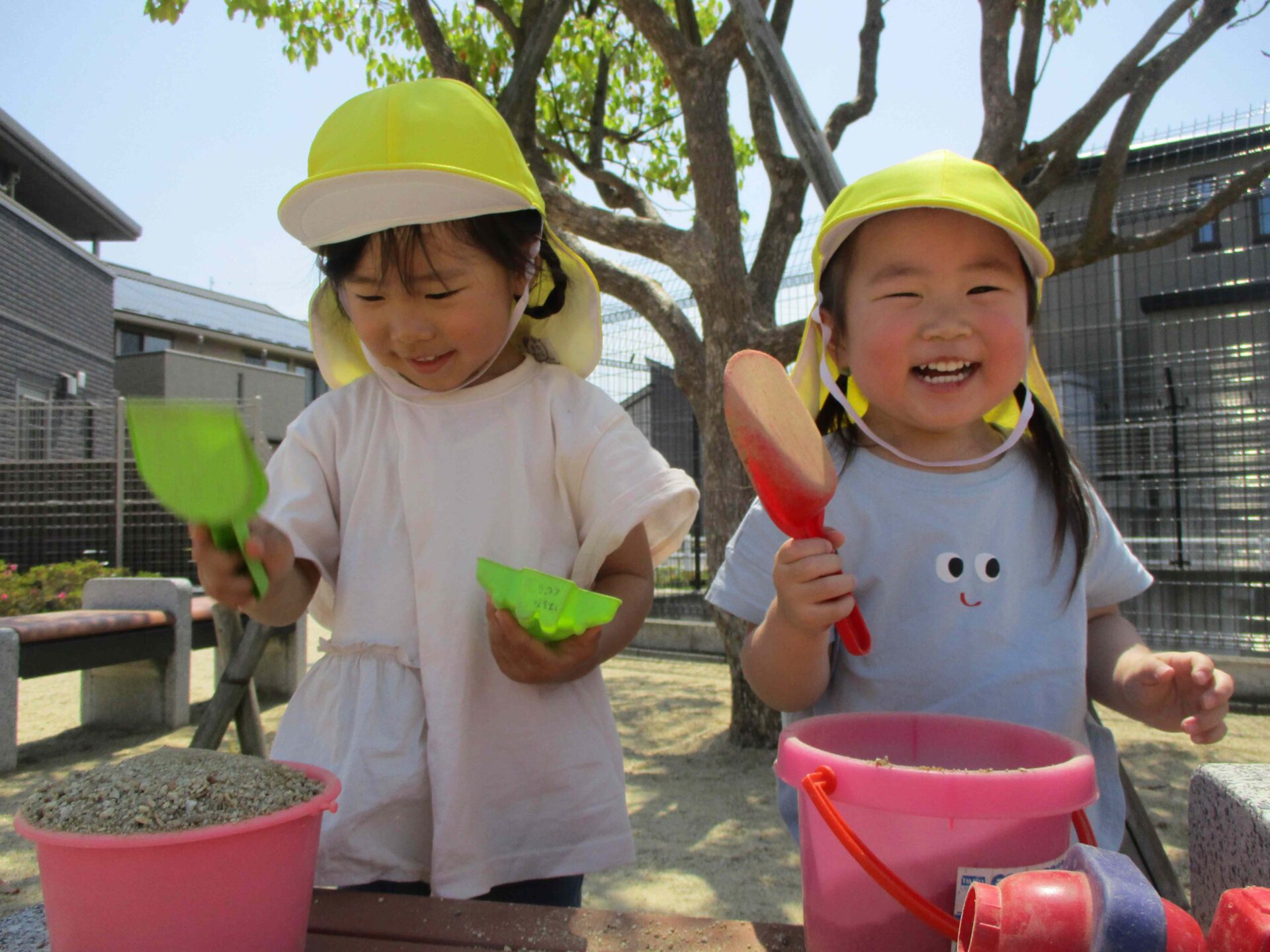 「滑り台やブランコはお日さまで熱くなっているから、涼しい場所であそぼうね」と保育者が話すと、