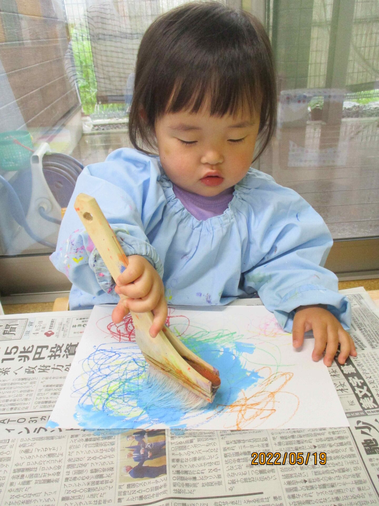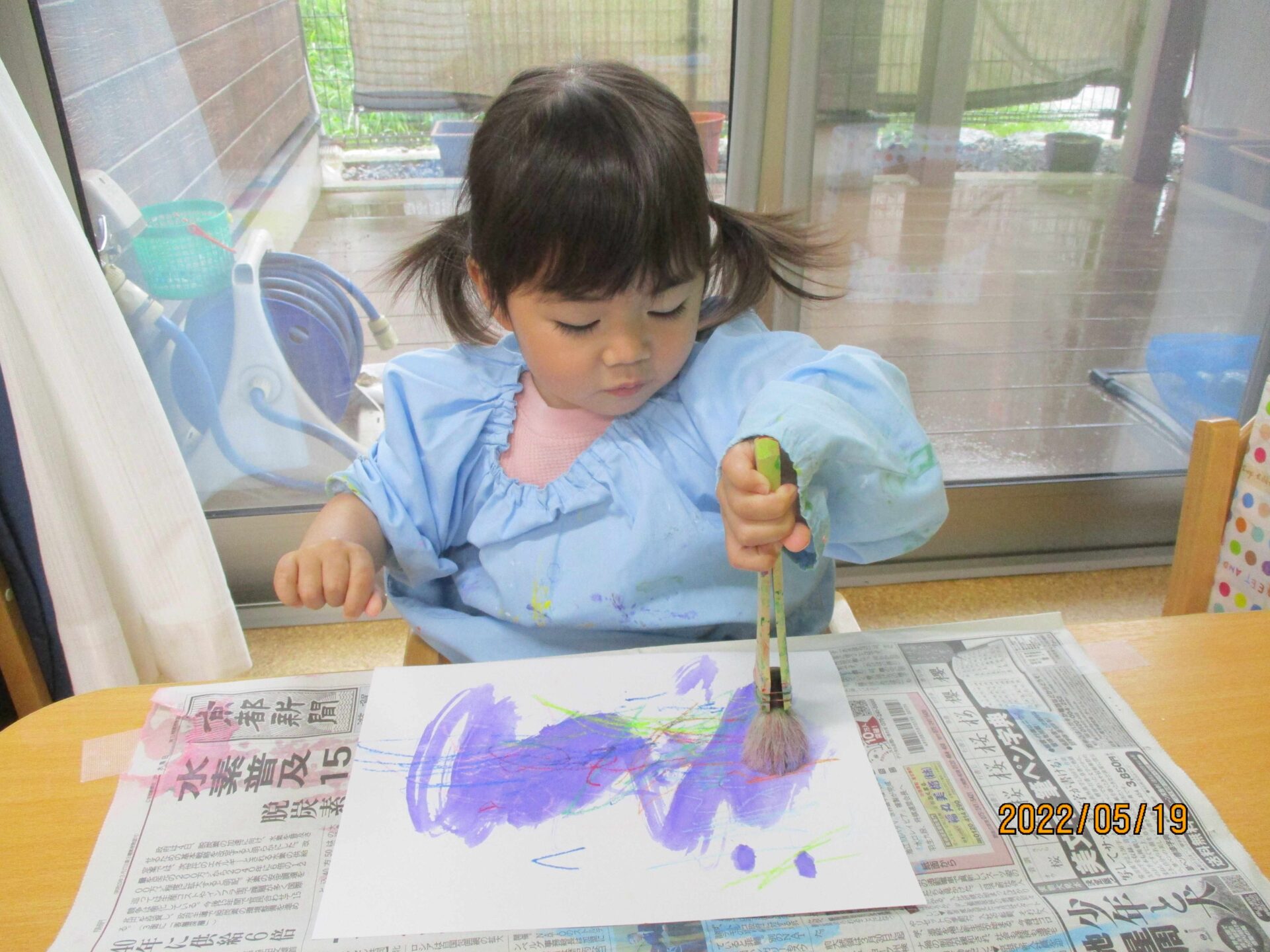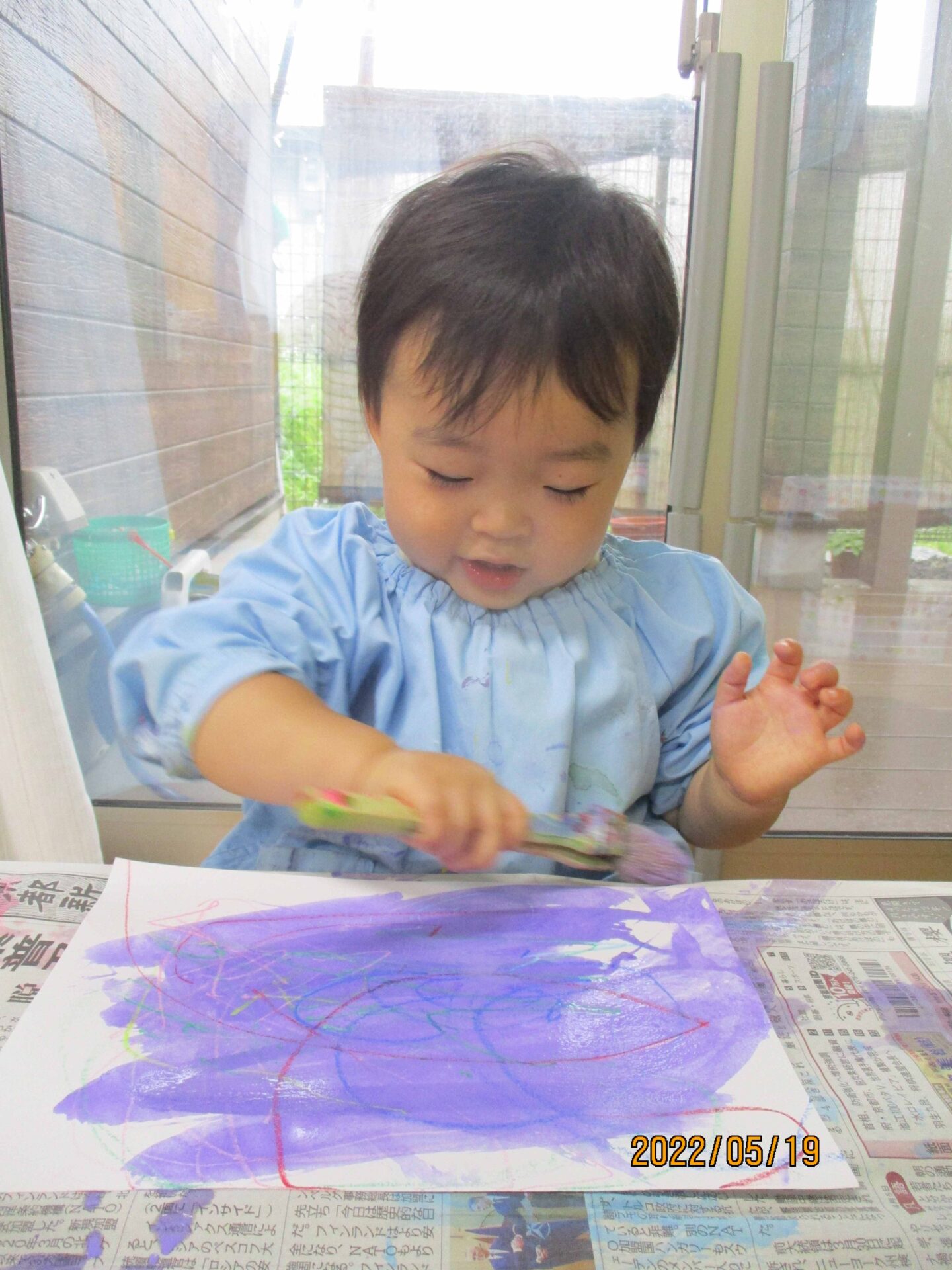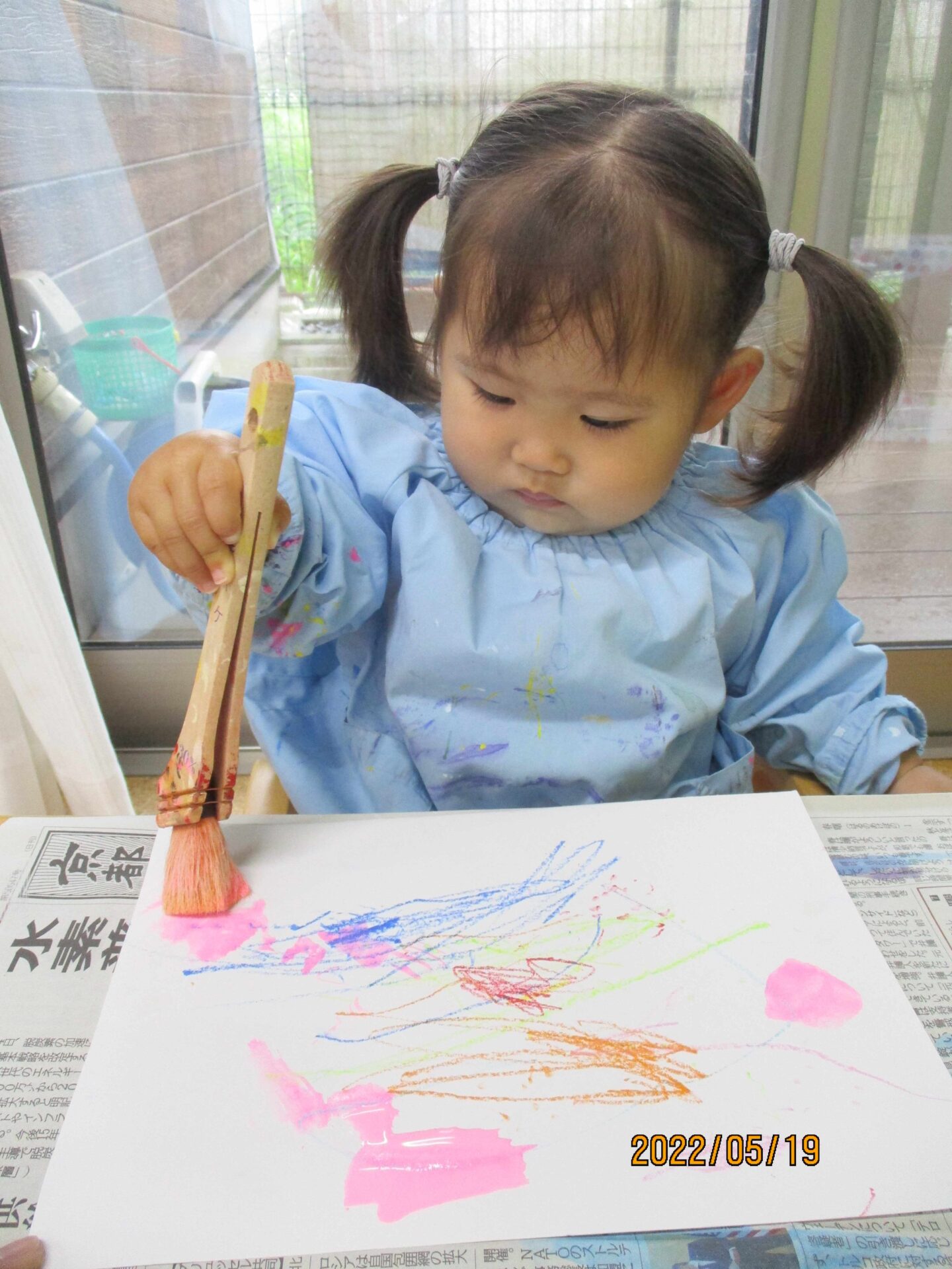 別日に、お絵描きの作品の上から、ハケを使って絵の具を塗りました(^▽^)