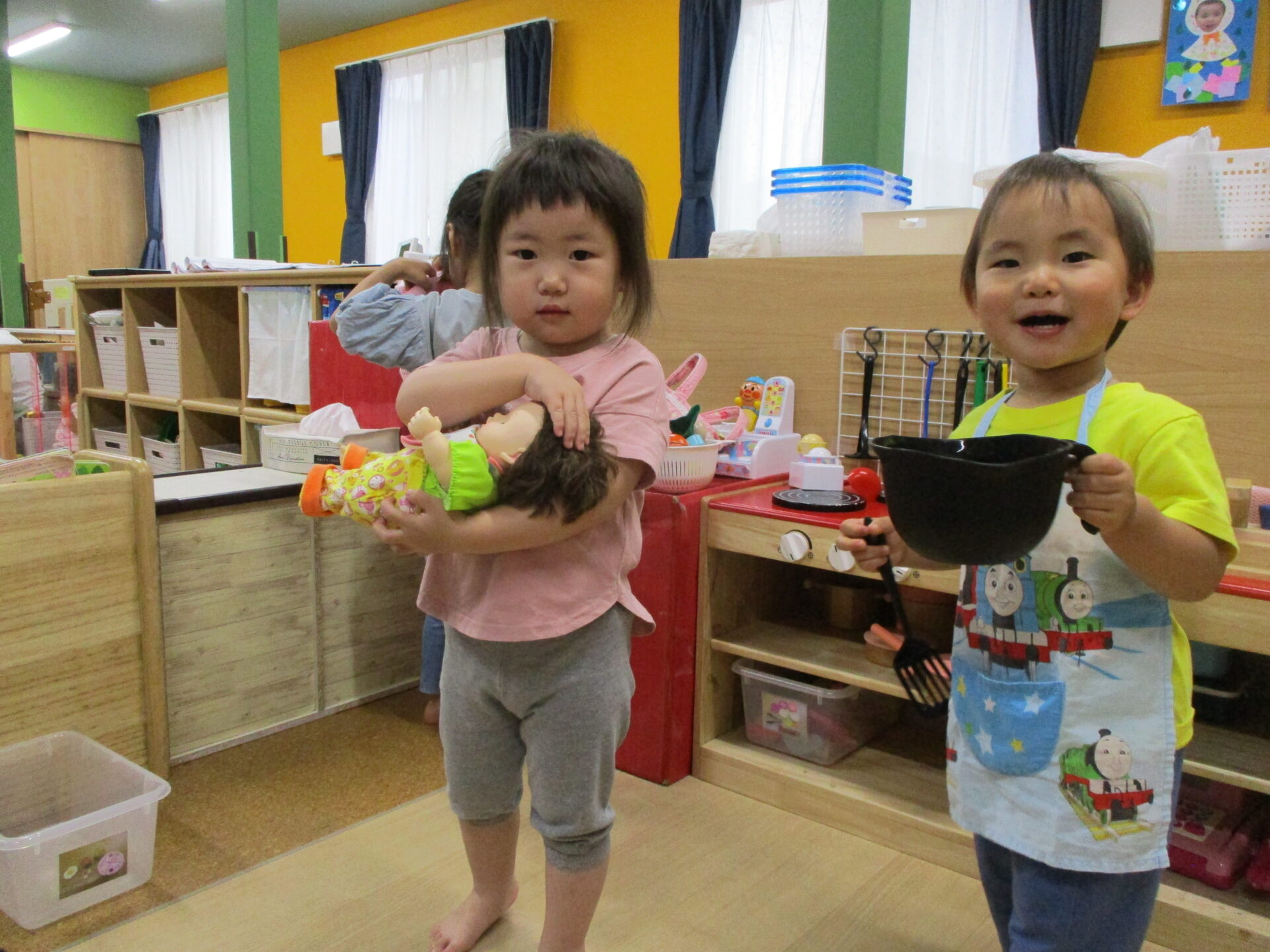 朝、登園すると、ままごと遊びにまっしぐら!!のあめチームの子どもたち😊
