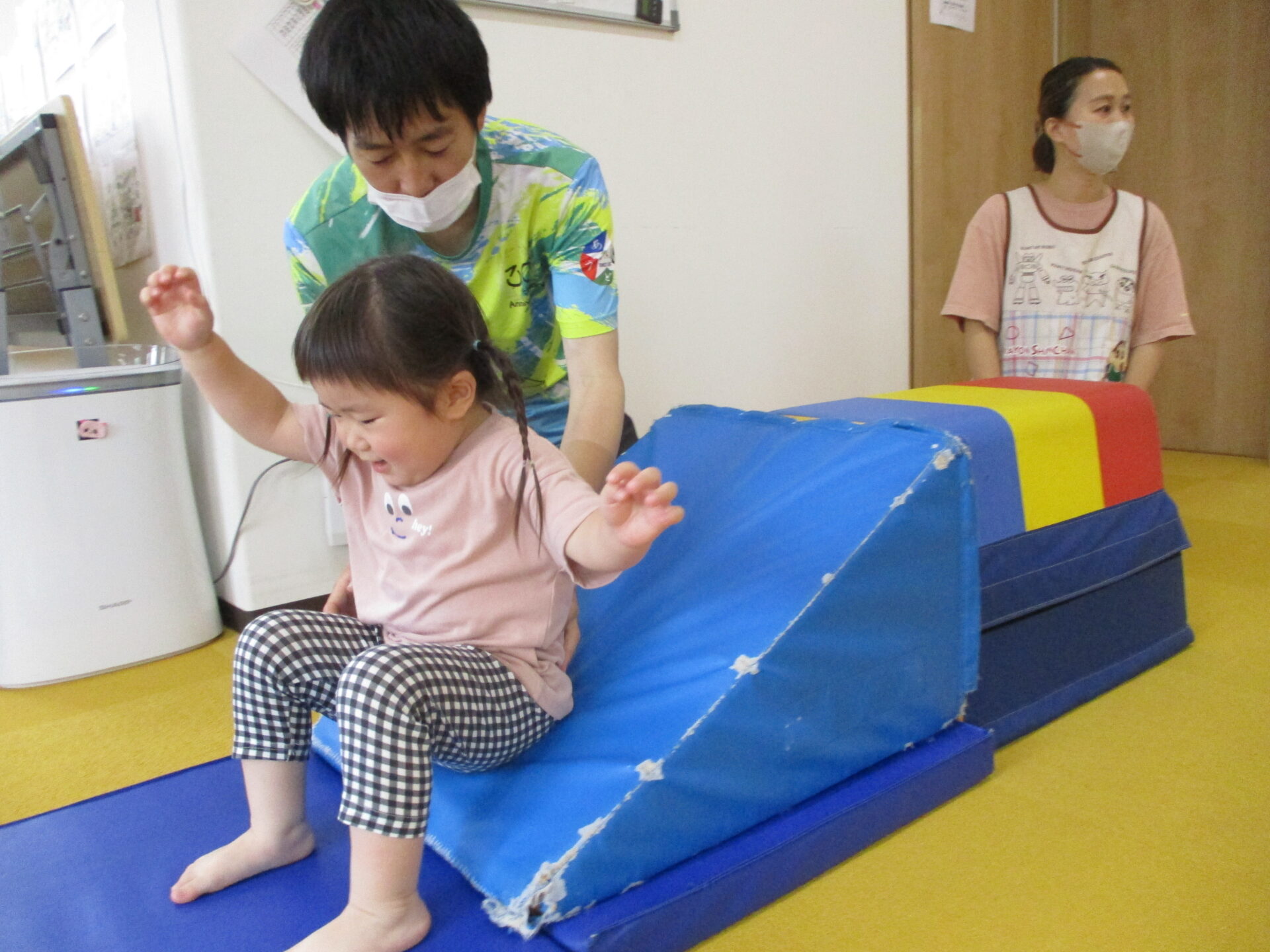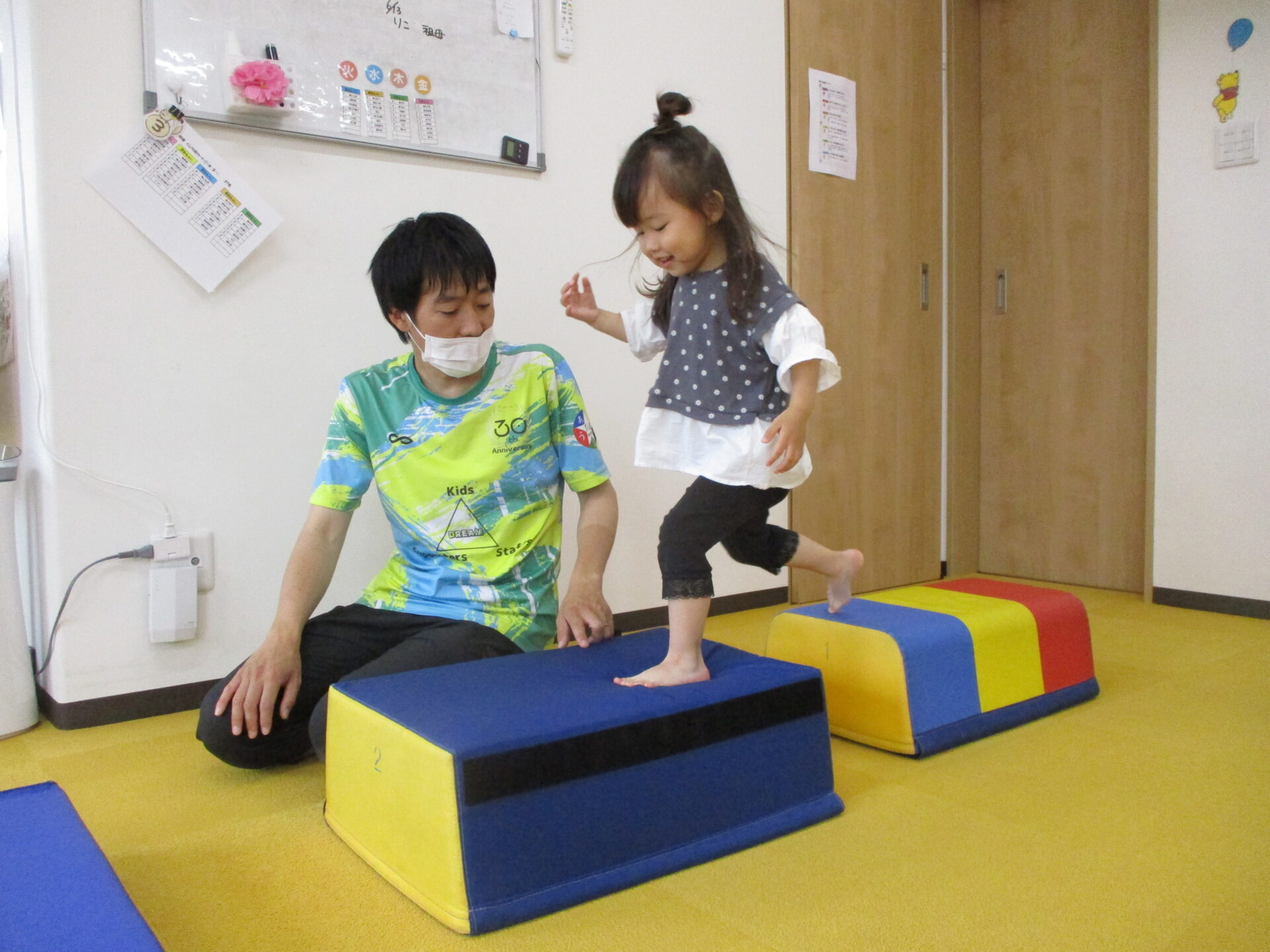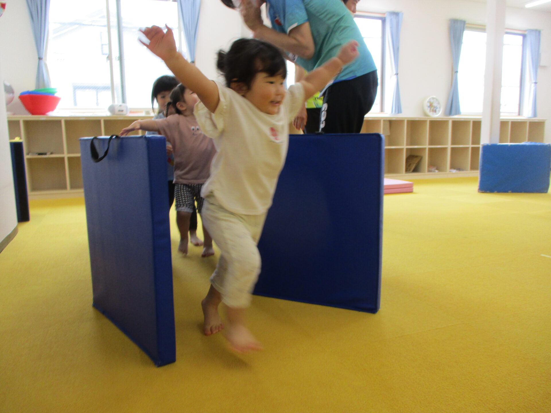 今回初めて”またぐ”という動作をし、マットとマットの間の距離を少しずつ広げていきました(^▽^)