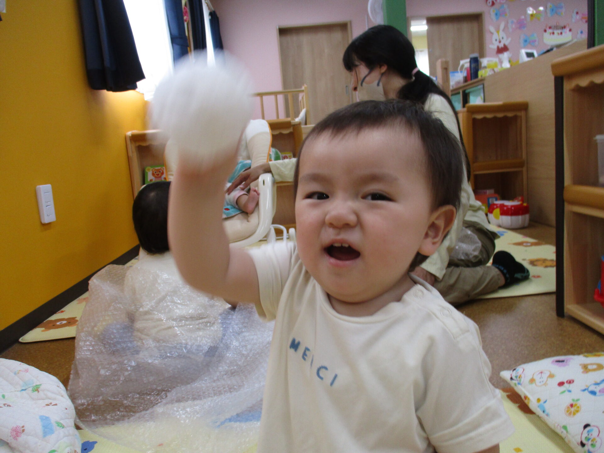 ”この感触はなに?💓”と言わんばかりに、プチプチをギュっと握っていました(⌒∇⌒)