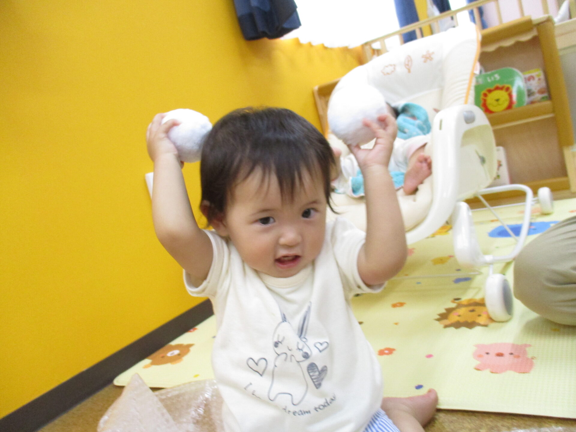 うみチームの子ども達は、ご機嫌で手足をバタつかせたり、立っちの姿勢から1歩・2歩と歩くことを喜んだり・・・のびのび身体を動かして過ごしています(⌒∇⌒)