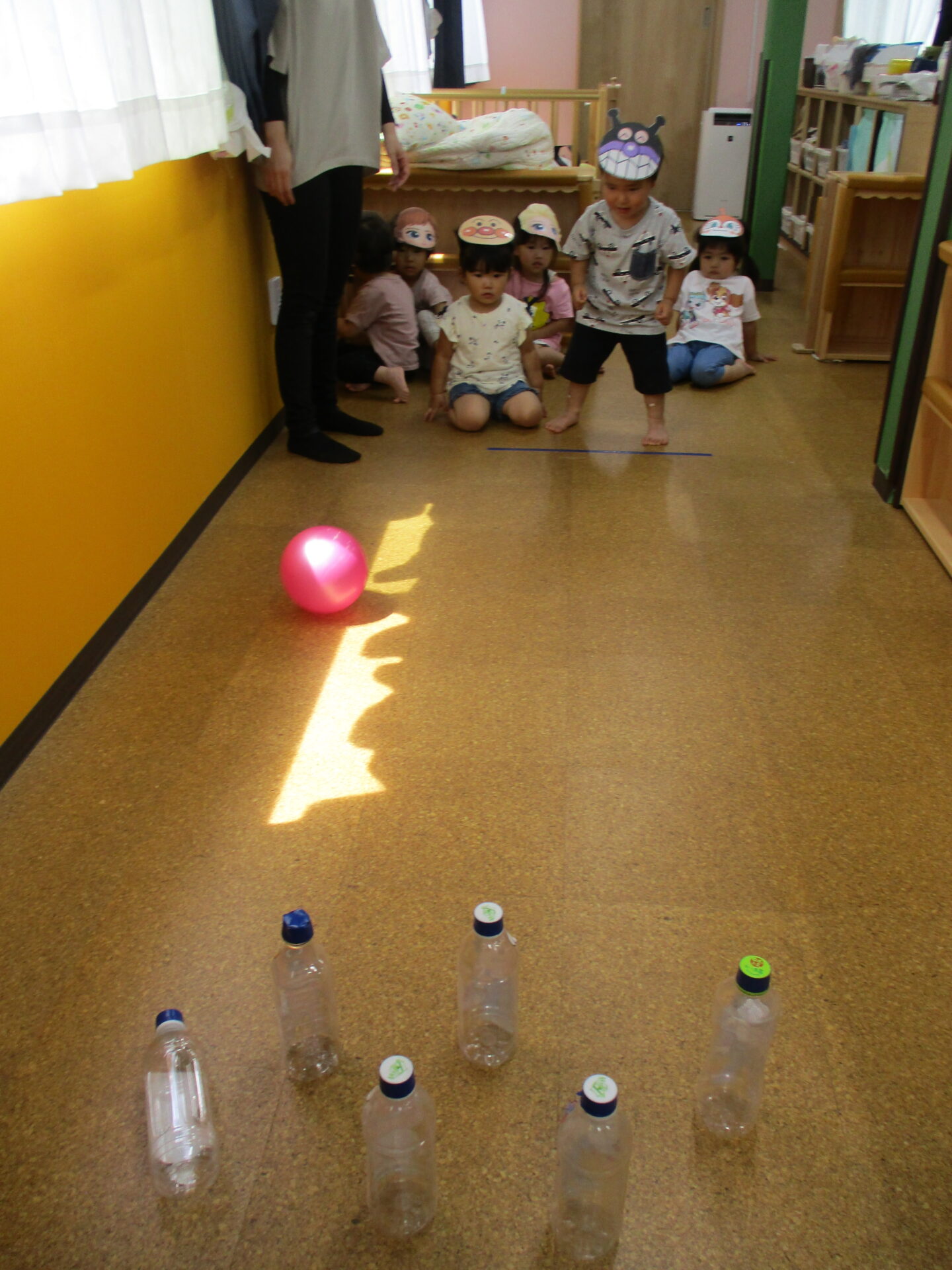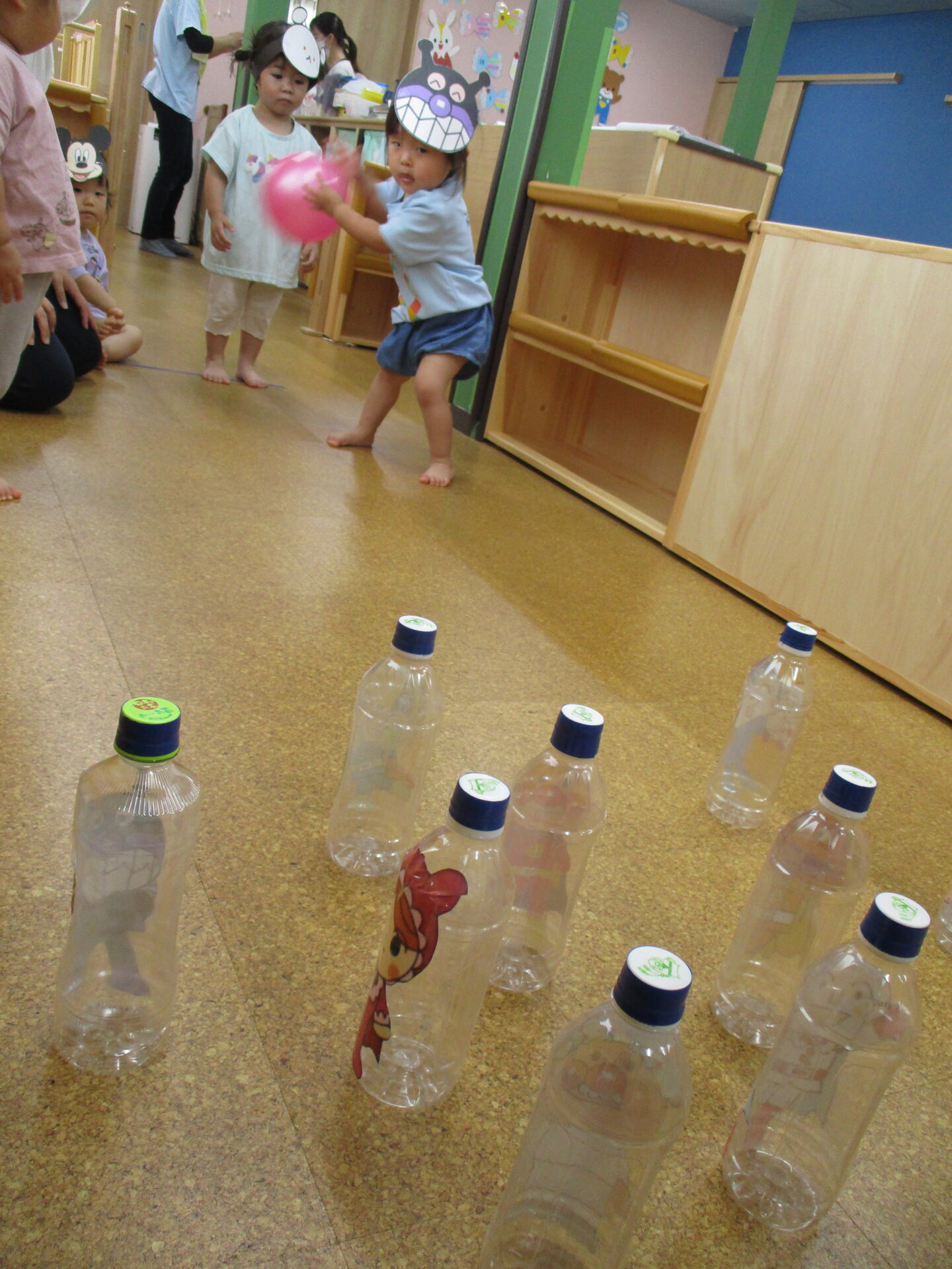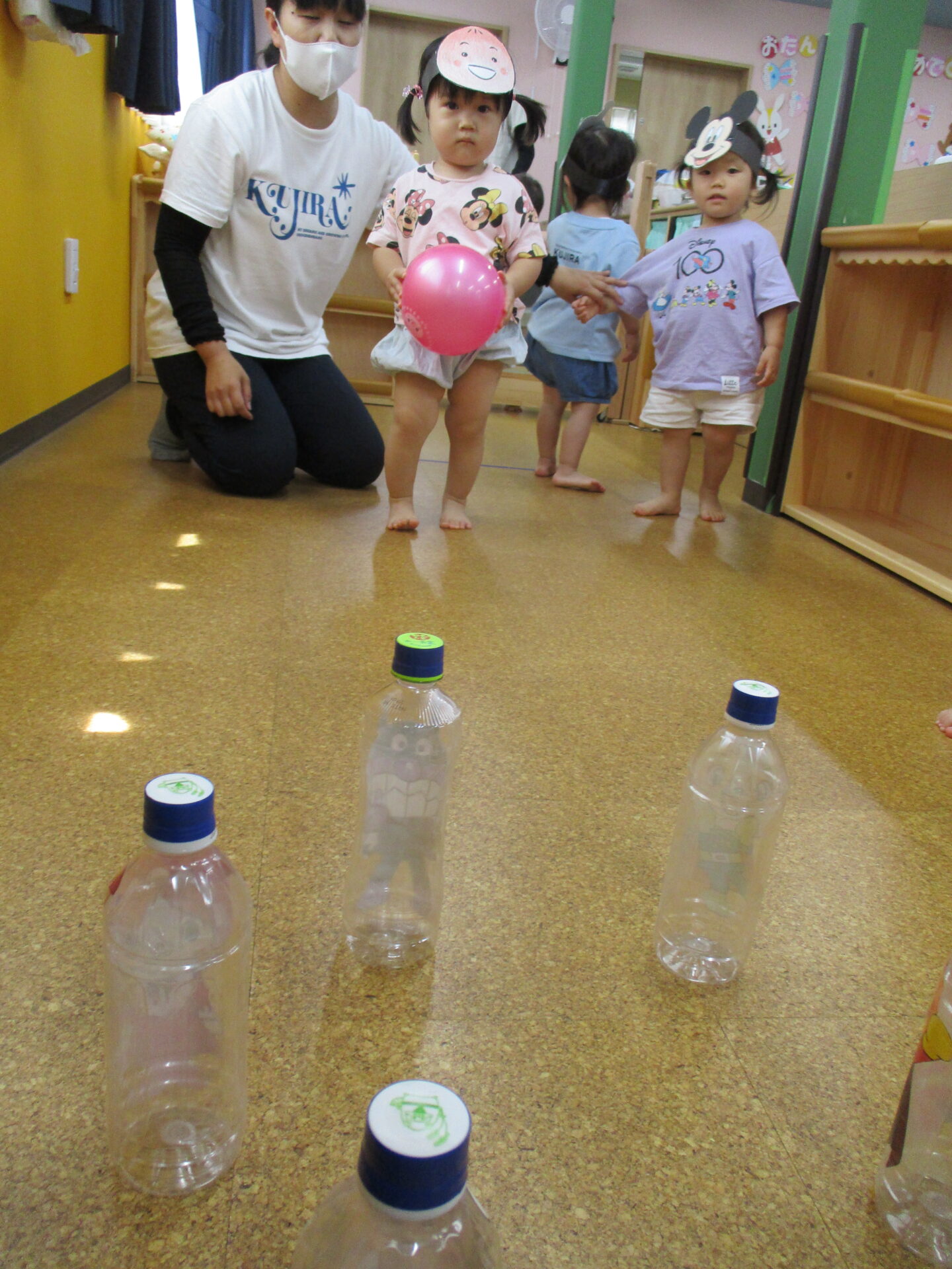 順番にボールを転がしてペットボトルのピンを倒しました✨