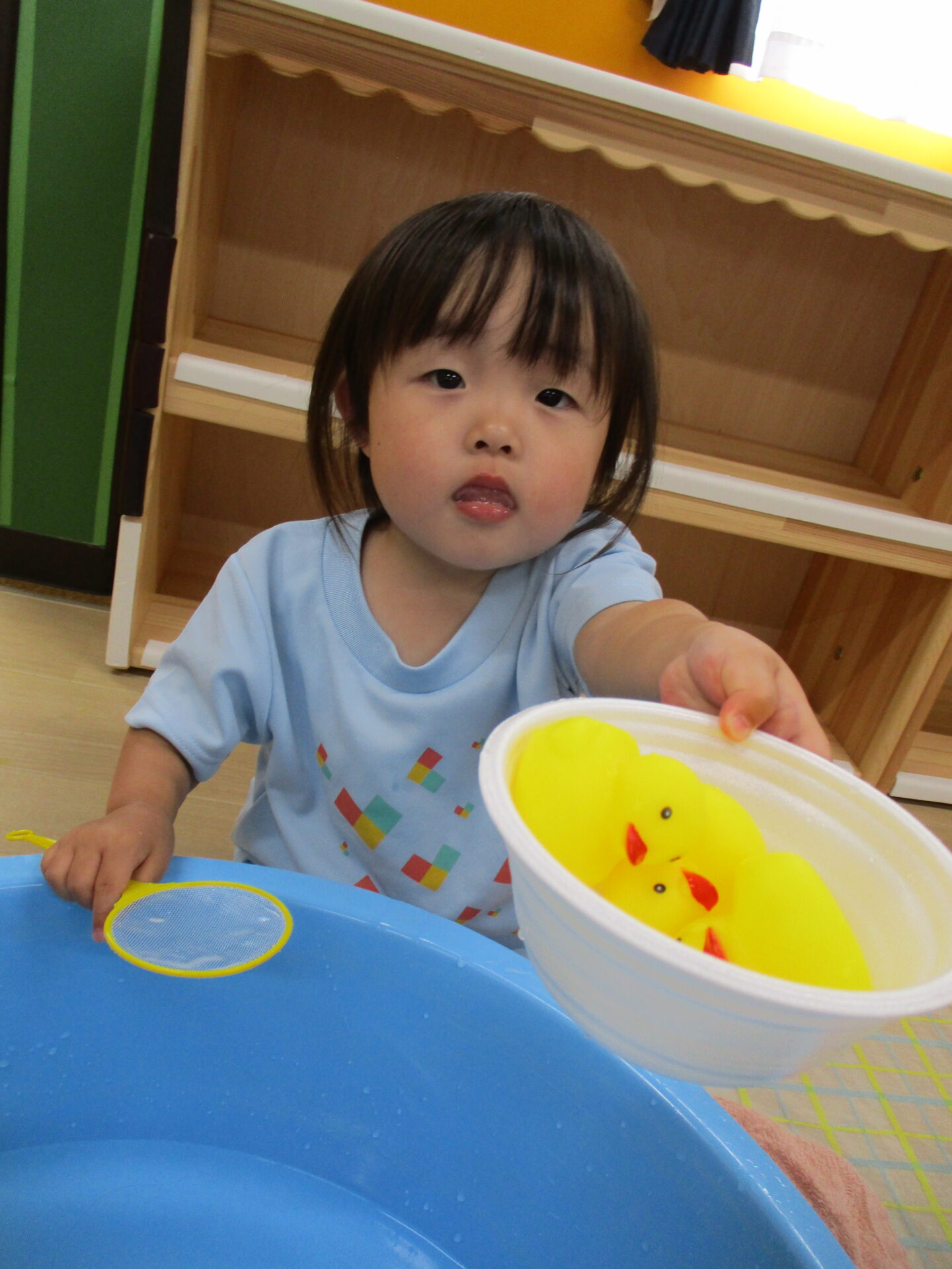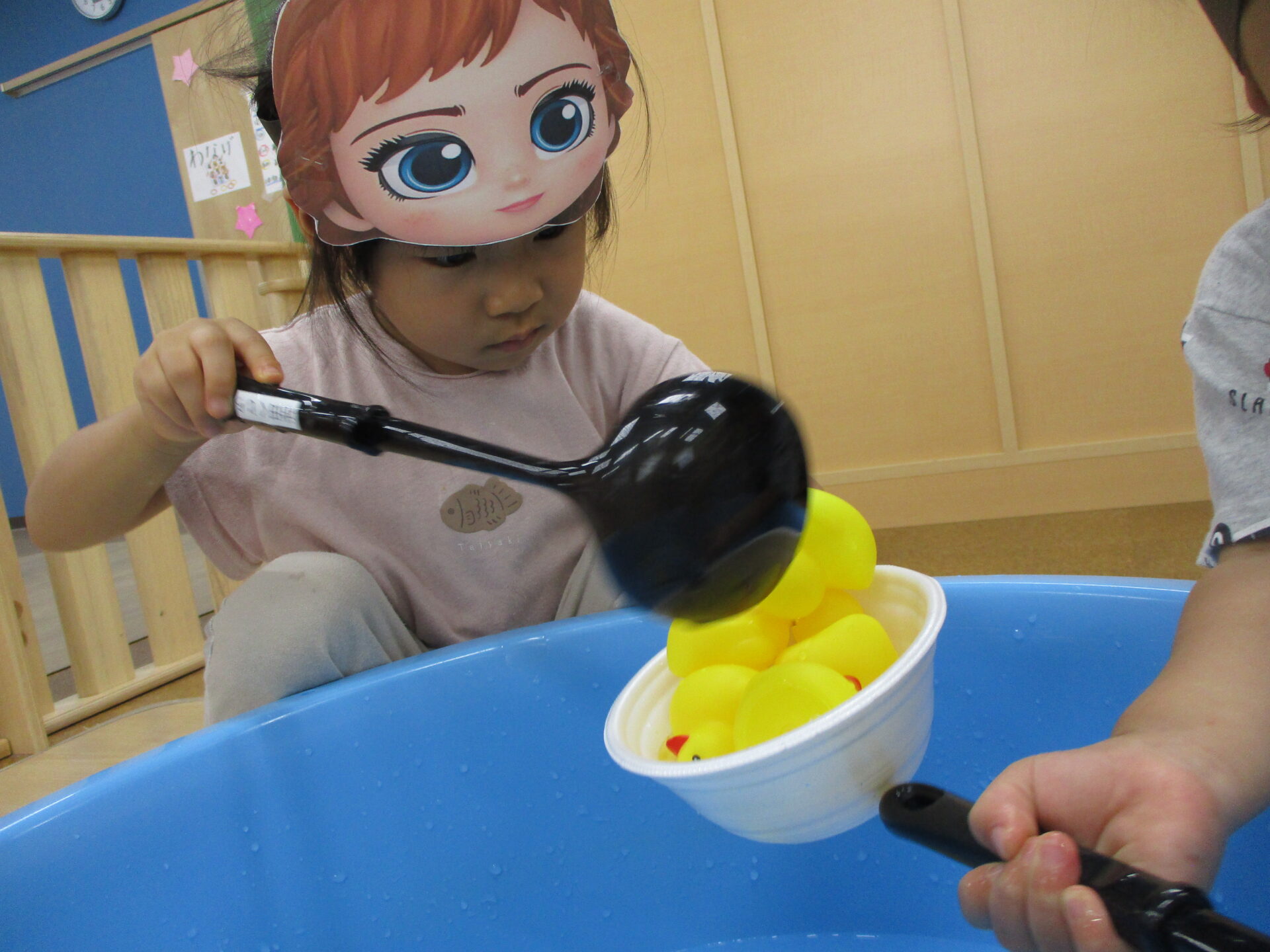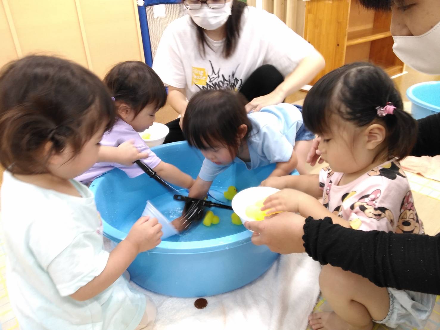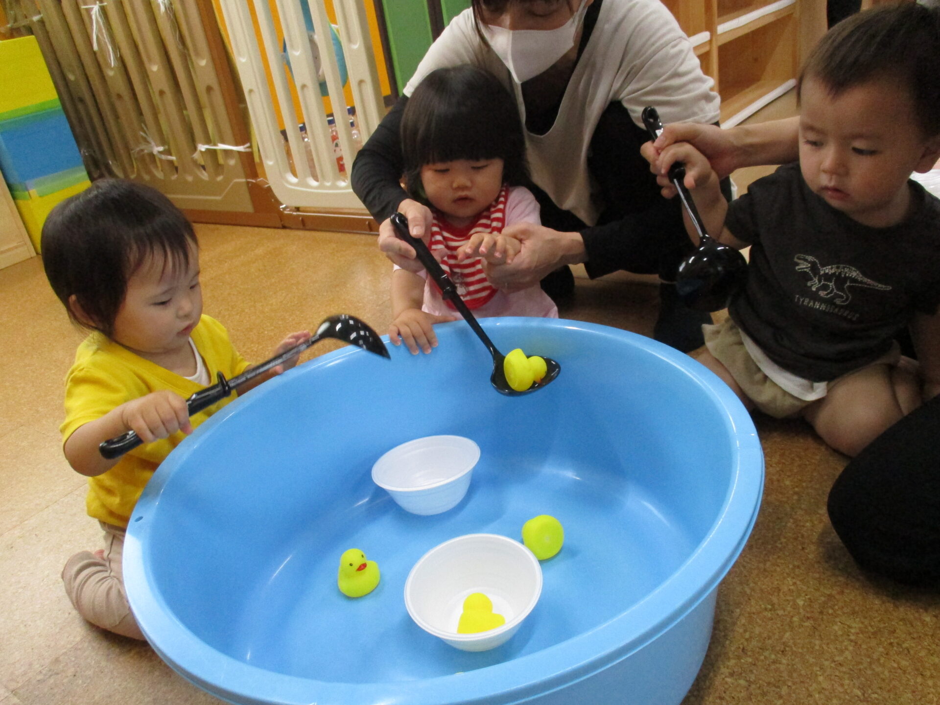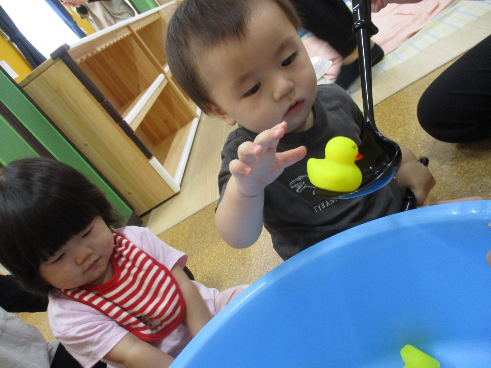 うみチームさんのタライには水は入っていませんが、保育者と一緒にお玉ですくったり、手で掴んだりしていました(⌒∇⌒)