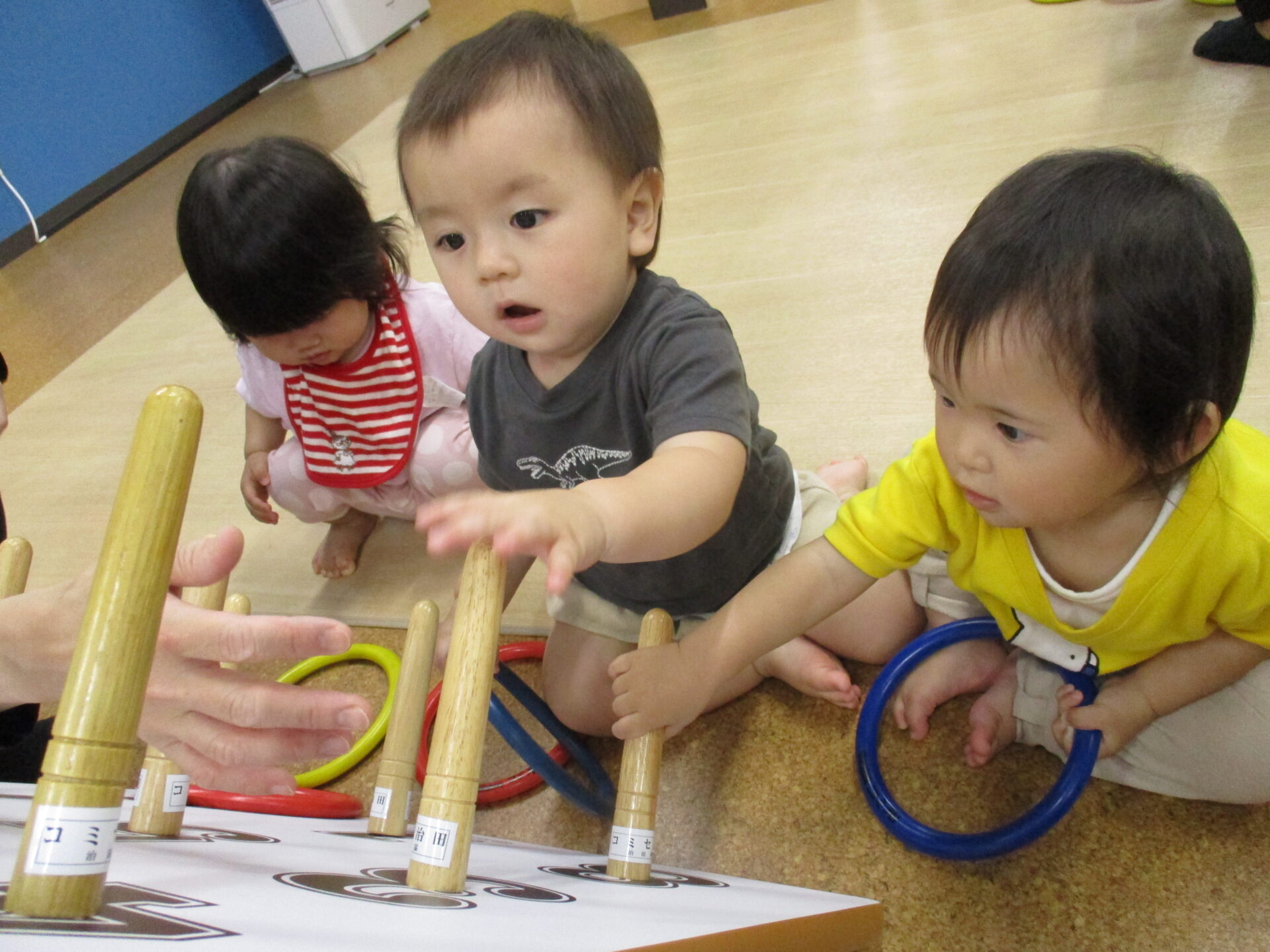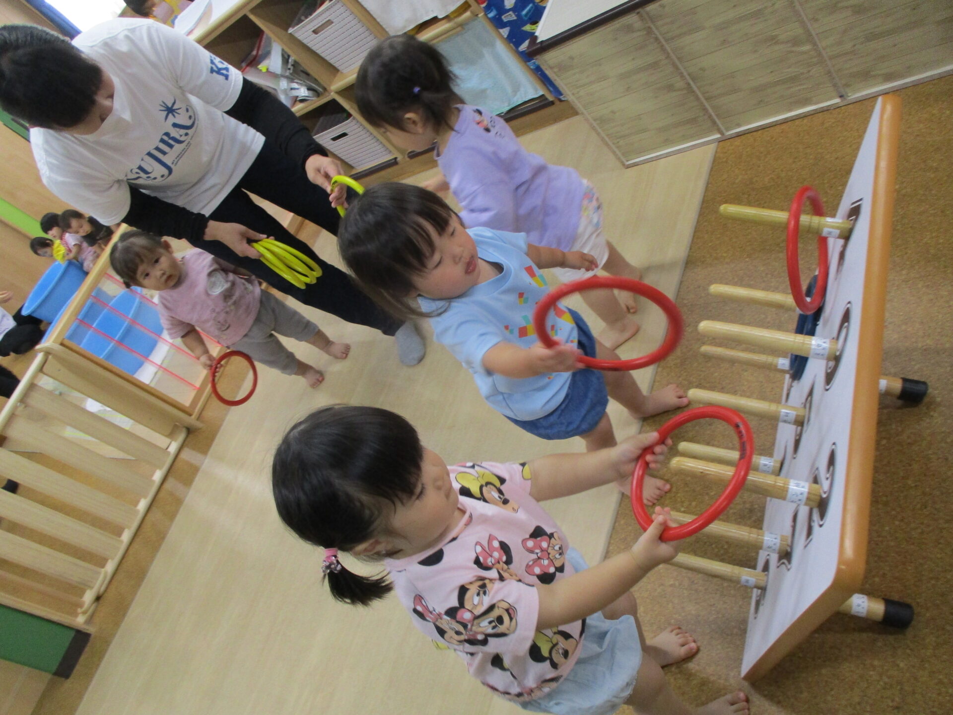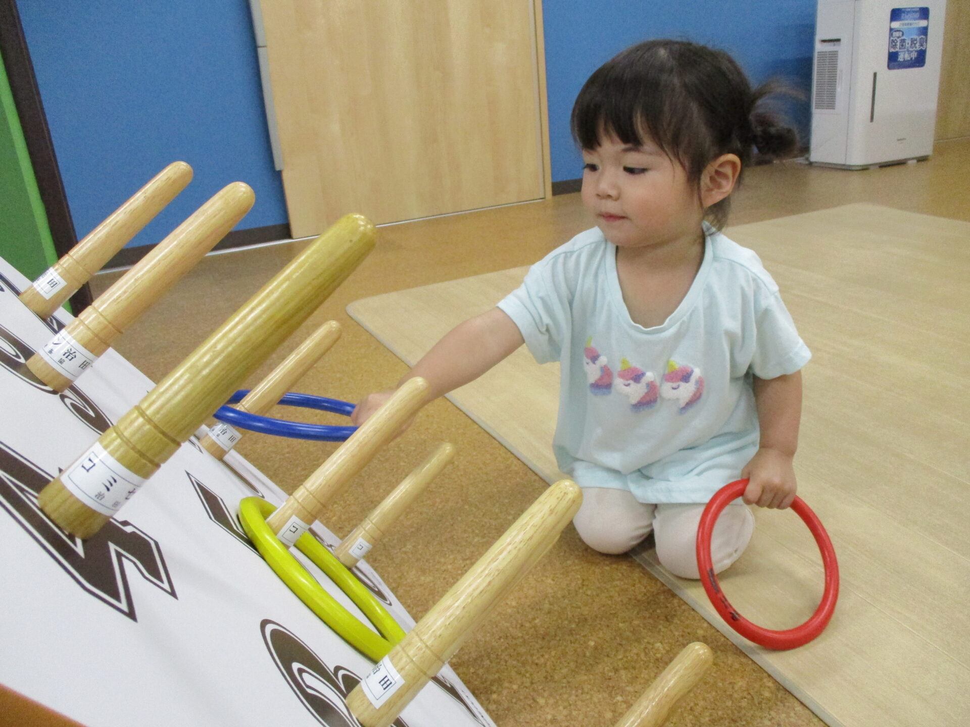 輪投げの台に興味津々(⌒∇⌒)台や輪っかを触って楽しんでいました✨