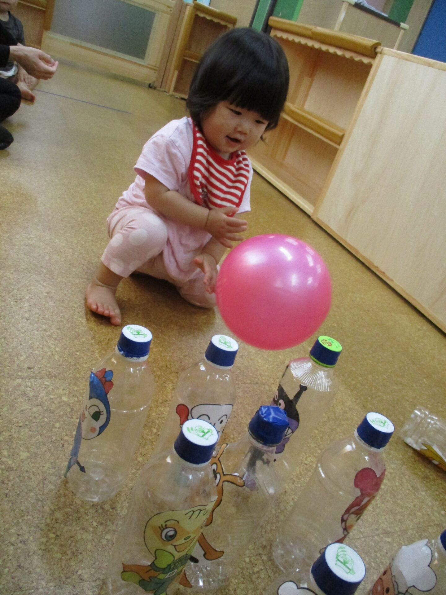 ペットボトルのピンが倒れるか・・・真剣な顔でボールを見送っています(⌒∇⌒)