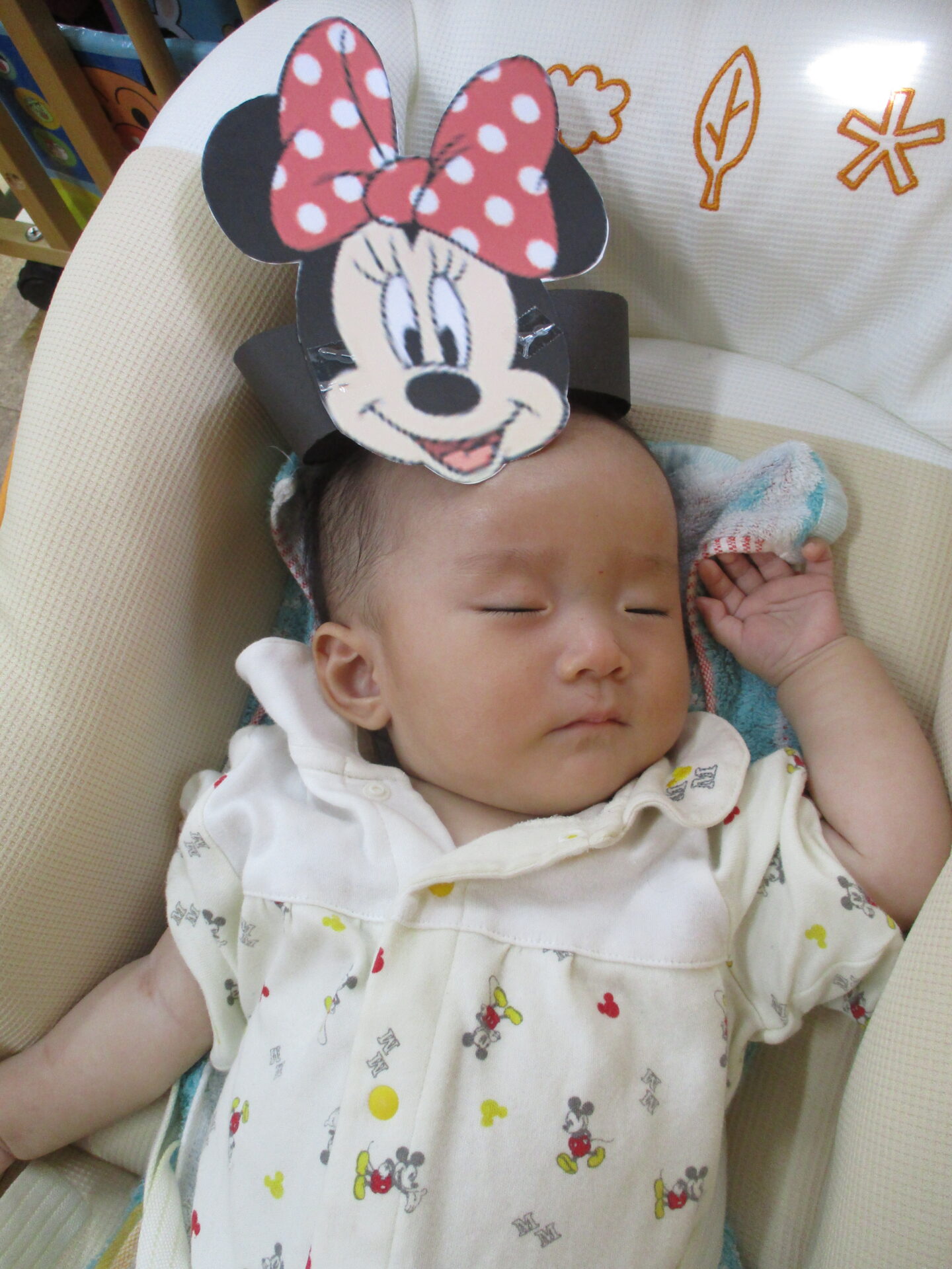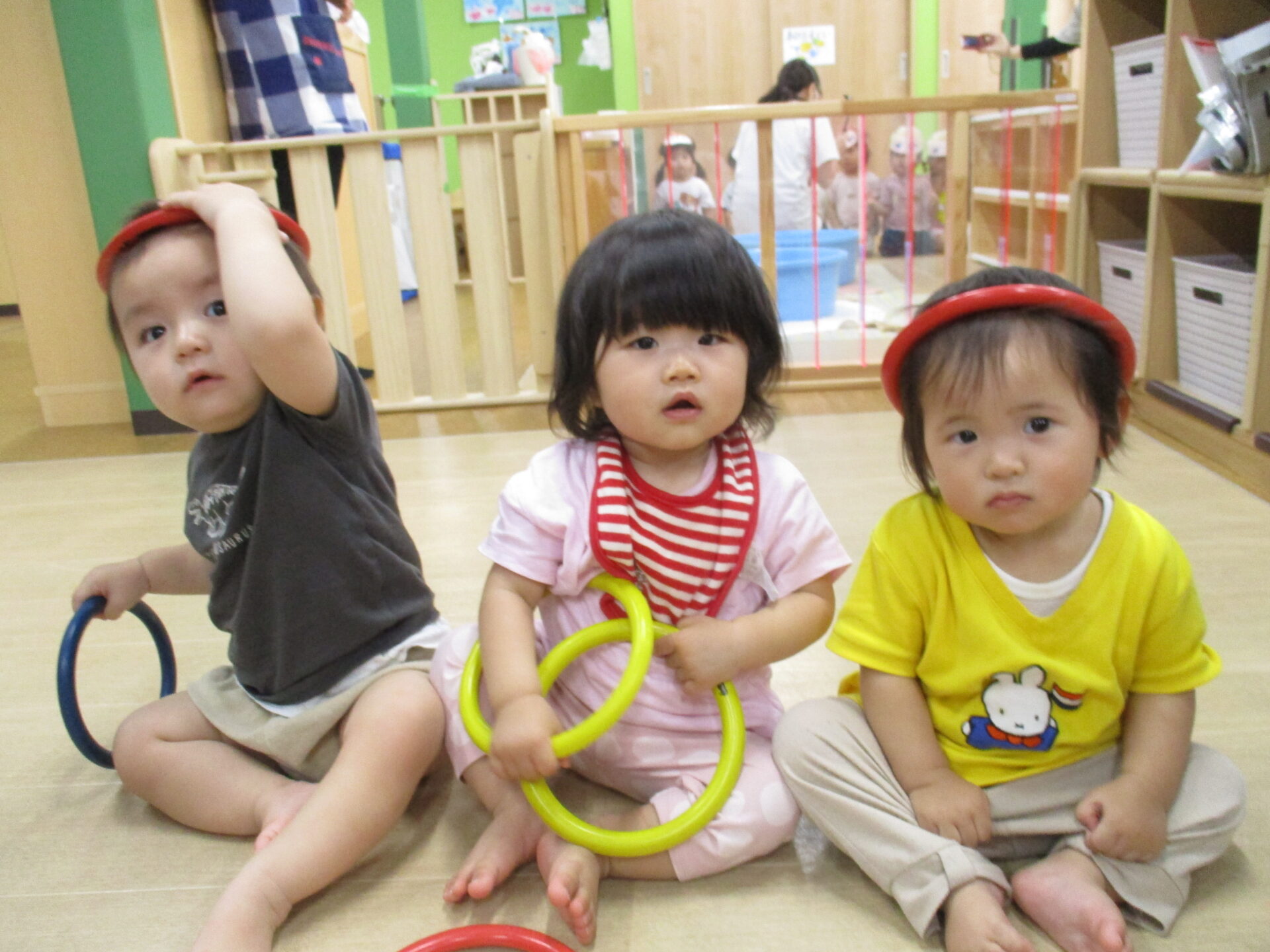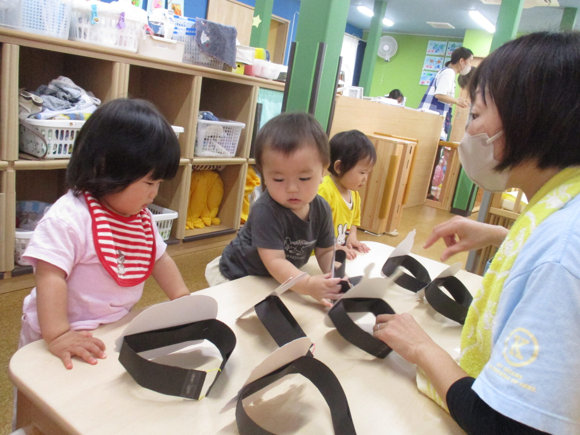 頭の上に自分で乗せようとしたり、保育者が乗せると手を伸ばしてとろうとしたりしていました💕