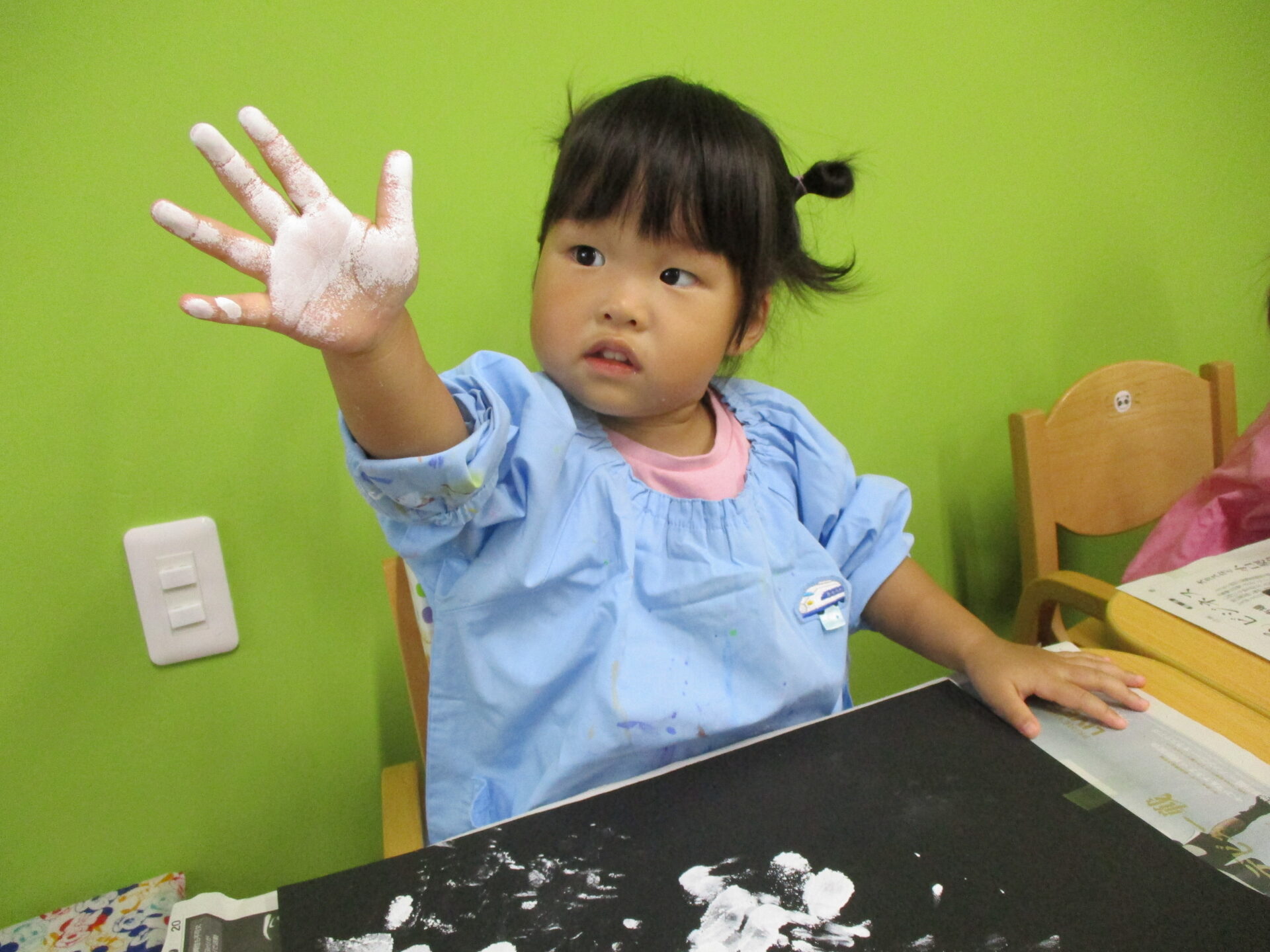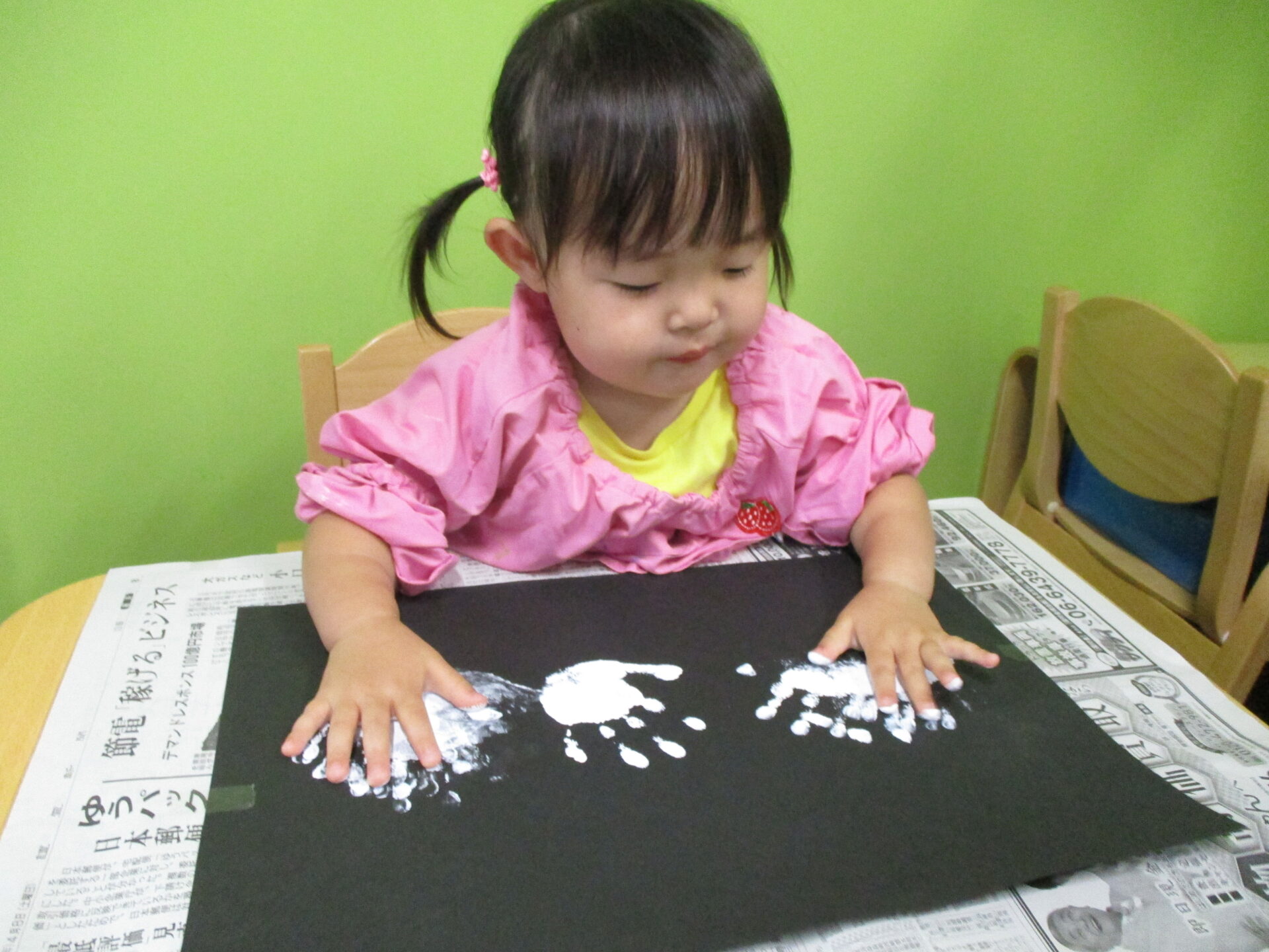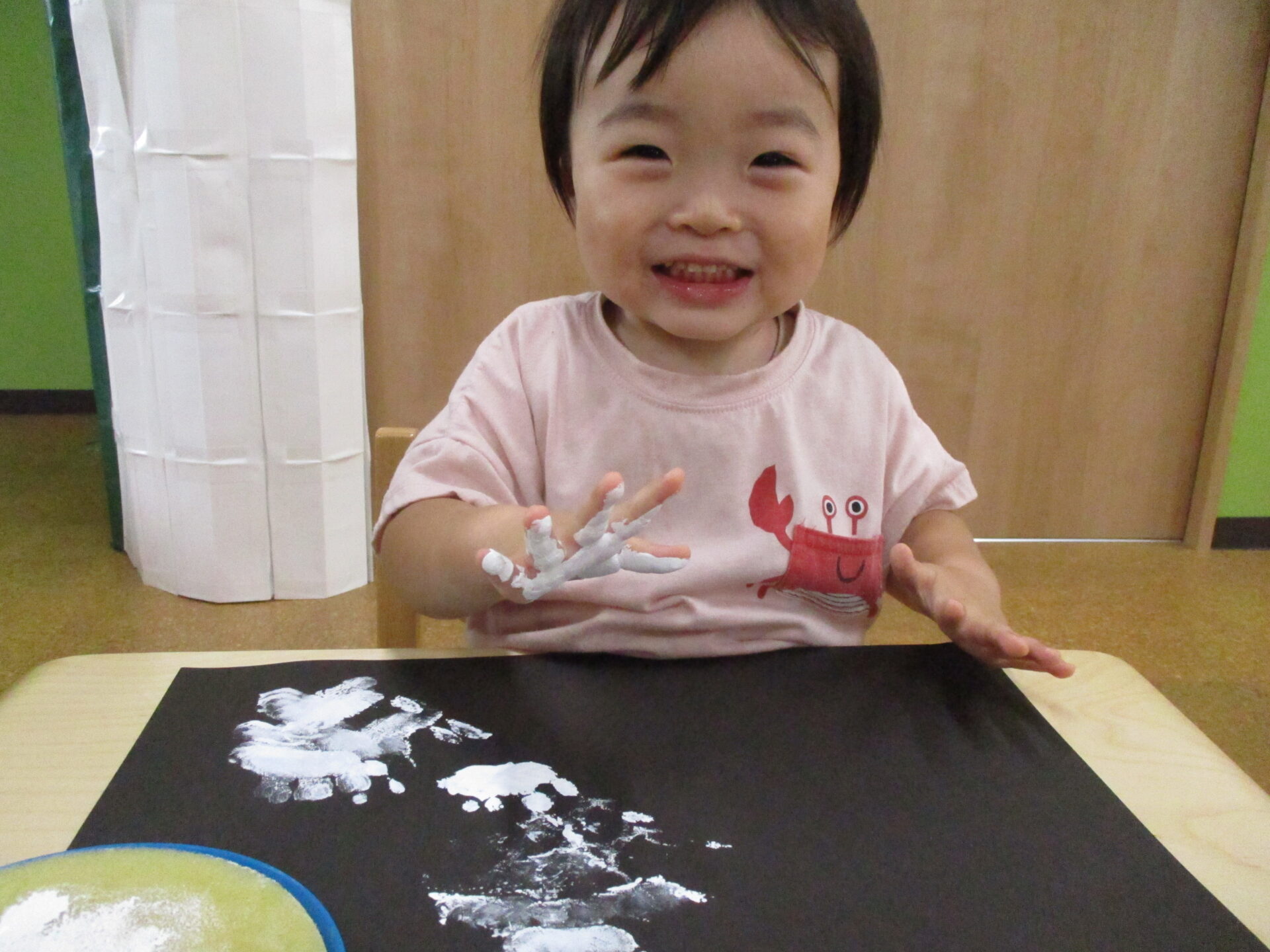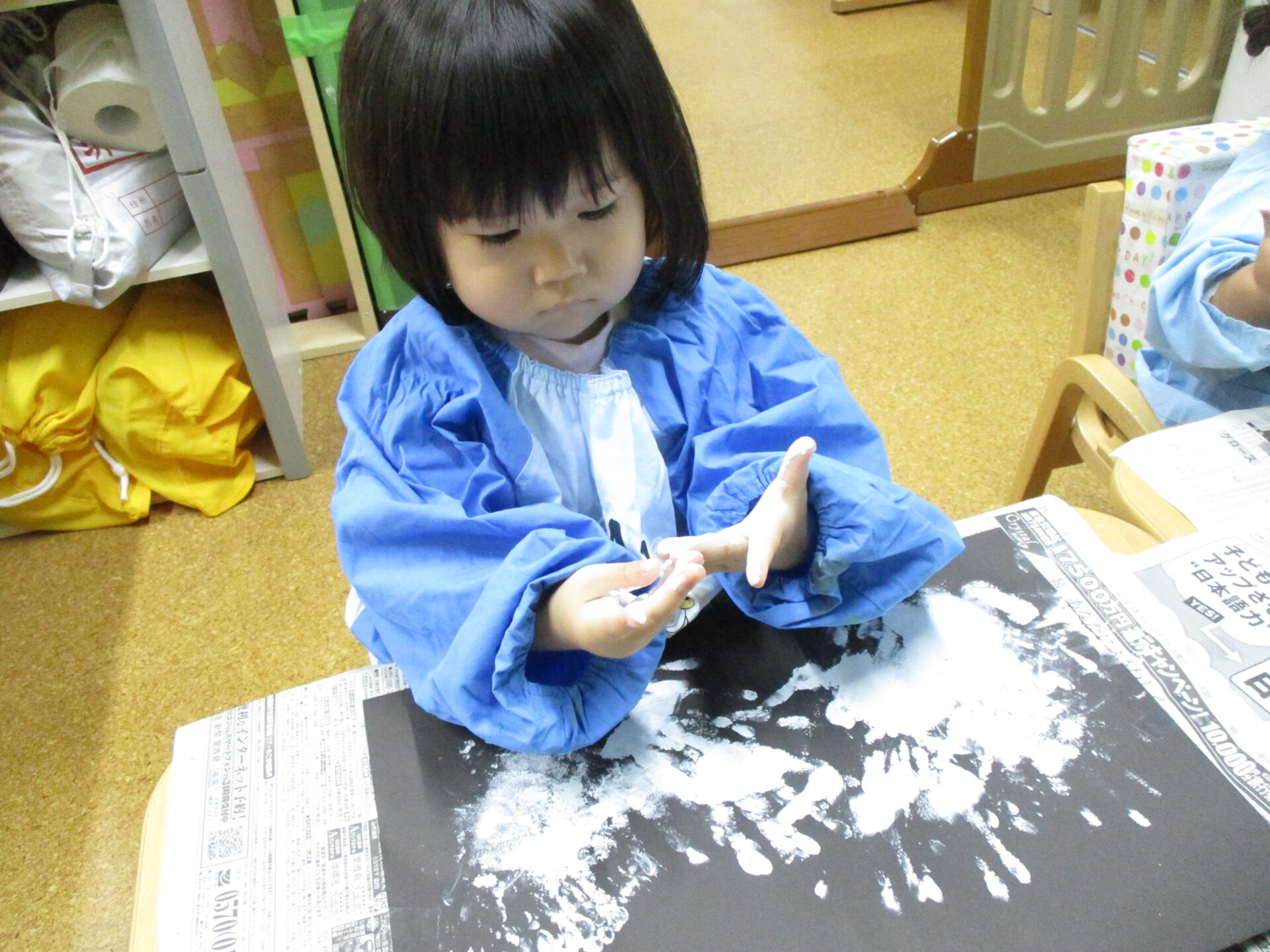 白色の絵の具を手に付けて、画用紙にぺったん!!