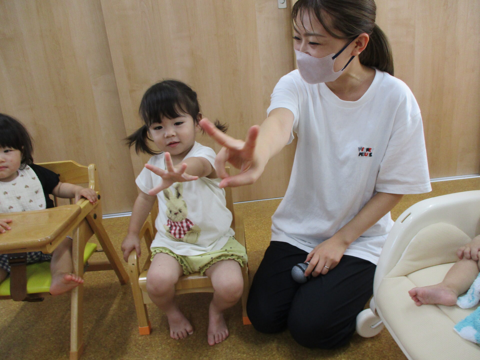 「何歳になりましたか?」の質問に、手をのばして”2歳!!”とがんばって教えてくれようとしていました(⌒∇⌒)