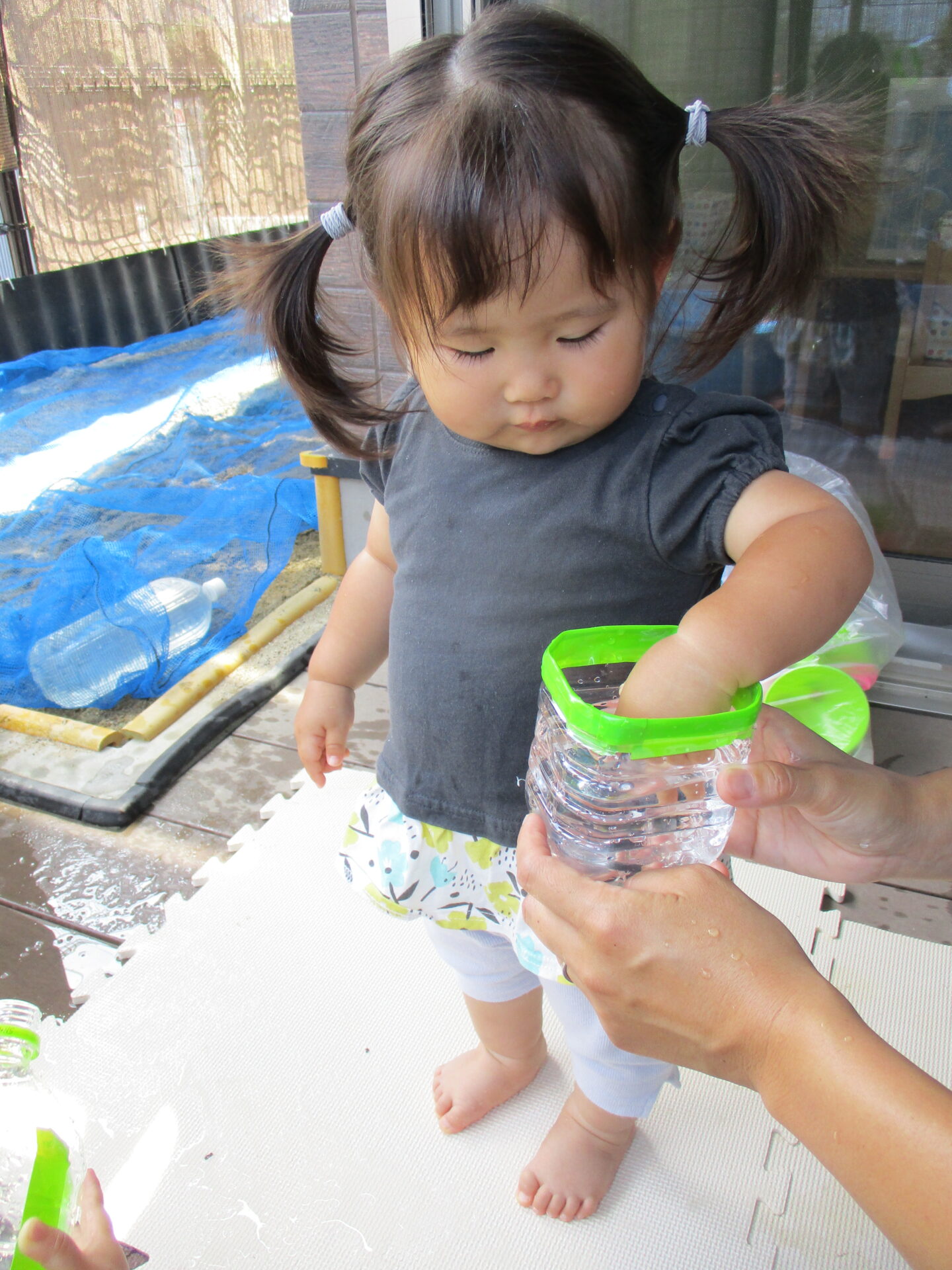 タライの水は少しドキドキしている様子だったので、保育者がペットボトルに水を入れると、そっと手を入れてみることができました👌