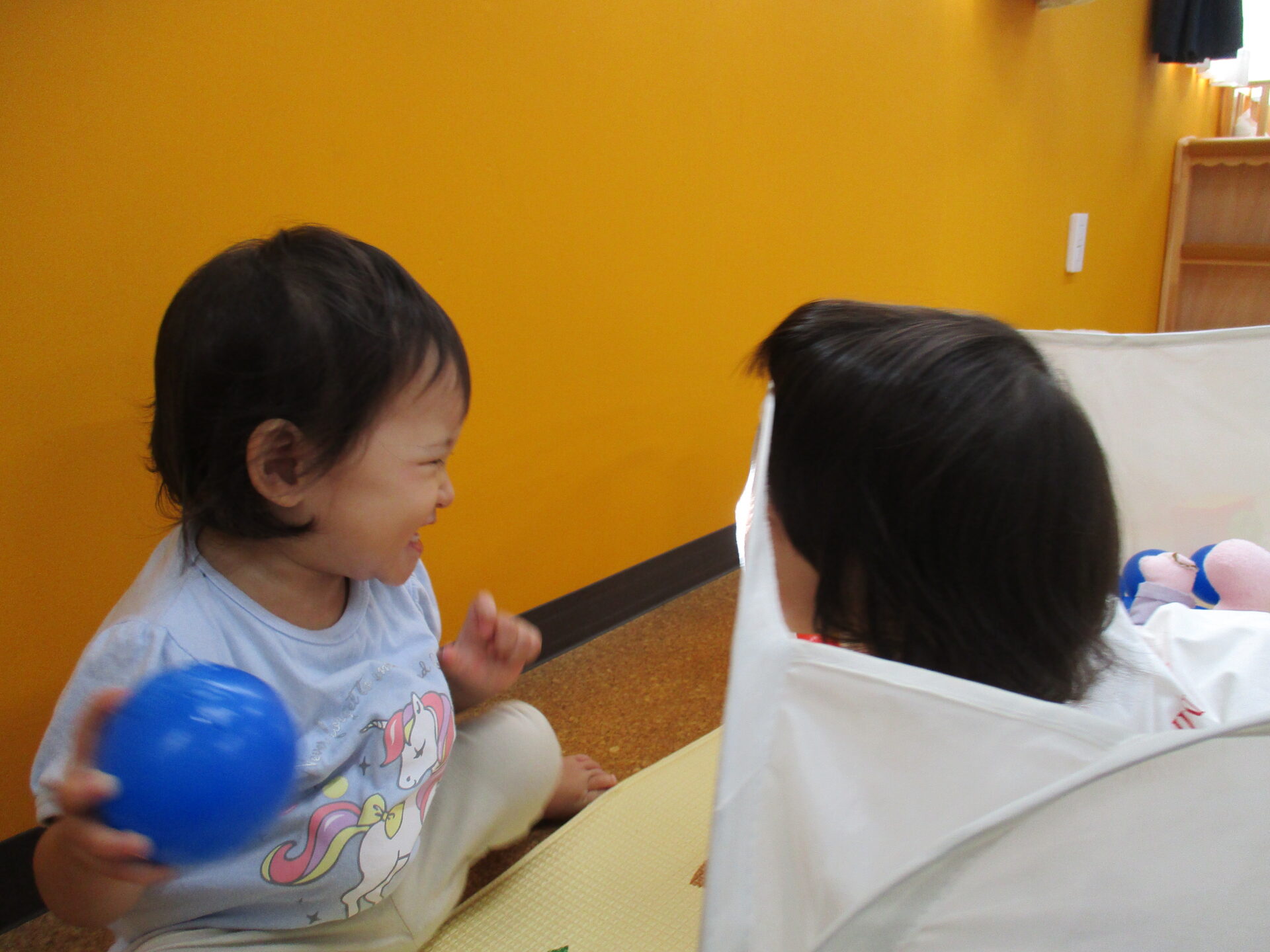 保育者と楽しんでいるお友だちのもとへ行き、コチョコチョ~💕としています(⌒∇⌒)