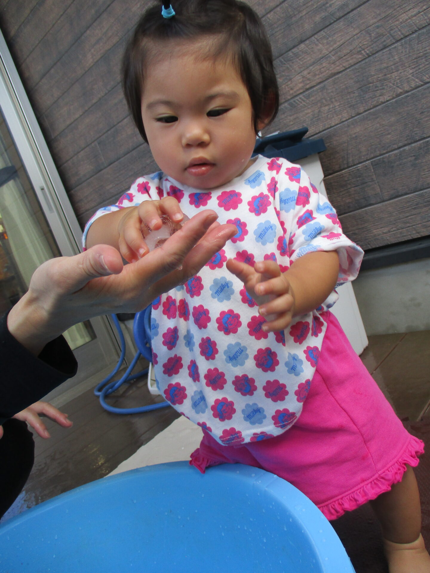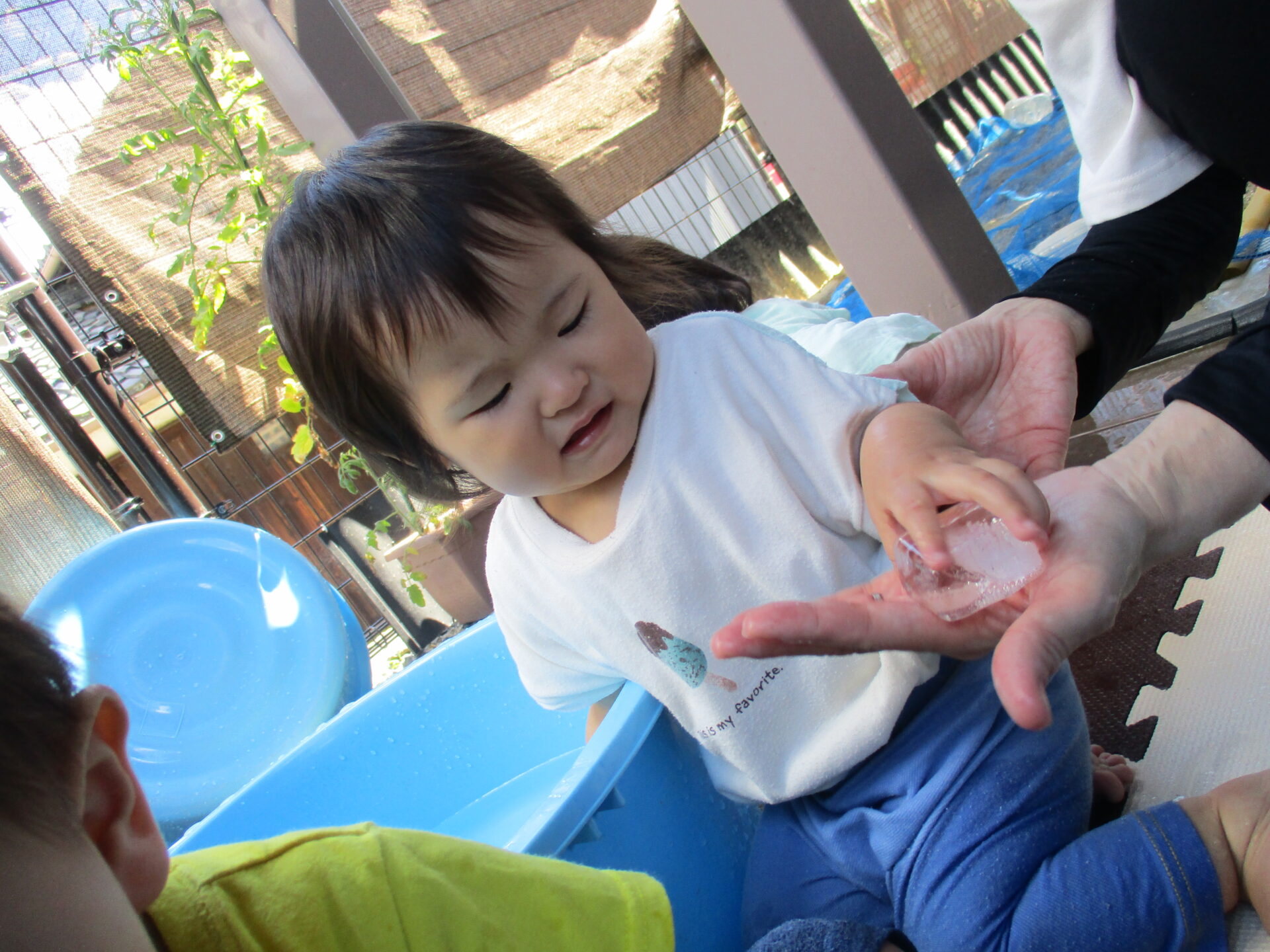 何度も楽しんできた水遊びですが、今回は初めて氷を投入!!