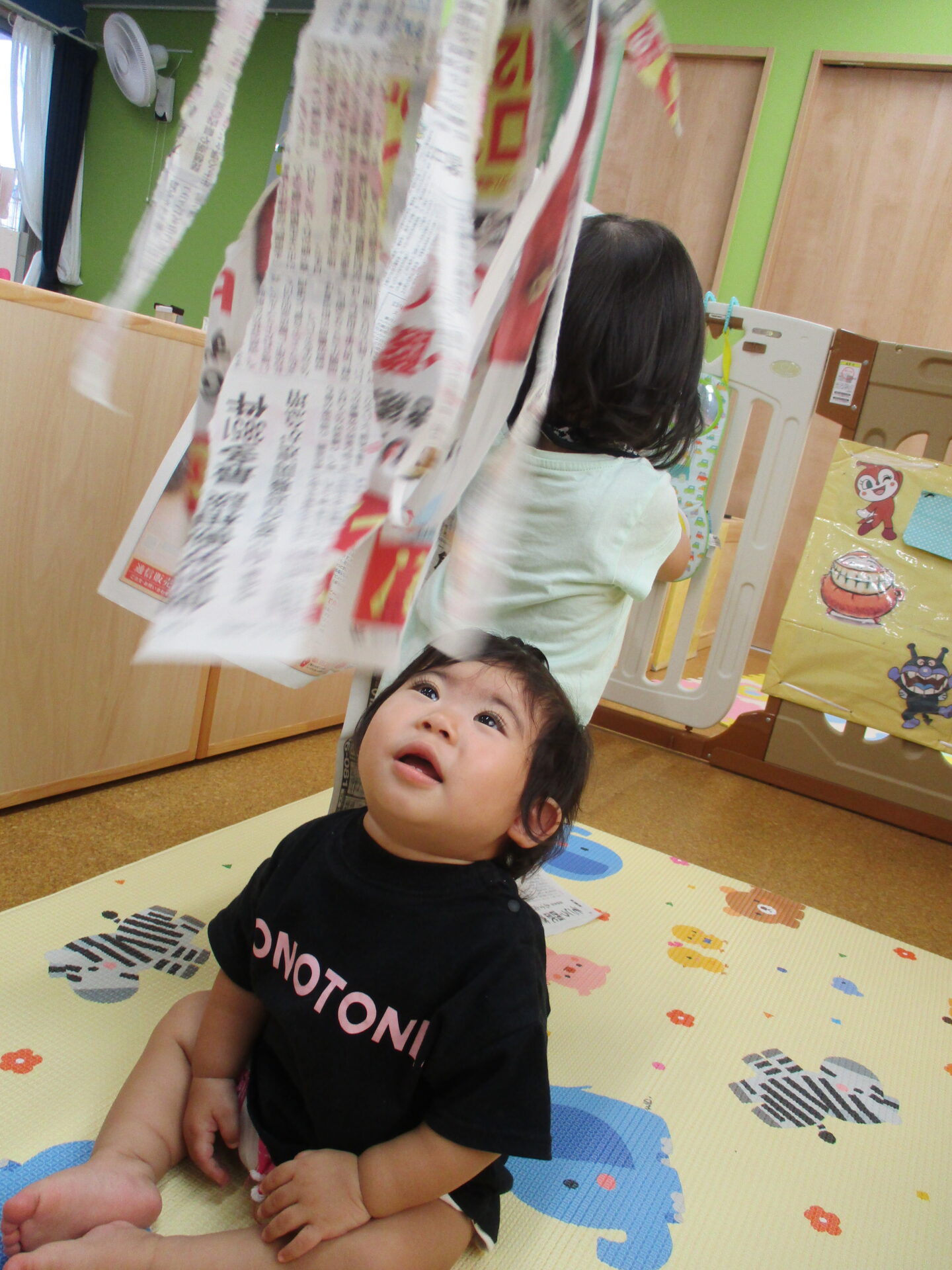 新聞紙で遊んだよ🎵(0歳児うみチーム)