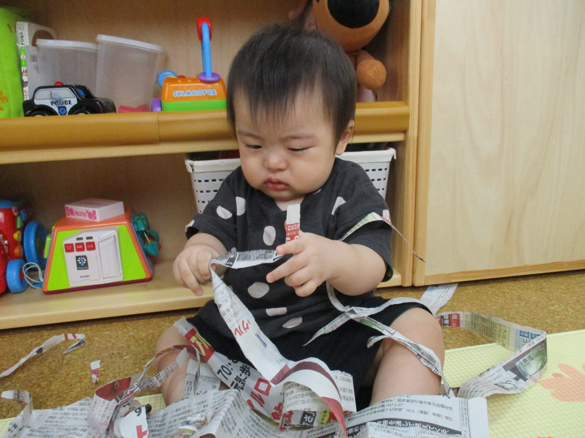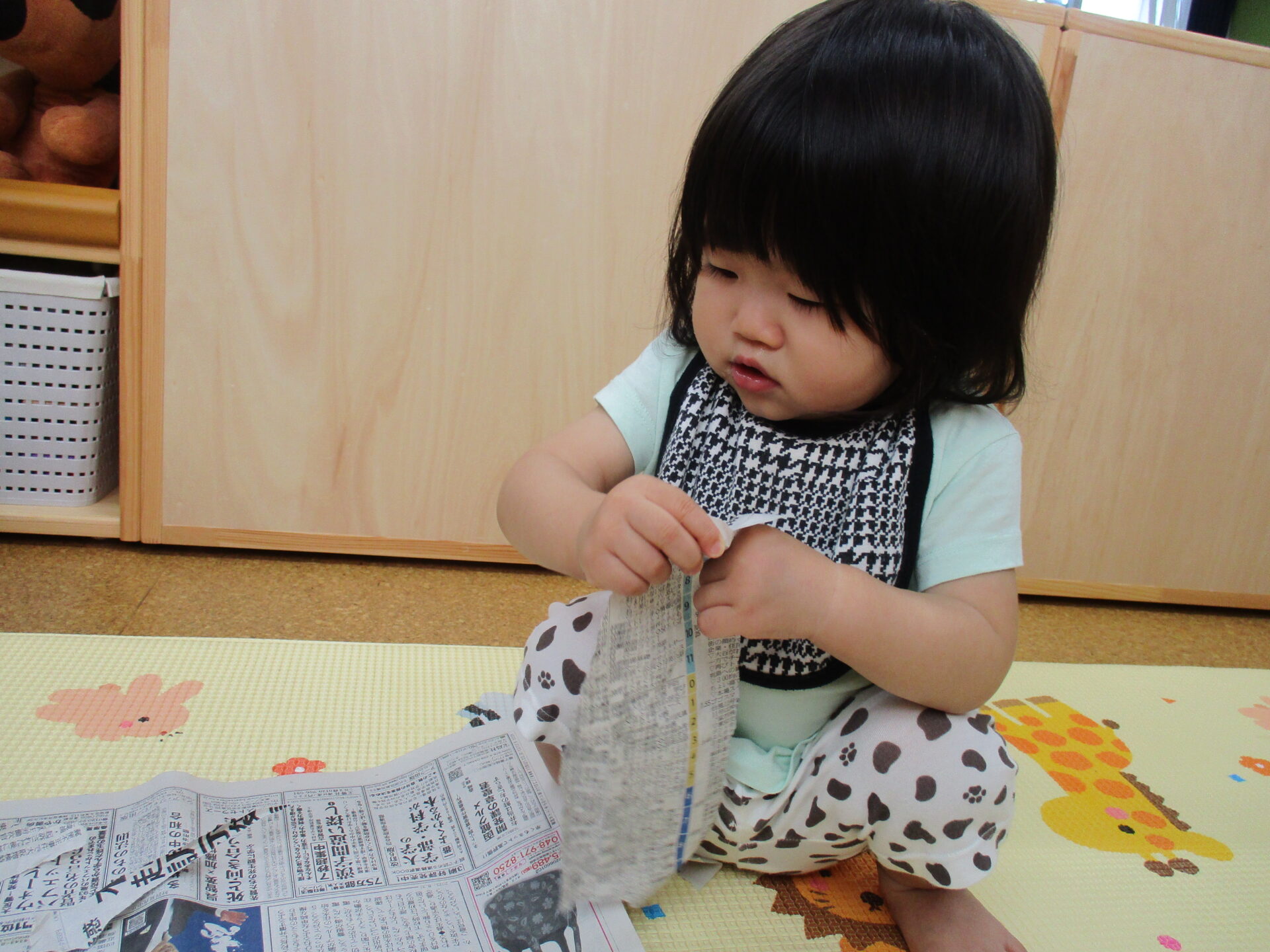 保育者が、新聞紙を破っている様子を見て、一生懸命指先で、新聞を摘みます👌
