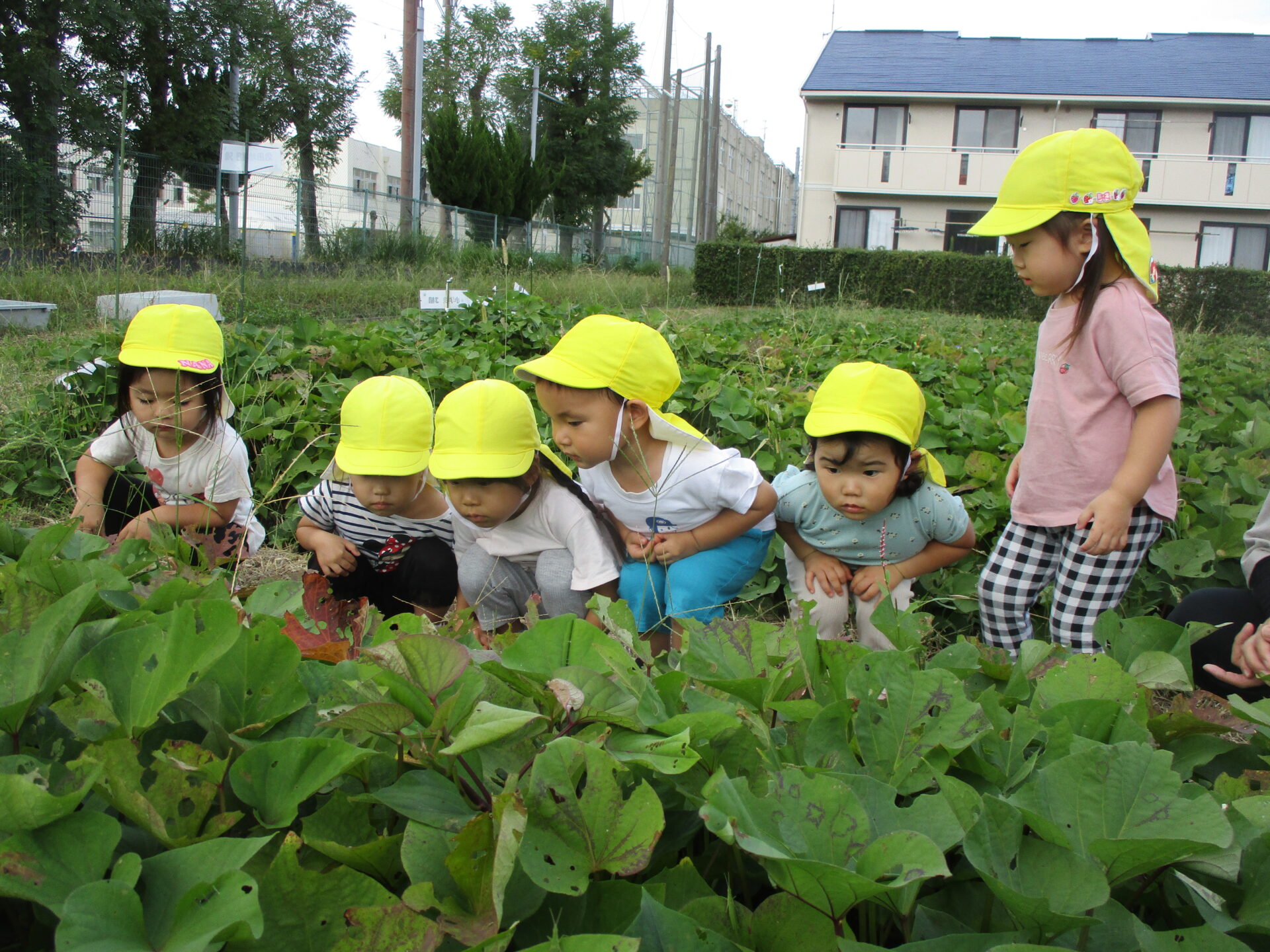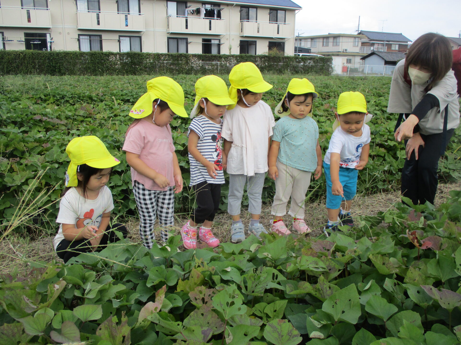 「たくさんの葉っぱと土の下にお芋があるんだよ!!」と保育者が伝えると興味津々で耳を傾けます😊