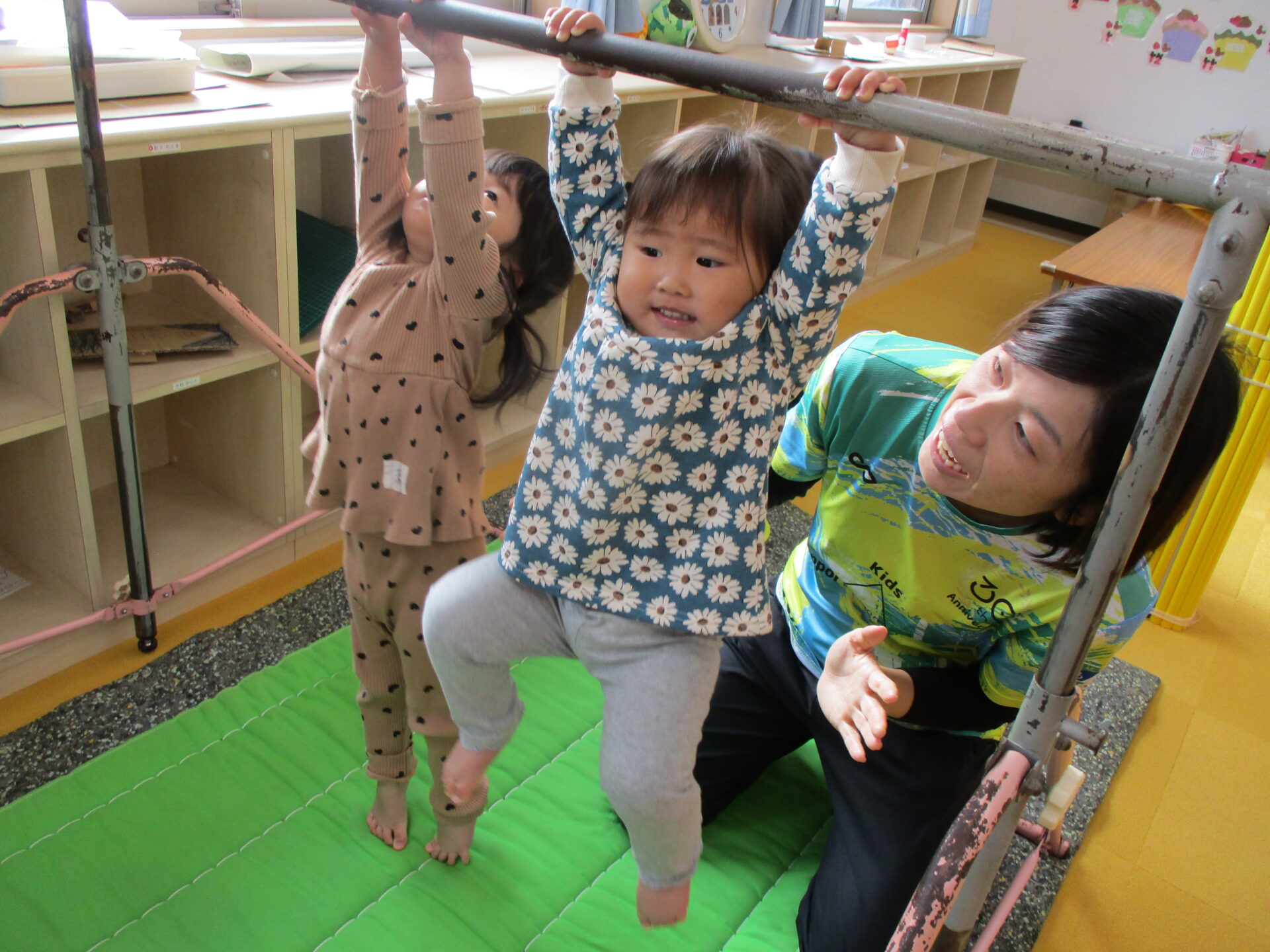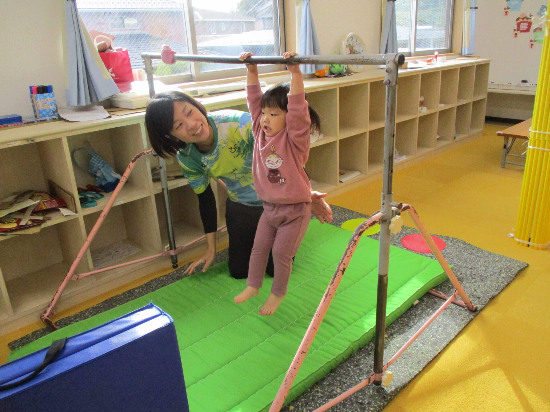鉄棒では、コーチの補助のもと、ぶら下がることができました👌