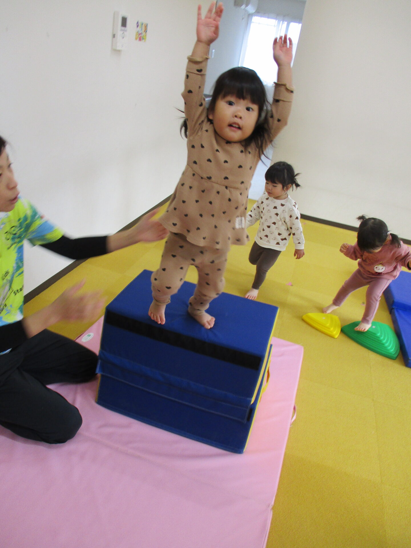 高さのある台に登ることにチャレンジ!!登れると、「やったー!!」と嬉しそうでした💕
