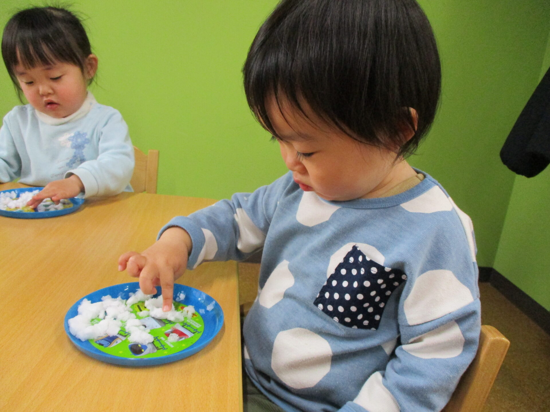保育者が器に入れて、テラスの雪を持って来ると、触りたい!!と目を輝かせます✨