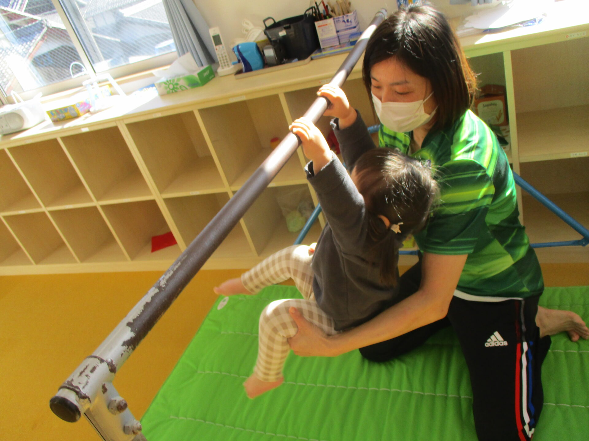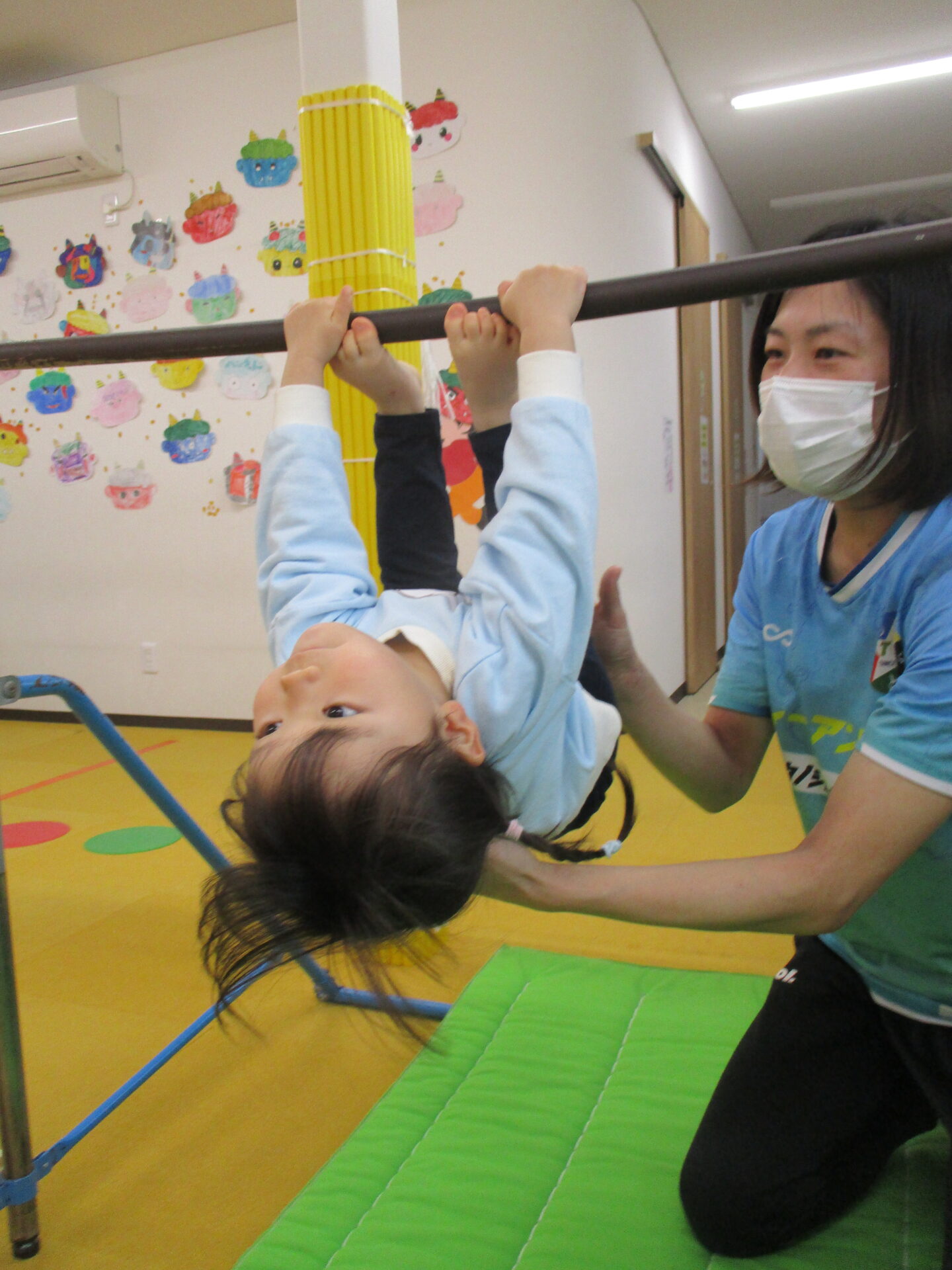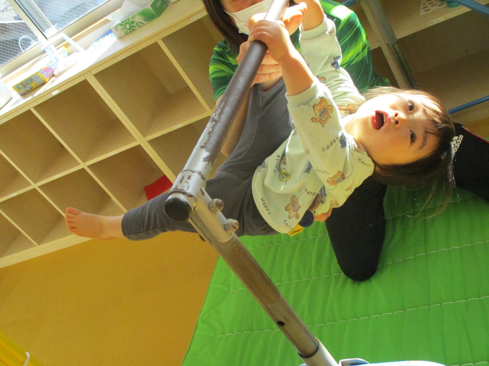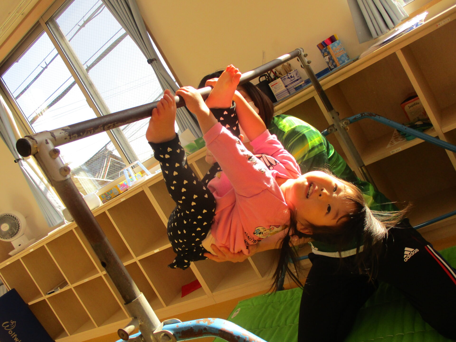 初めは恐々だった鉄棒も、この1年間で、ぶら下がったり、足をつけてみたりが出来るようになりました✨