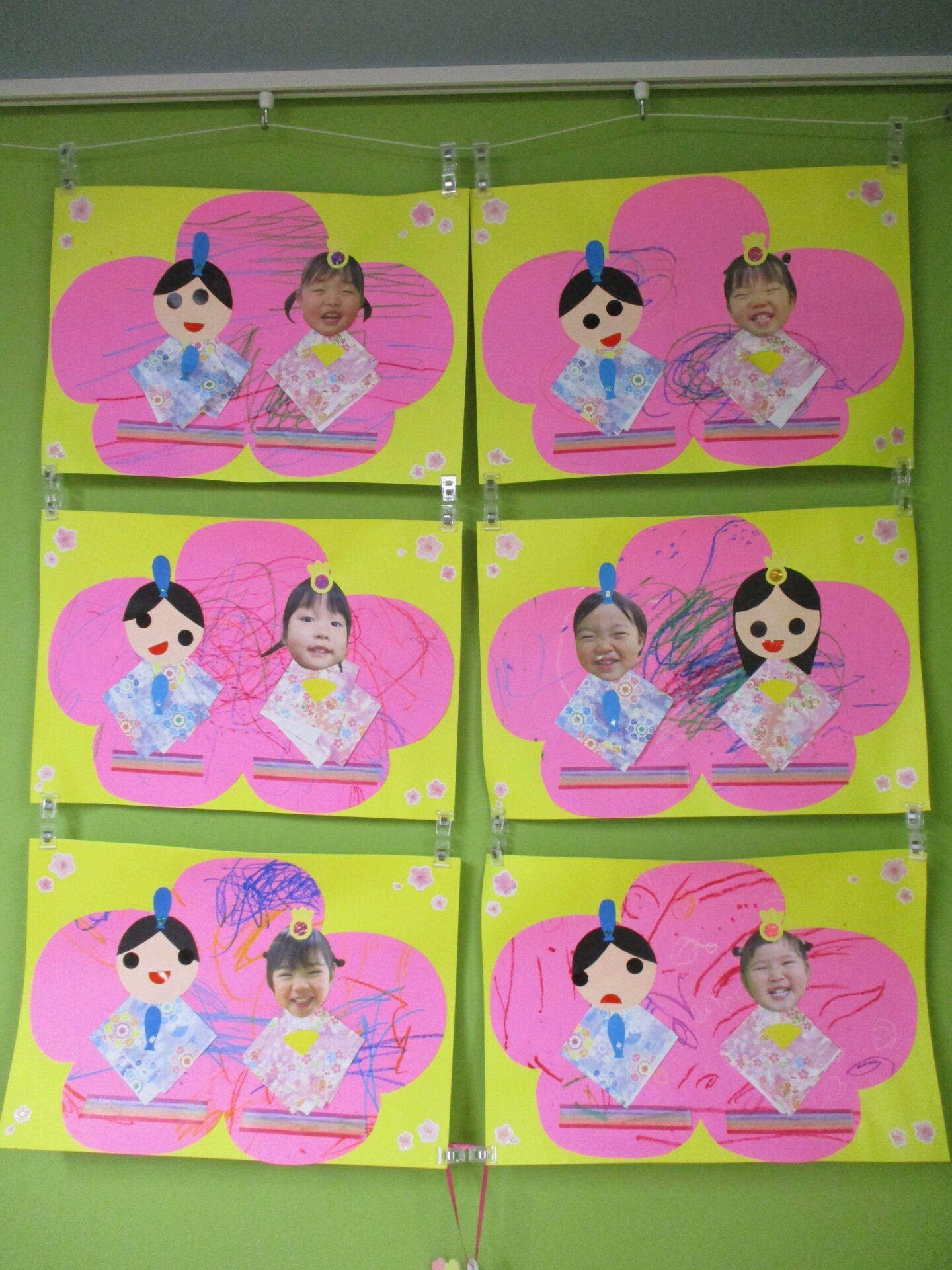 おひなさま、おだいりさまの顔をクレパスで描き、桃の花をのり貼りしています✨