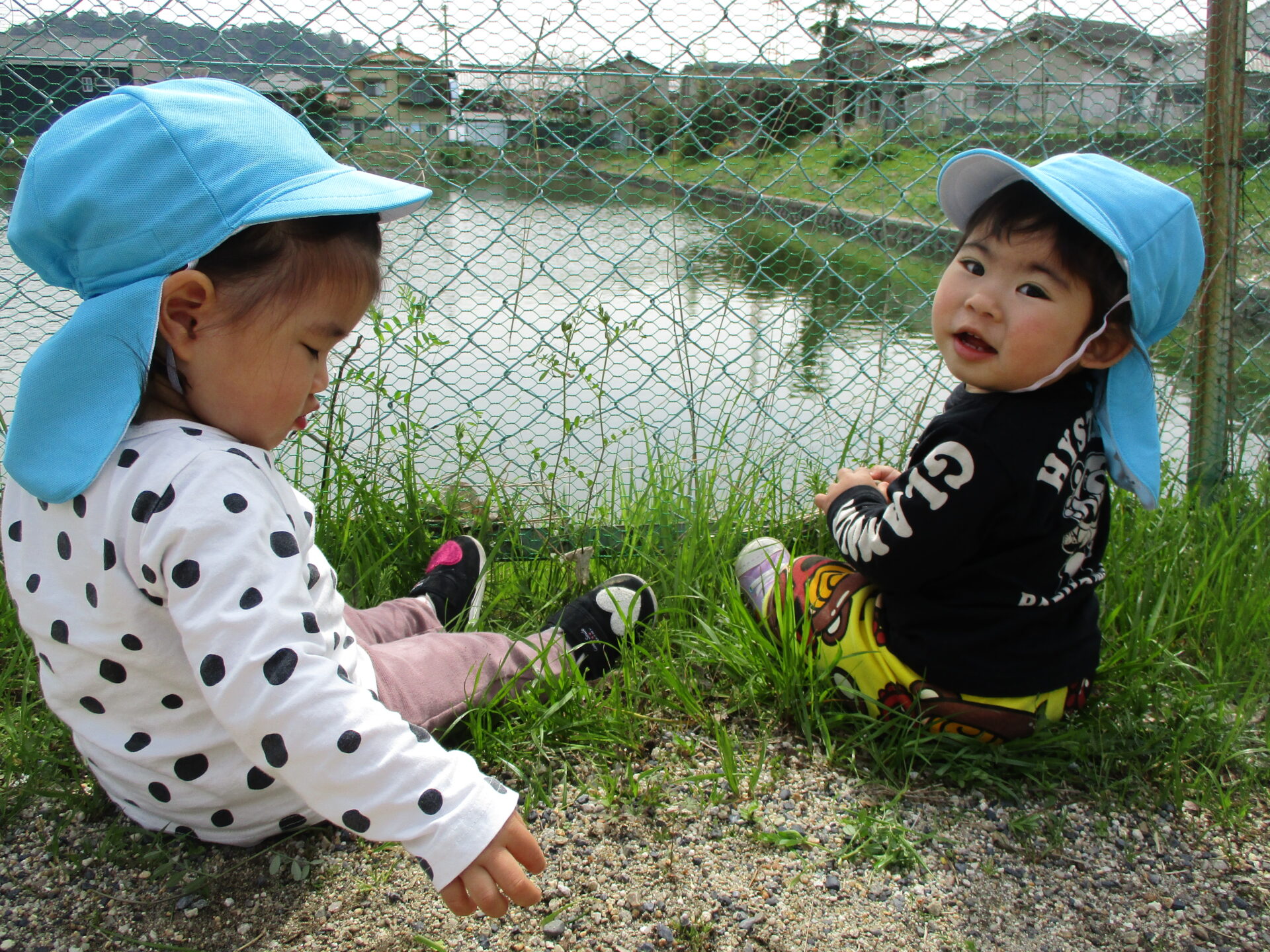 ”カメさんみえるかな??” いつもカメが日向ぼっこをしている池の前でのんびり(⌒∇⌒)