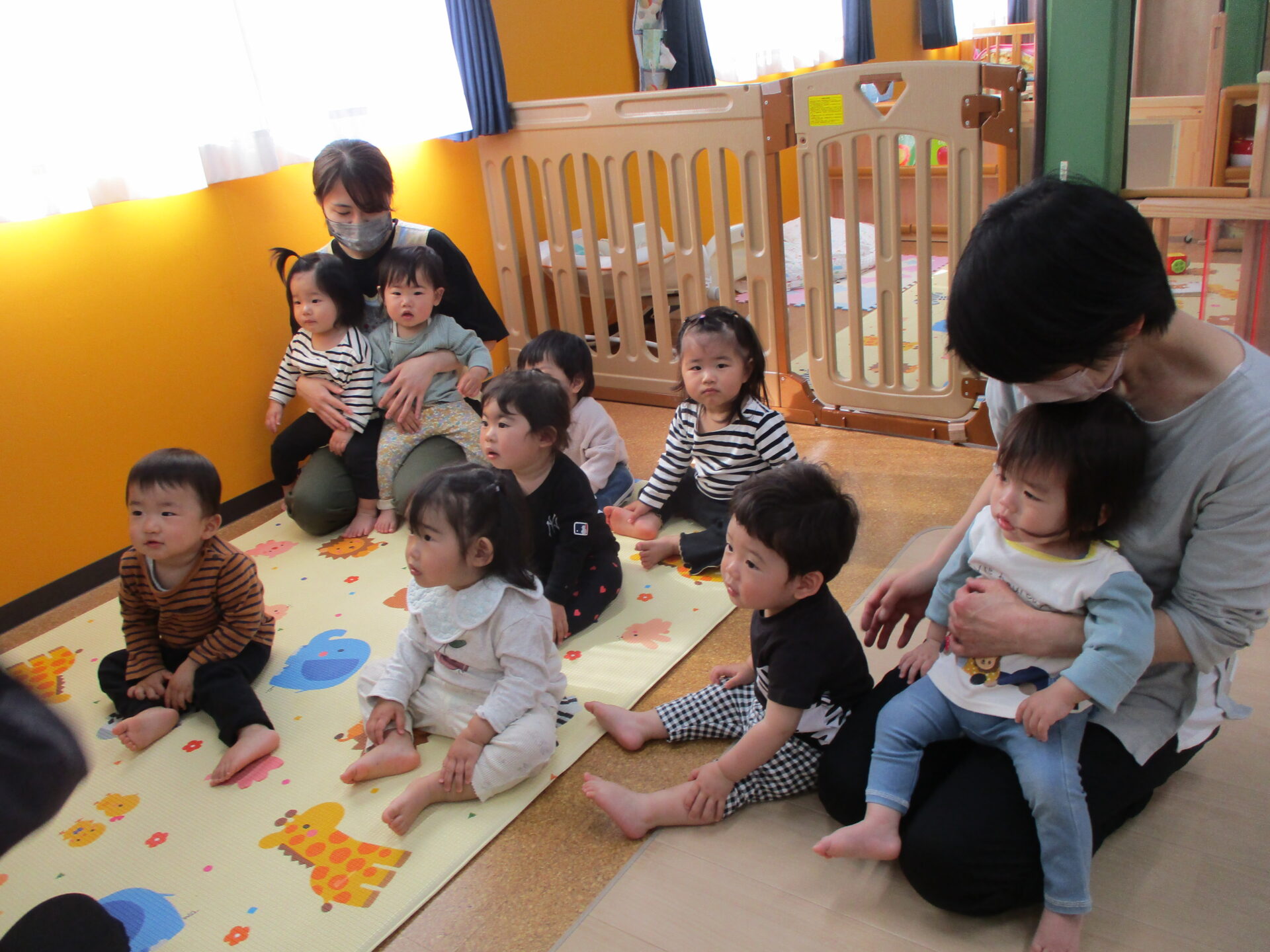 朝の会ではみんなで集まって絵本の始まりです(⌒∇⌒)
