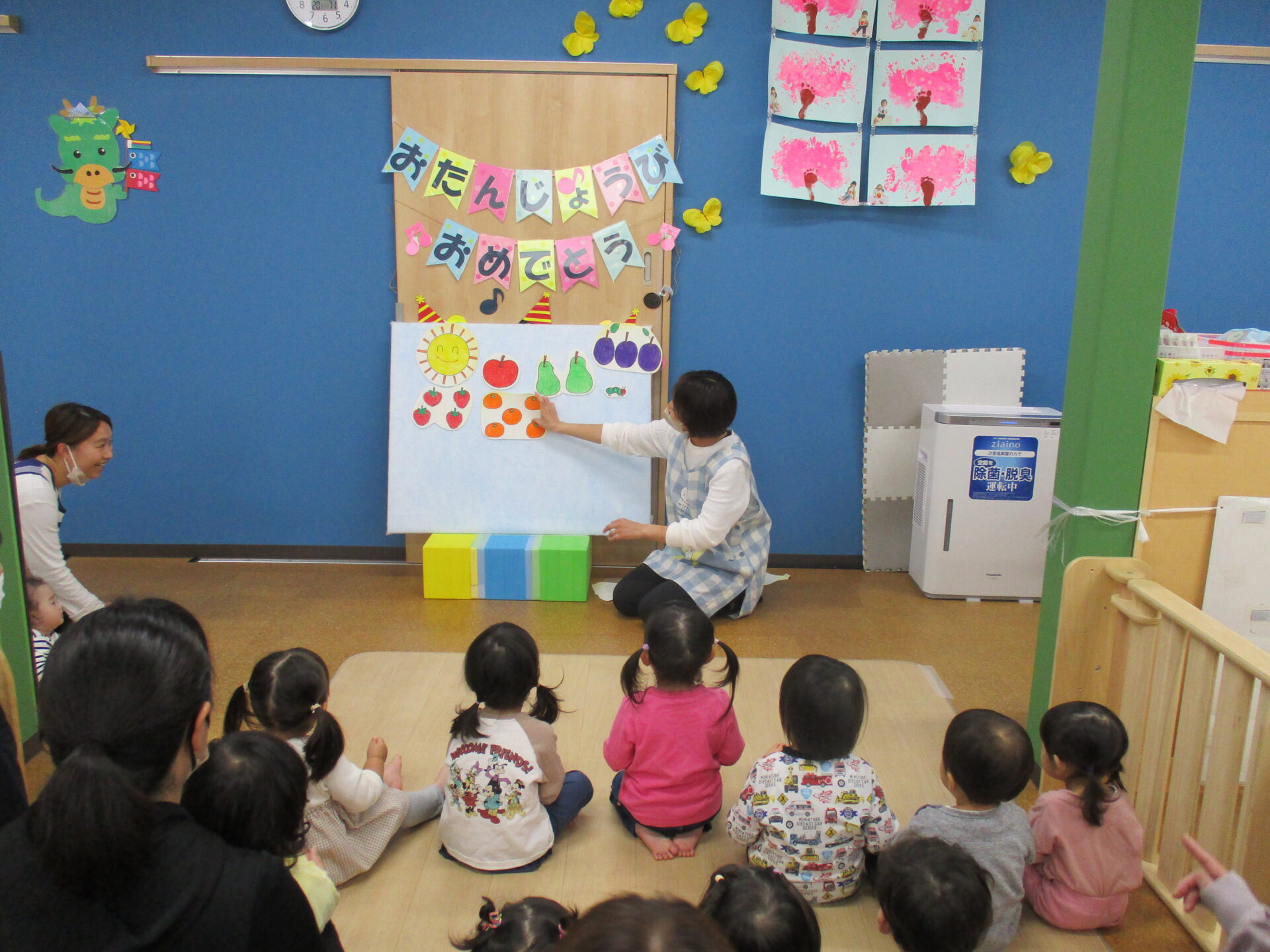 “はらペコあおむし”の歌に合わせて、次々とあおむしや様々な食べ物がパネルに貼られ、みんな釘付け💓とっても嬉しそうでした(⌒∇⌒)