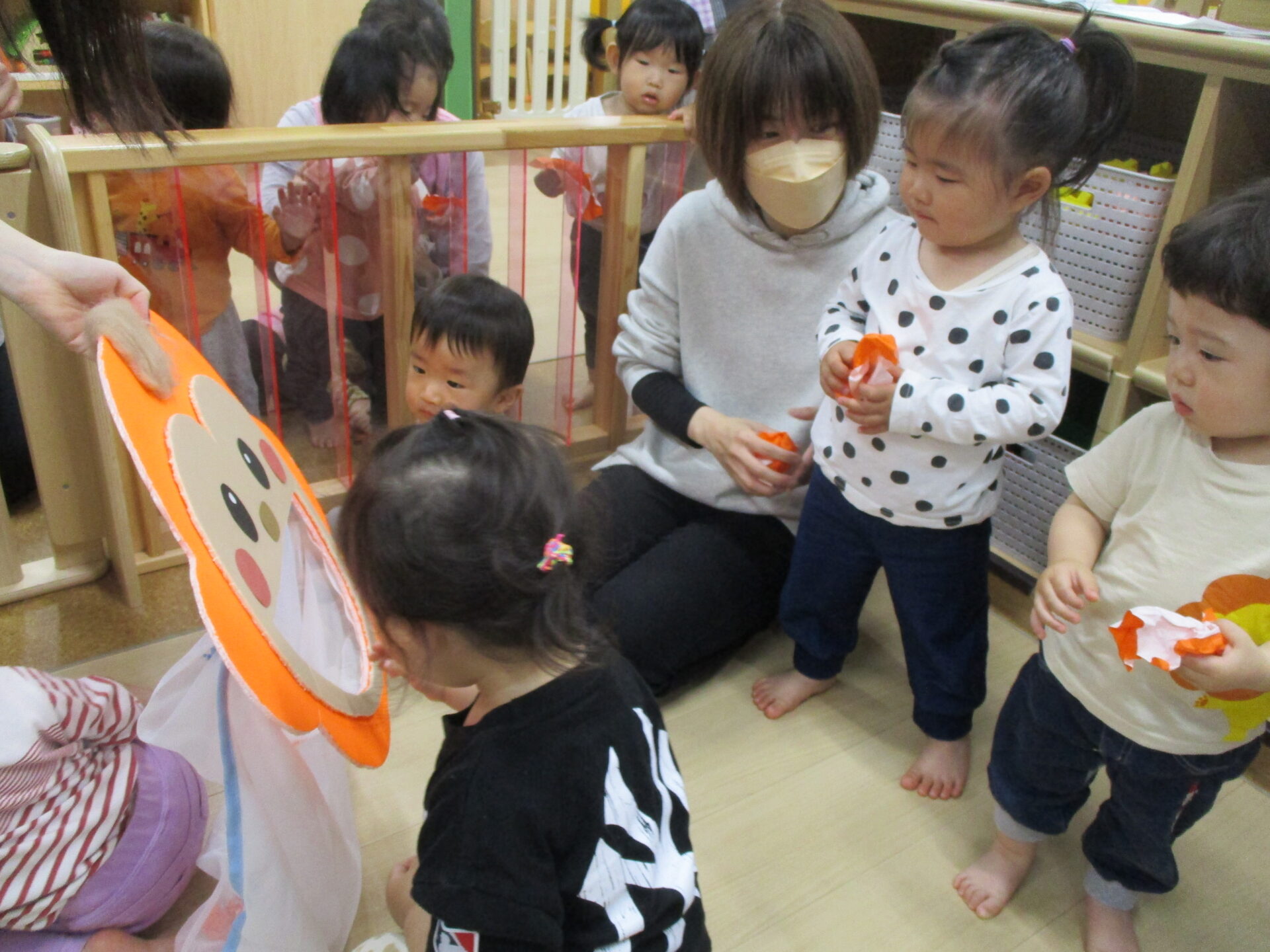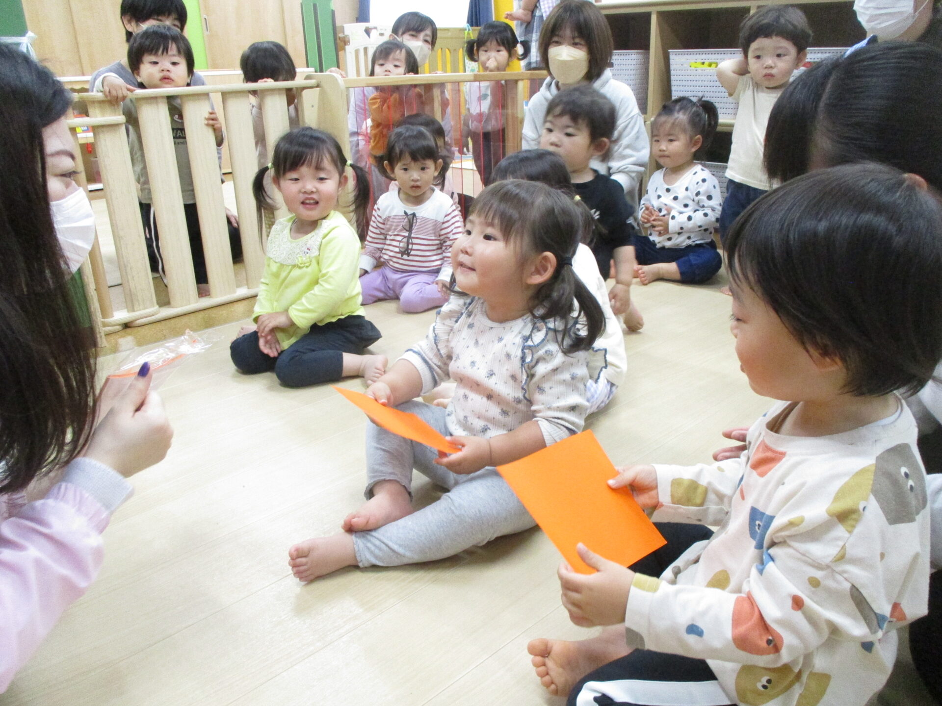 ゆめ先生が、「Here you are.(どうぞ)」と、折り紙を渡してくれ、みんなは「Thank you.(ありがとう)」とこたえます!!ドキドキした表情で、発音していました🥰