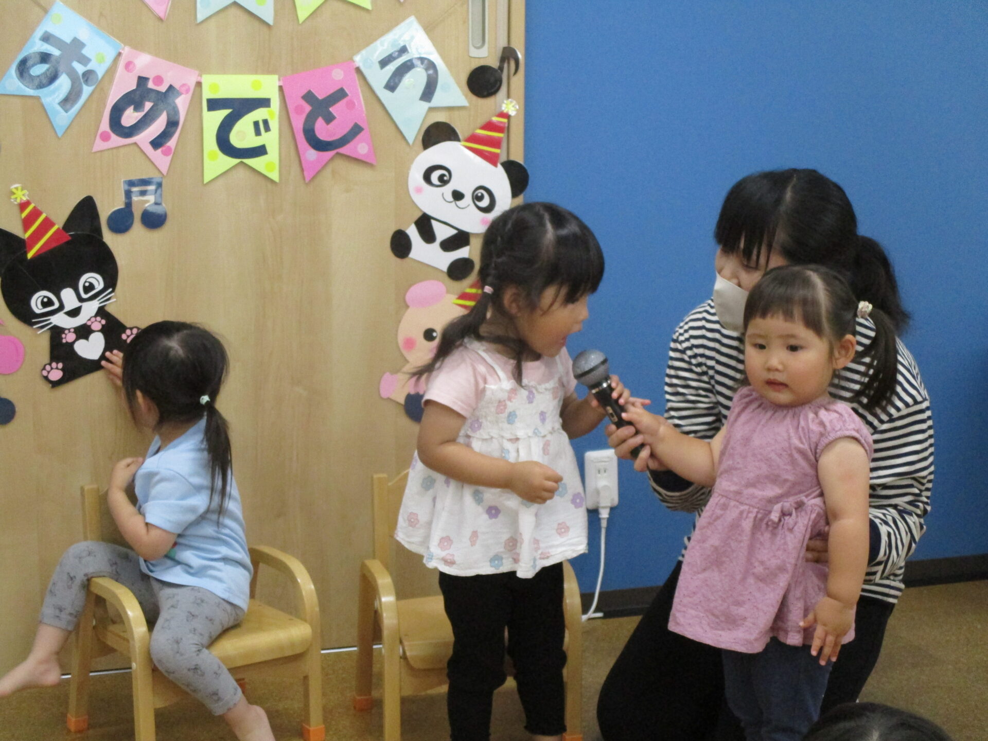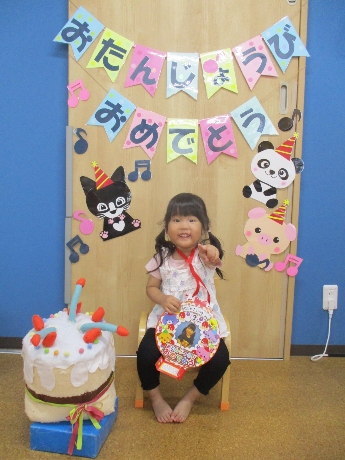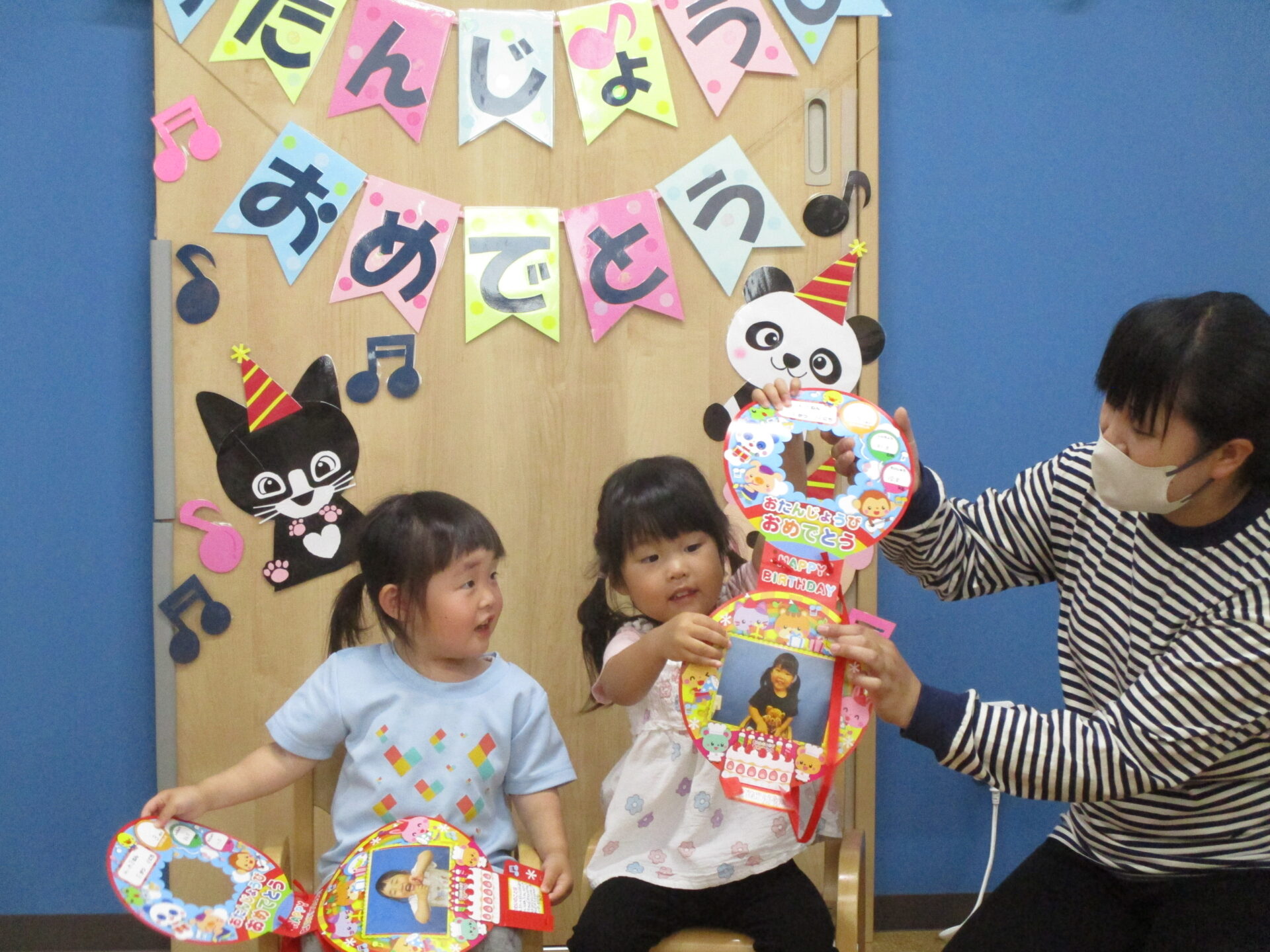 5月生まれのお友だちは、1歳児だいちチームの女の子一人と、2歳児あめチームの女の子二人です💕