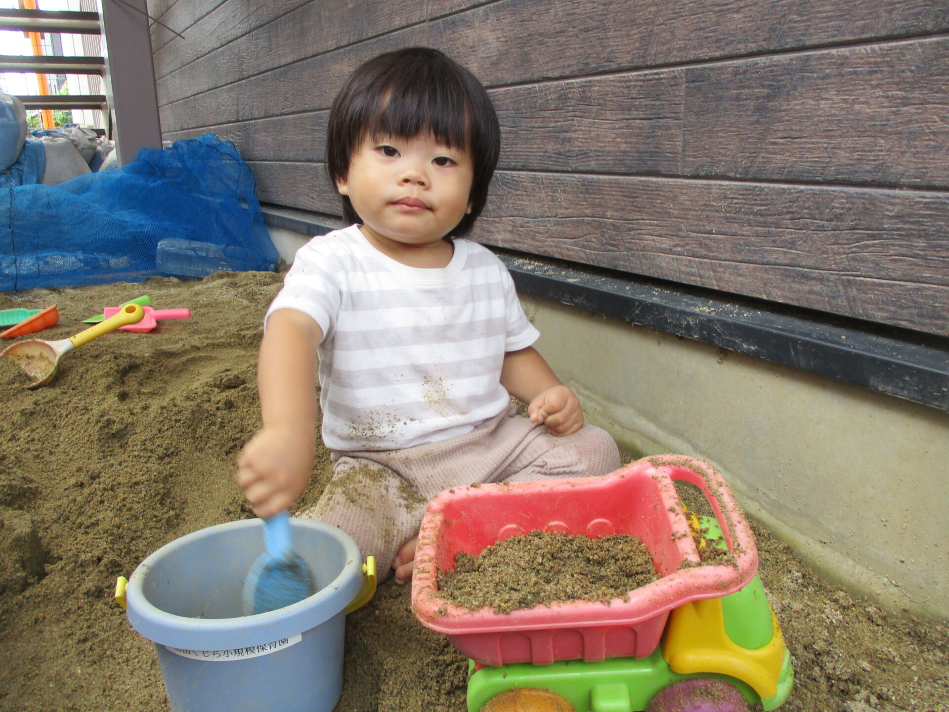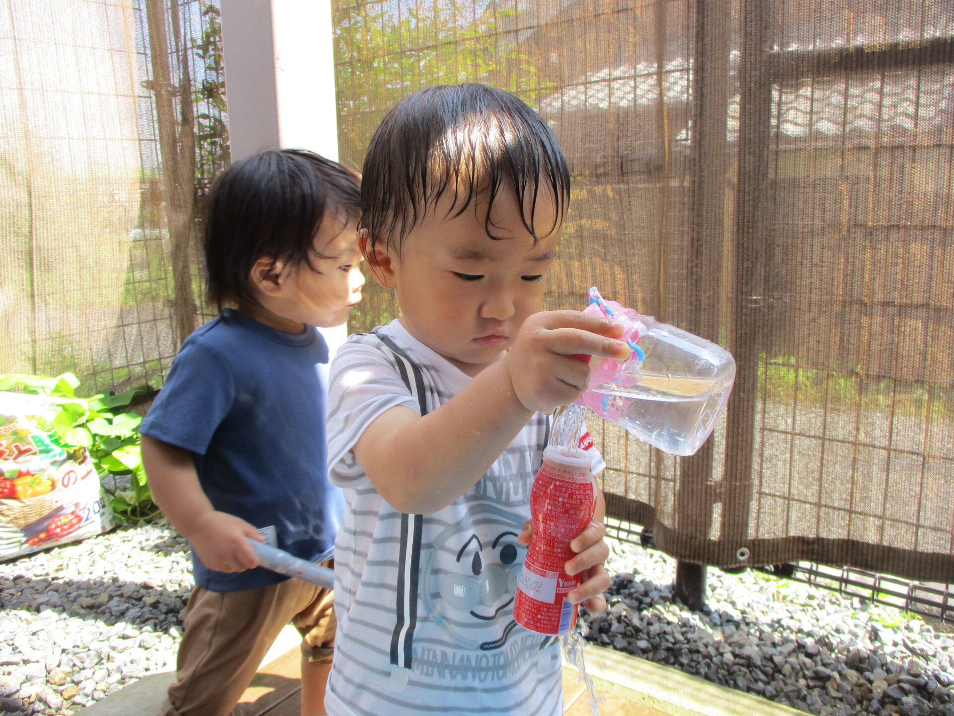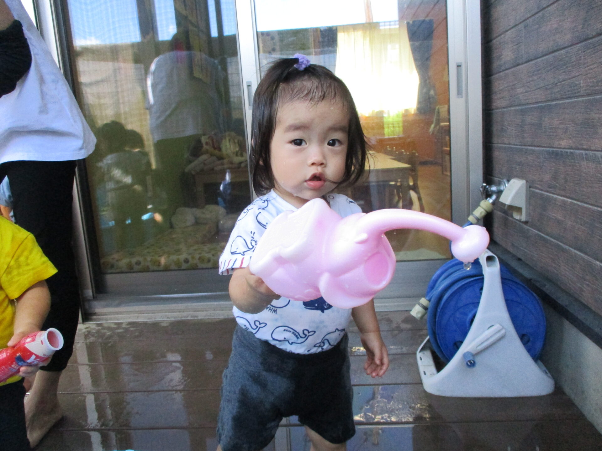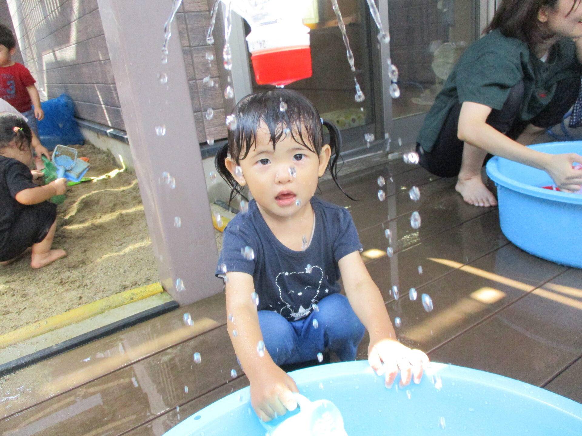 毎日、テラスで水遊びや砂遊びをし、楽しそうな笑顔が溢れています💕