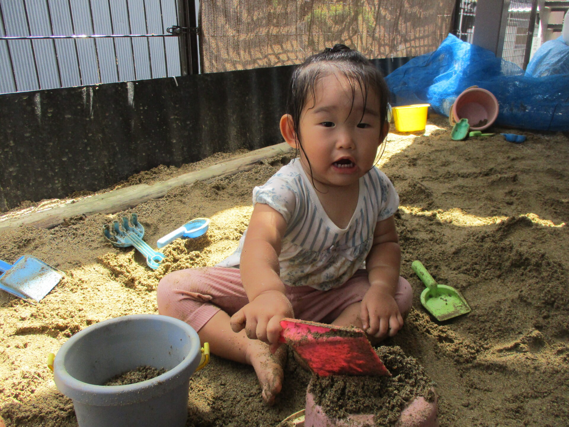 保育者が作った型抜きをスコップで崩して楽しんでいました(⌒∇⌒)形がどんどん変化する砂っておもしろいね💕