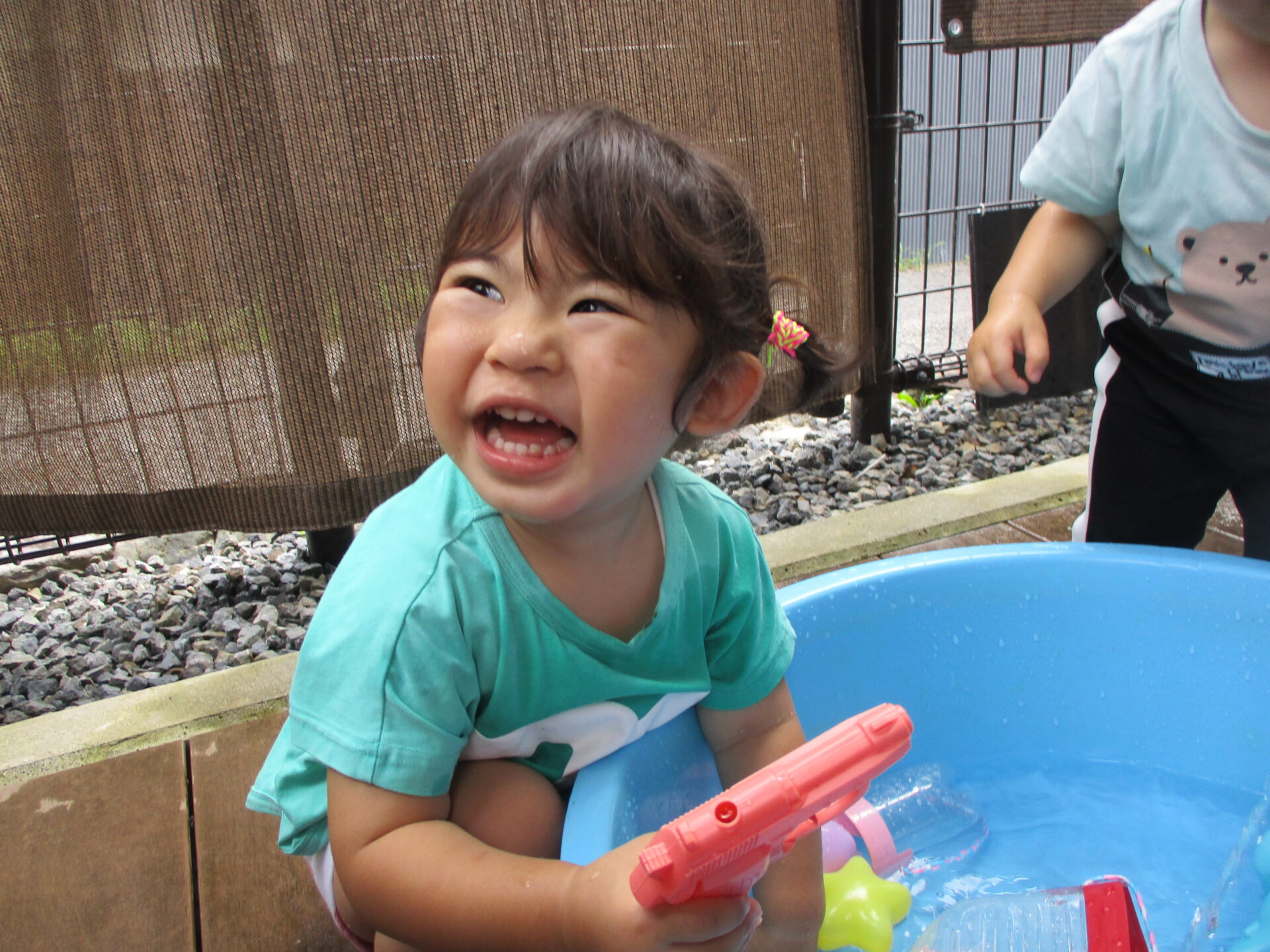 水鉄砲に夢中🥰ピュピュー!!っと水を飛ばしてこのお顔です💕