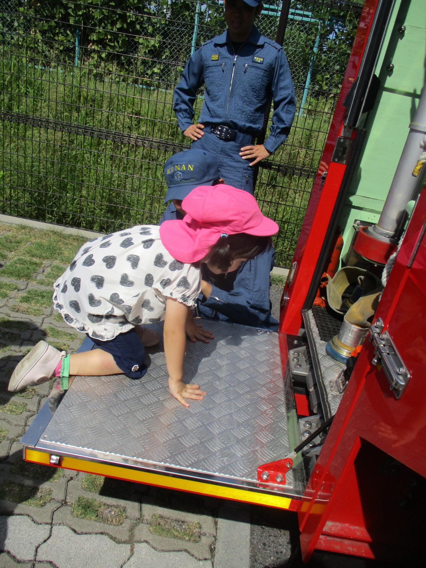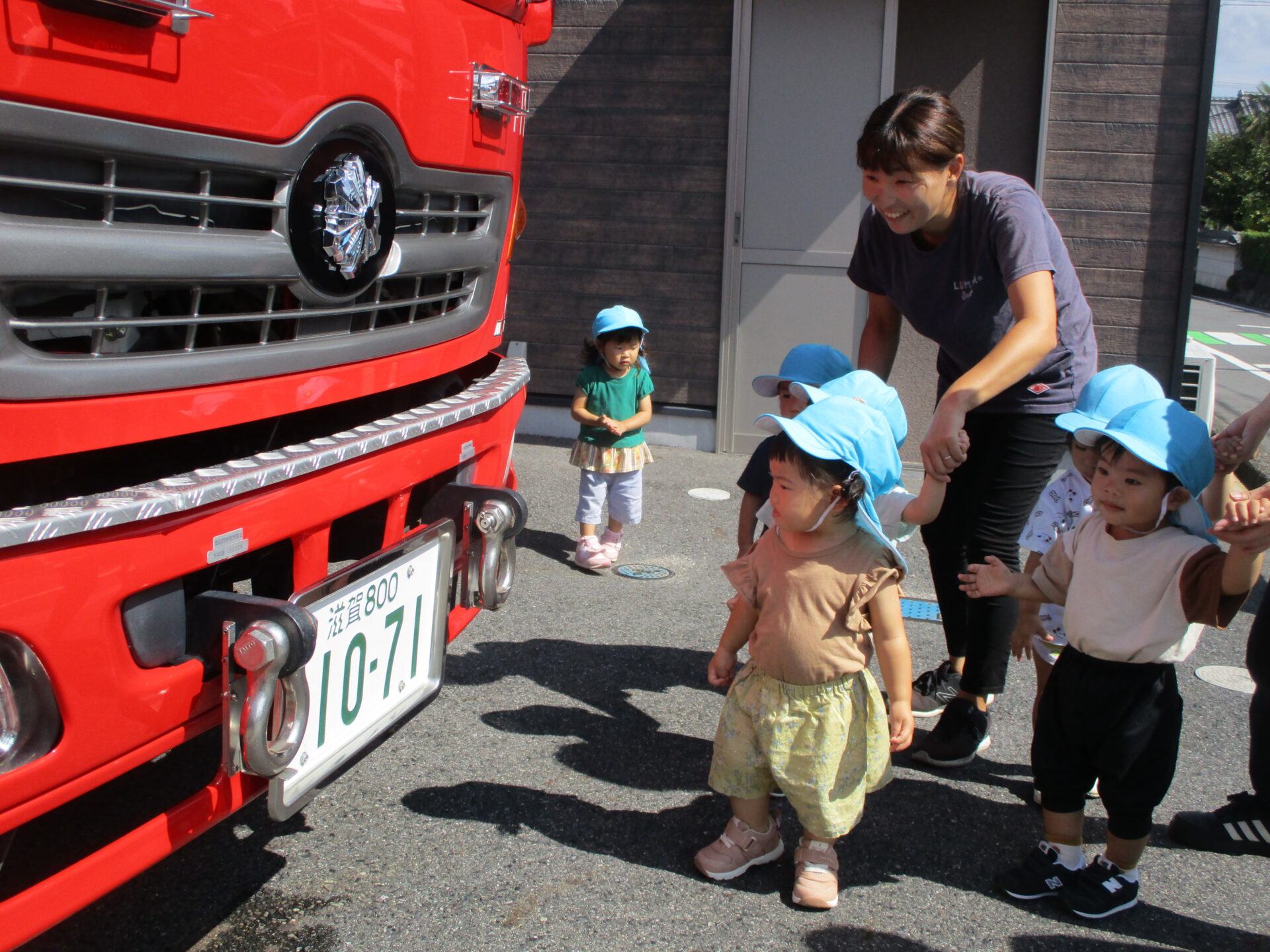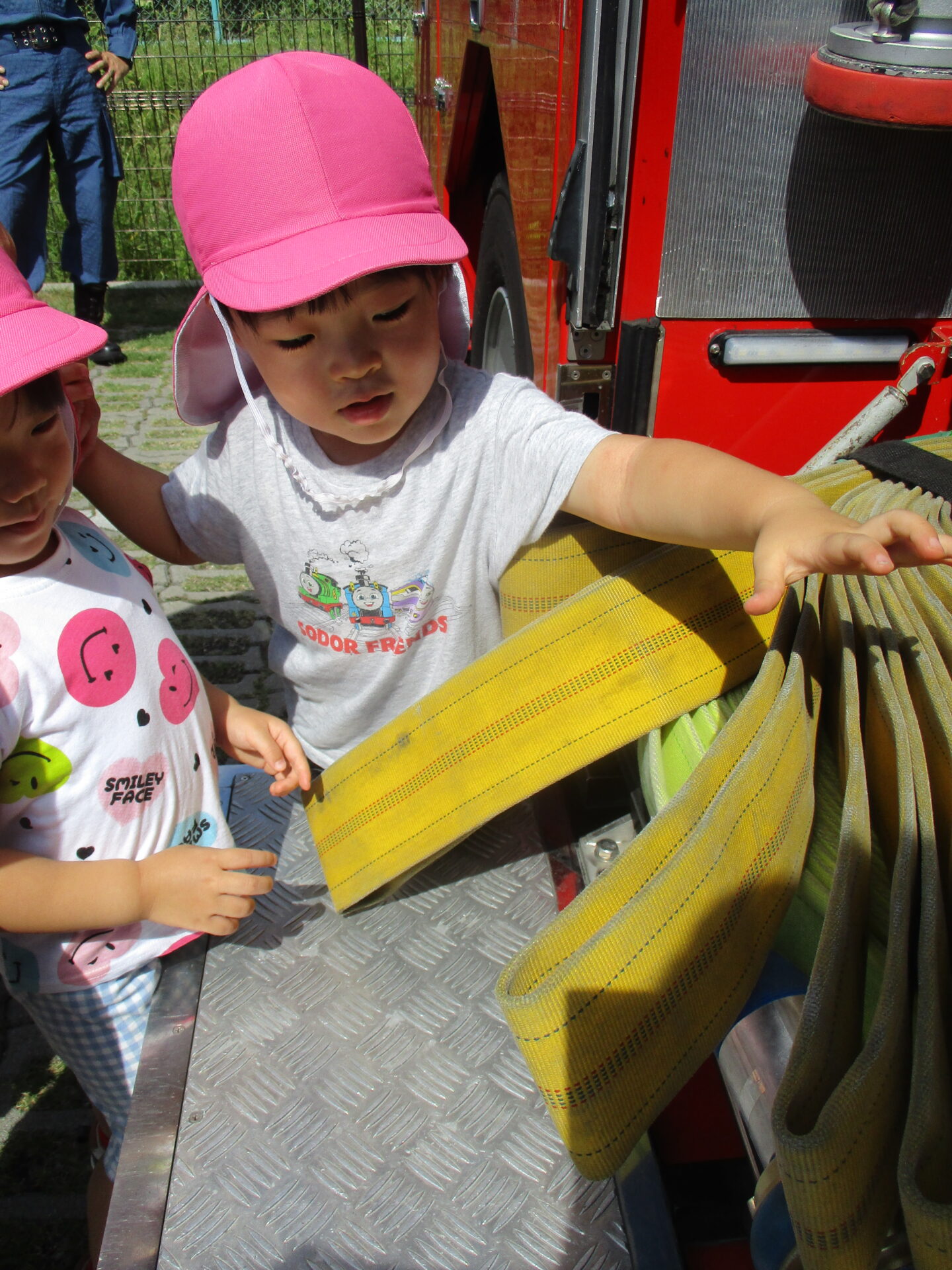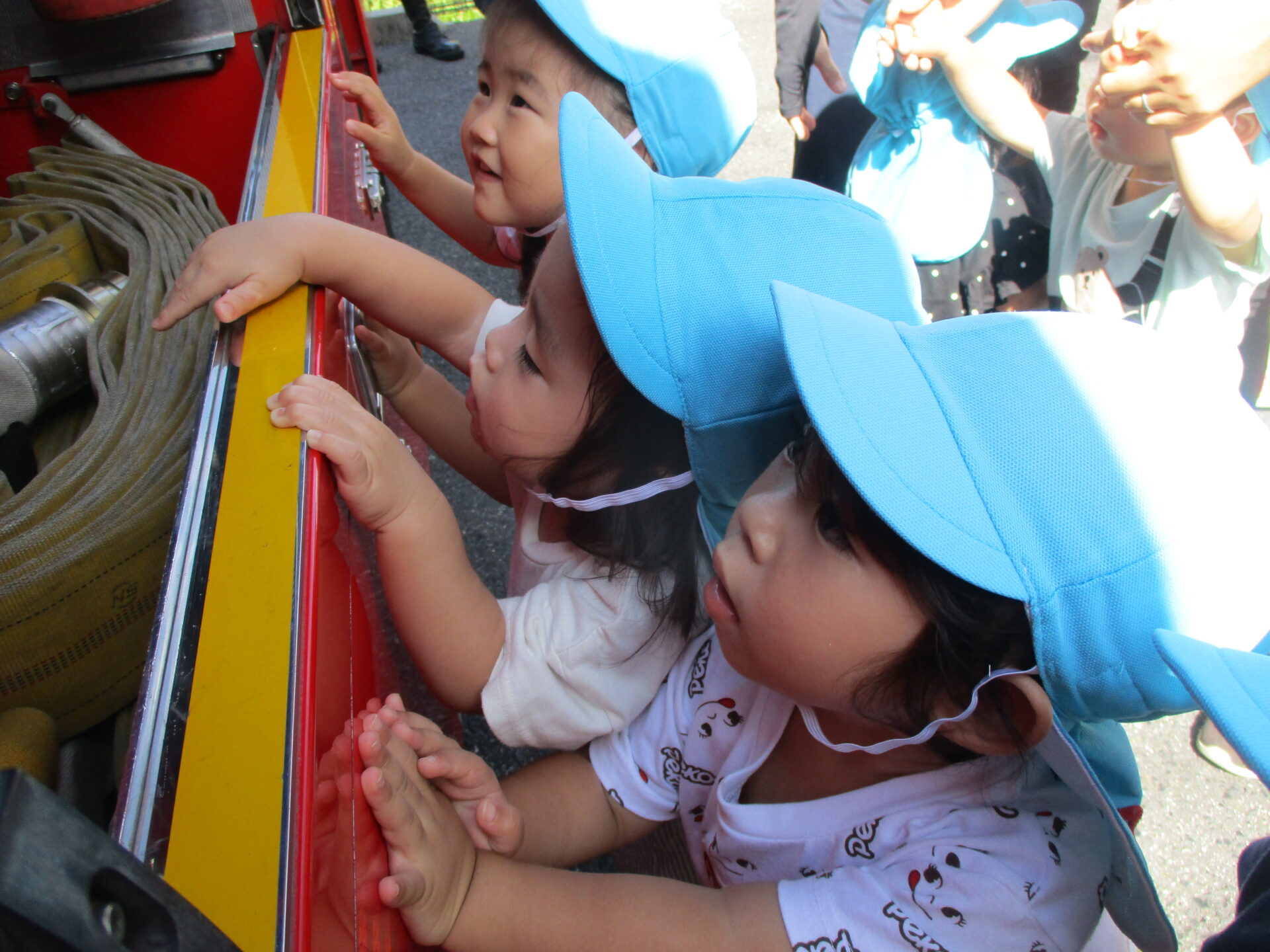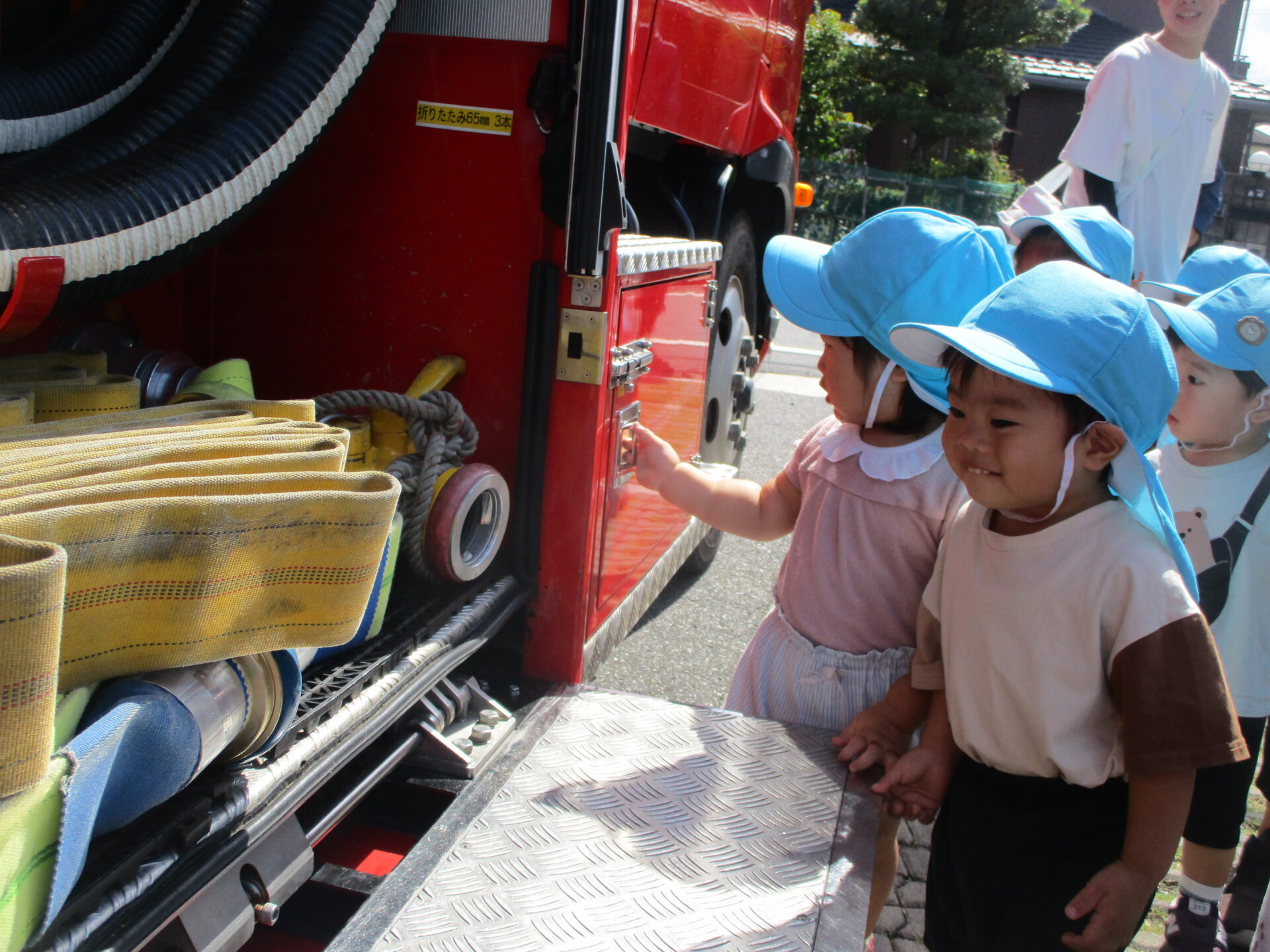 外に消防車が停まっていることに気づき、大興奮💕