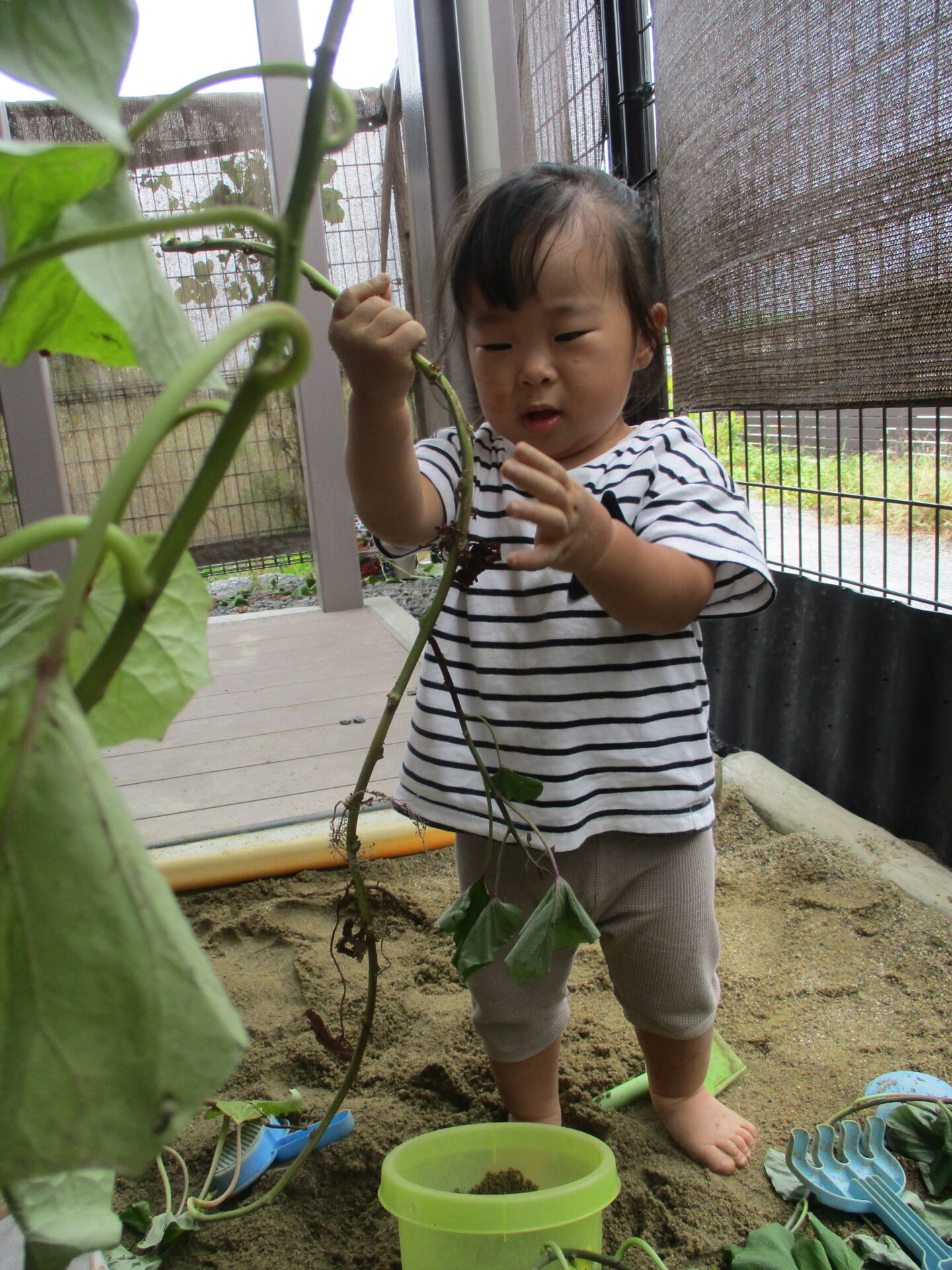 土から顔を出しているお芋を、宝物探しのように見つけては、手に取って喜んでいました(⌒∇⌒)💕