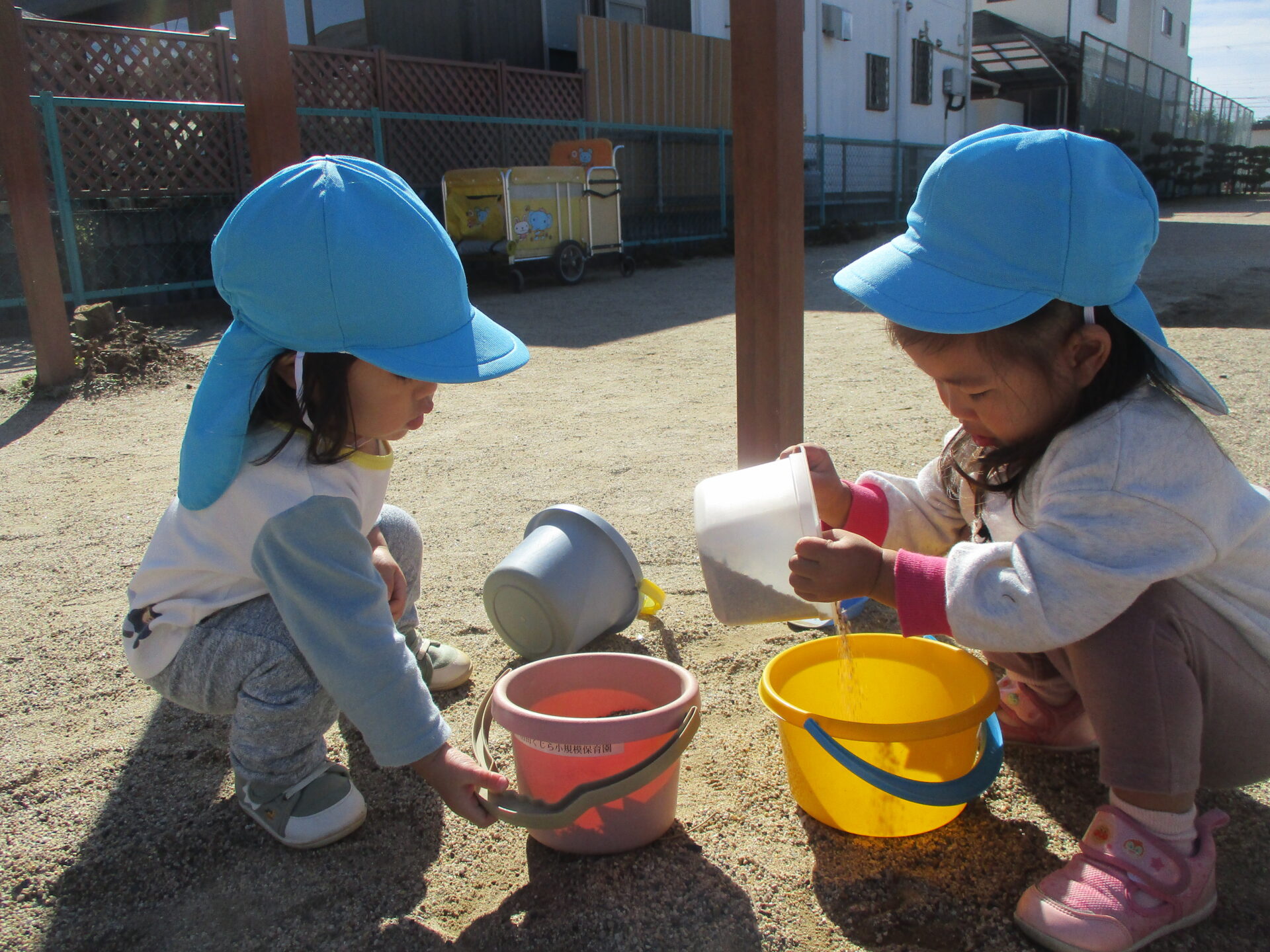 バケツに砂をジャー!!隣に並んで同じことを楽しんでいます(⌒∇⌒)💓