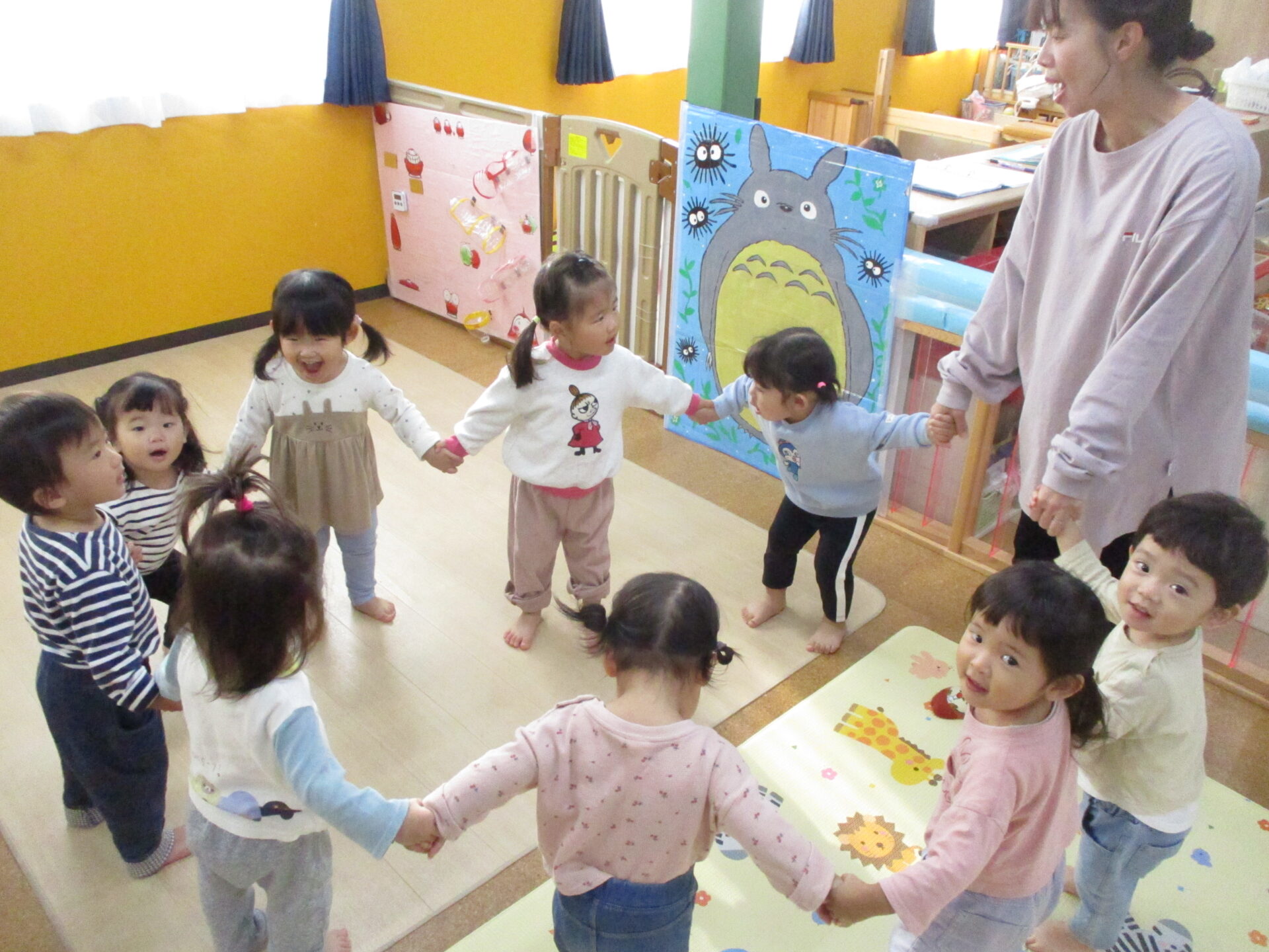 ”手をつなごう🎵”の歌声が聞こえてくると、いそいそとお友だちと手をつなぎ、顔を見合わせてニコニコ🥰保育者が間に入ると大きな円に✨みんなの顔が見渡せて嬉しそうです💖