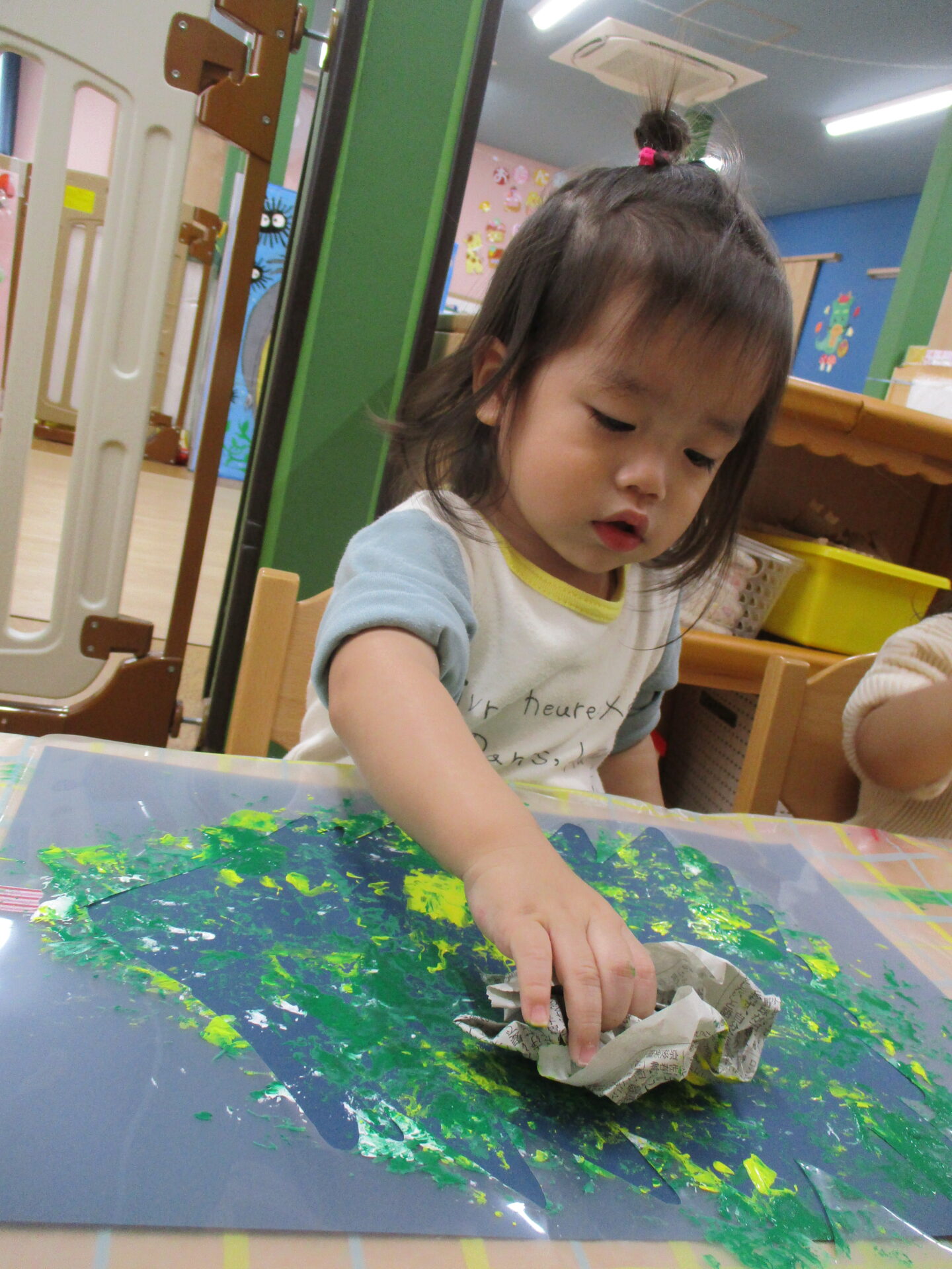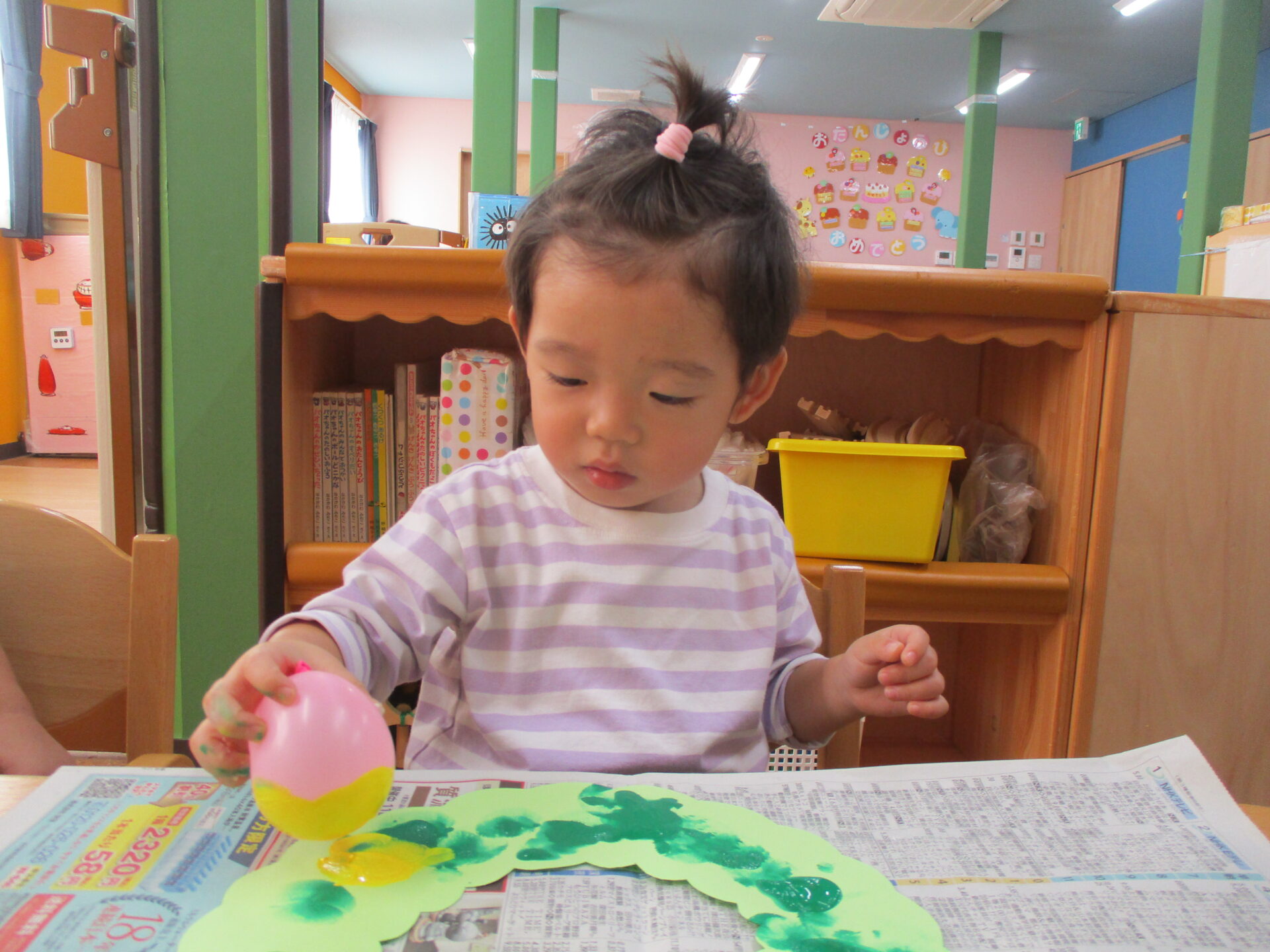 毎月様々な制作を経験してきた1歳児だいちチームのみんな(⌒∇⌒)今月は、新聞紙と風船を使ってスタンピングをしました✨