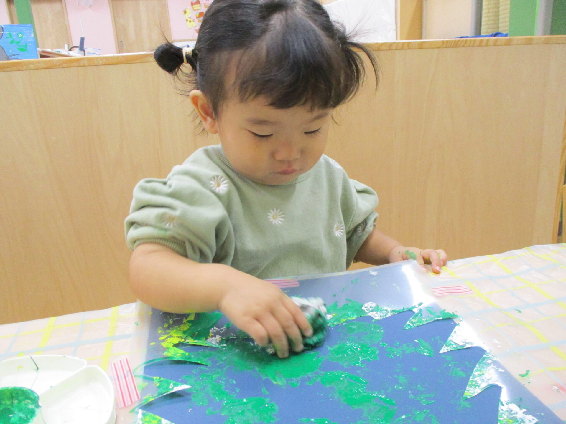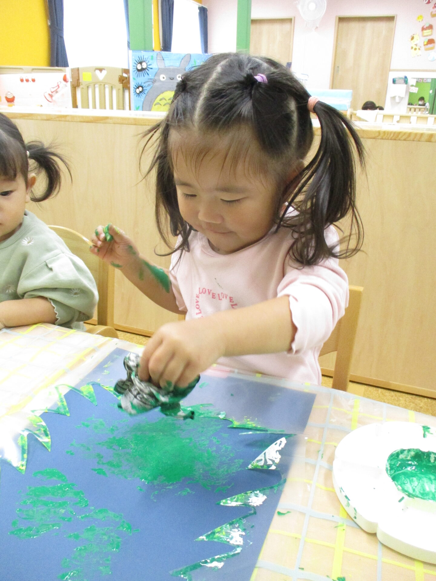 感触遊びを今まで何度も経験してきたみんなは、絵の具が手についてもへっちゃらです(⌒∇⌒)💓