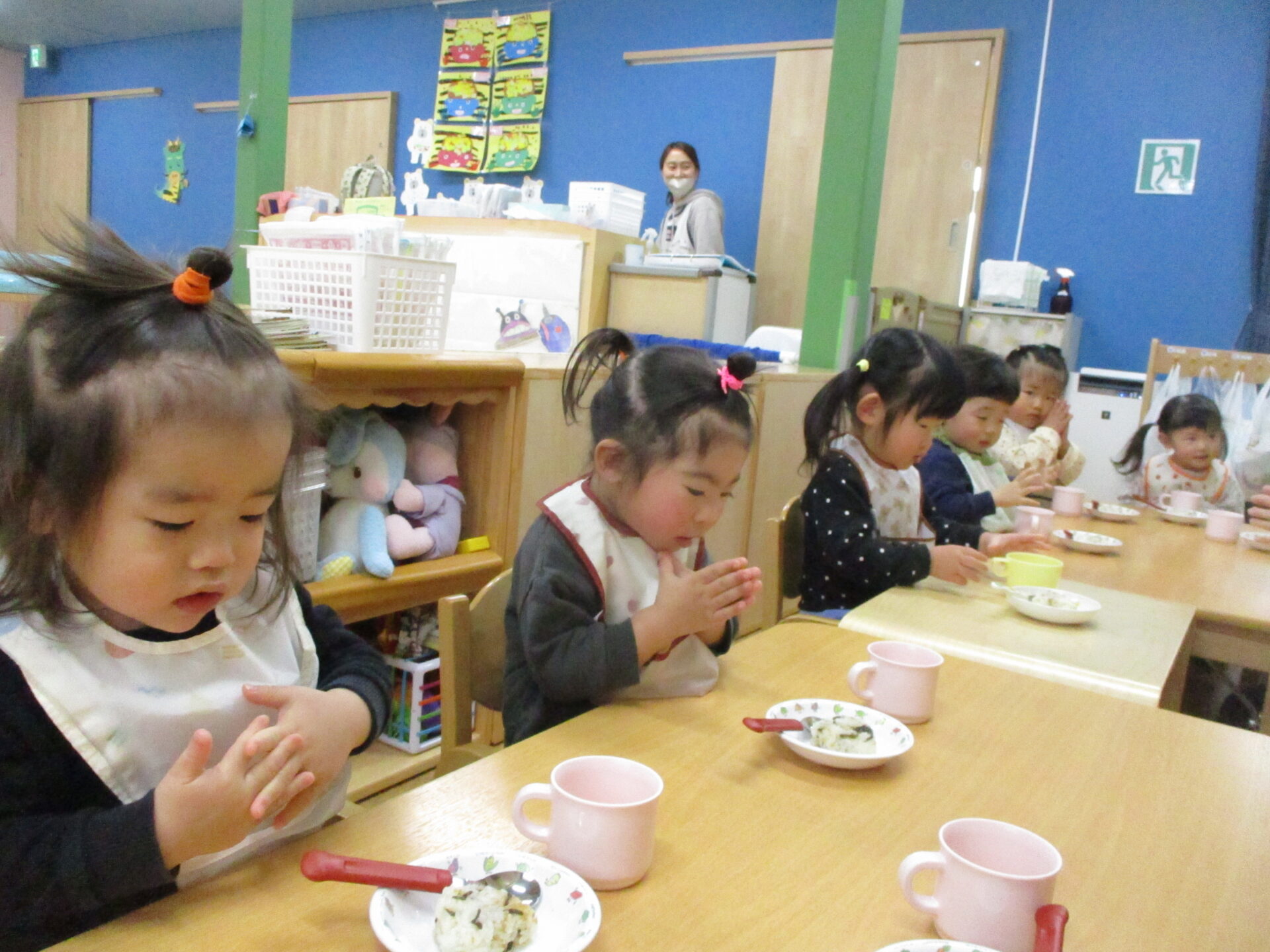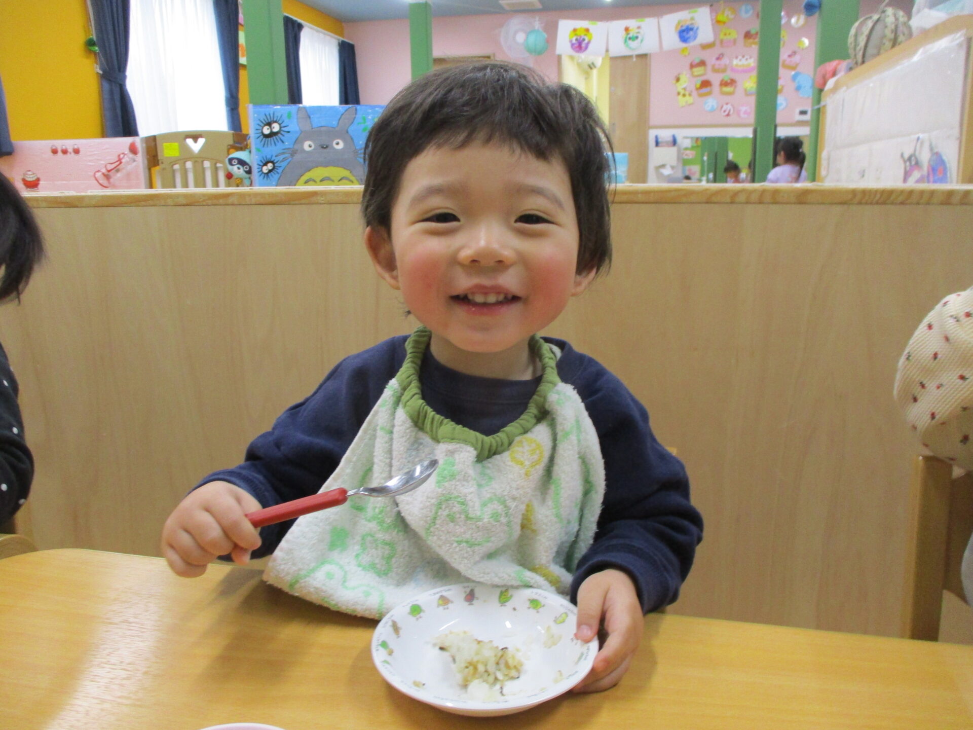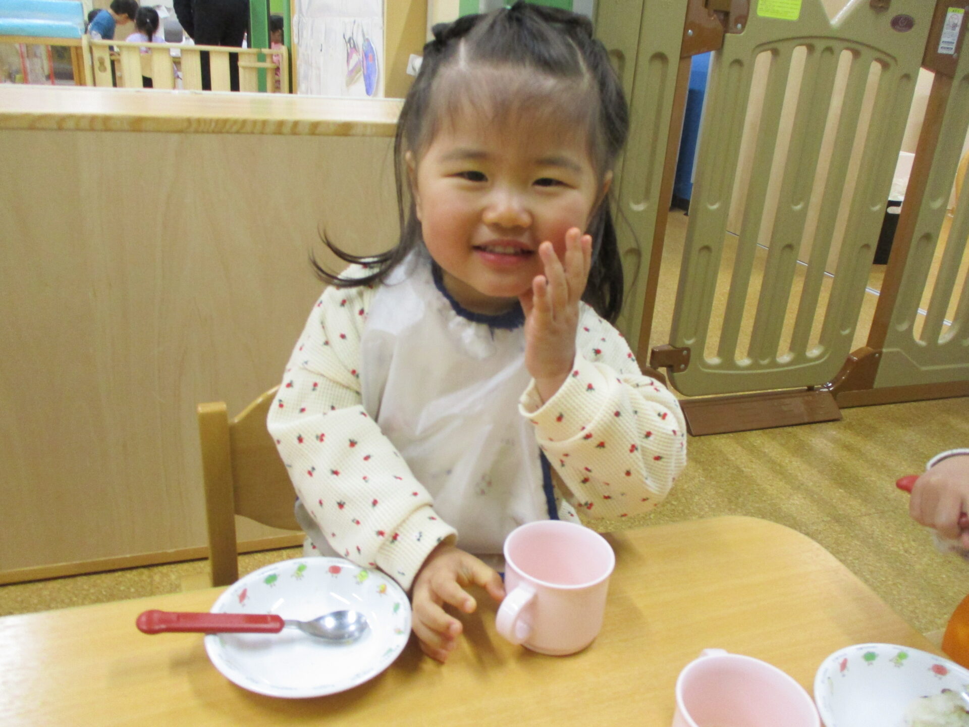 一足早く食べ終わったお友だち(⌒∇⌒)「おいしかった?」の質問に、”おいしい💓”のジェスチャーでこたえてくれました🥰