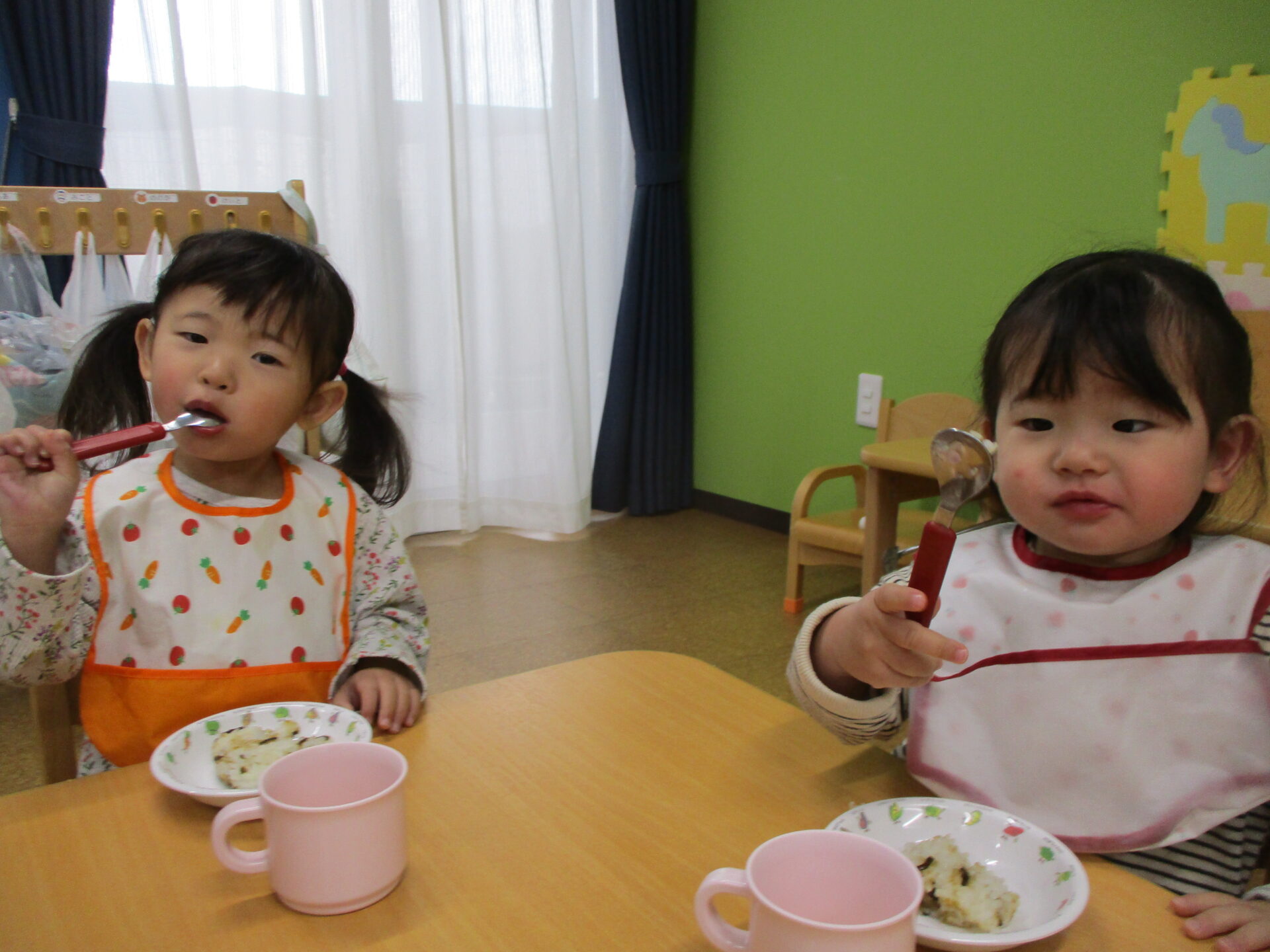 スプーンを使っているお友だちを見て、”わたしも!!”と、スプーンをもらって満足顔です(⌒∇⌒)💓